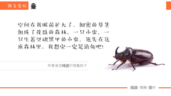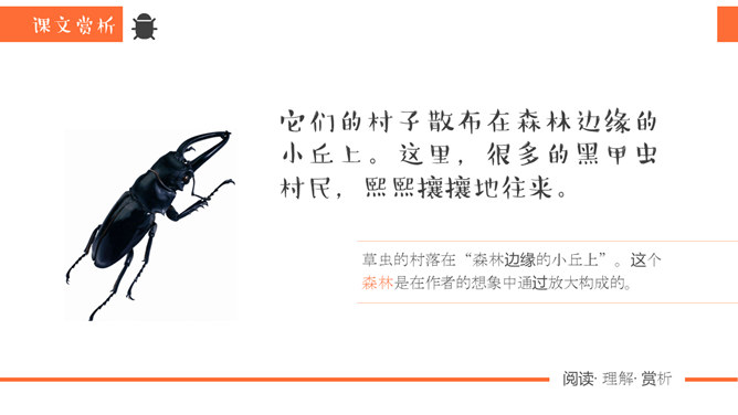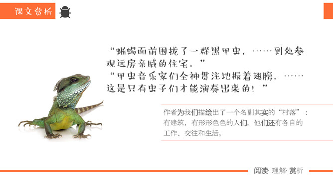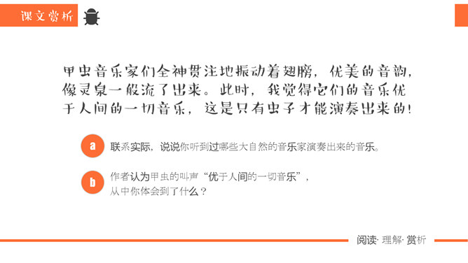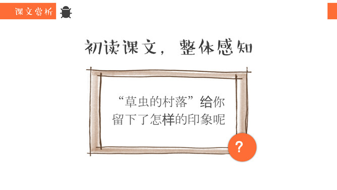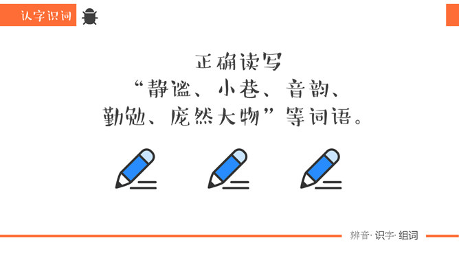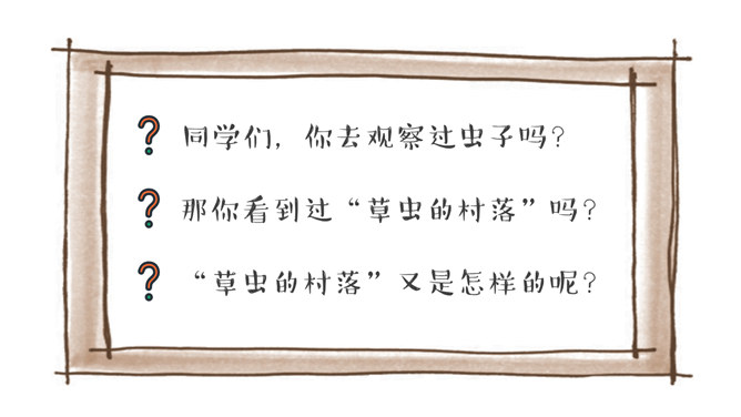 同学们,你去观察过虫子吗?那你看到过“草虫的村落”吗?“草虫的村落”又是怎样的呢?正确读写“静谧、小巷、音韵、勤勉、庞然大物”等词语。想一想还有哪些AABB的词语。说一说你听到过哪些大自然的音乐家演奏出来的音乐。听一听这是哪些昆虫的声音?