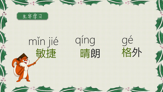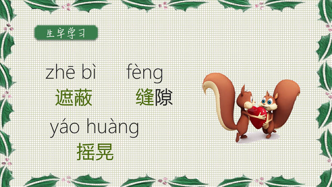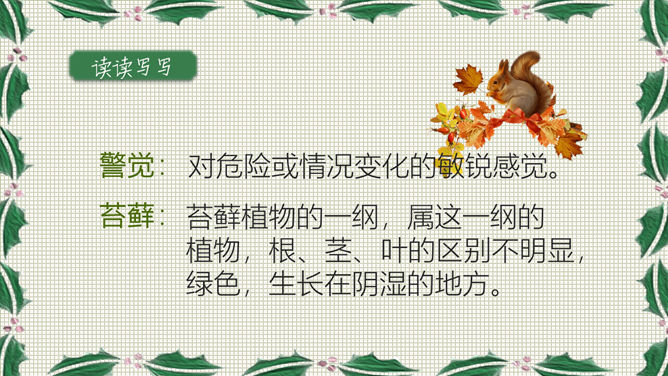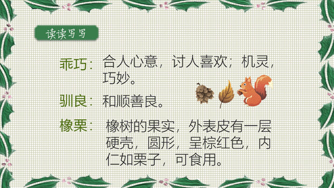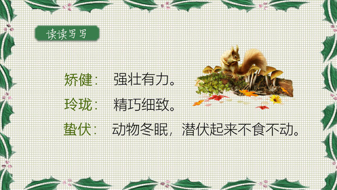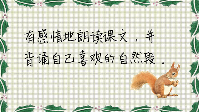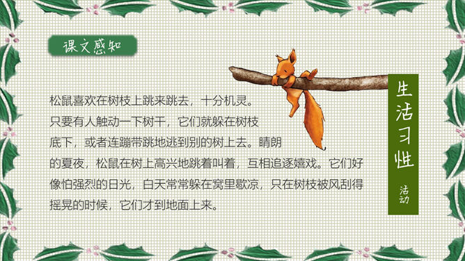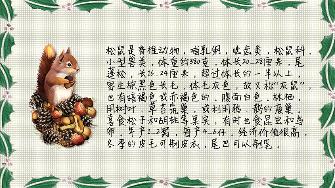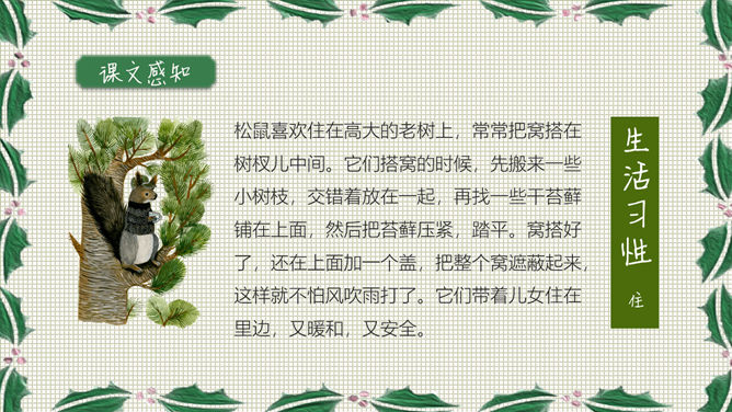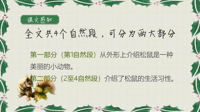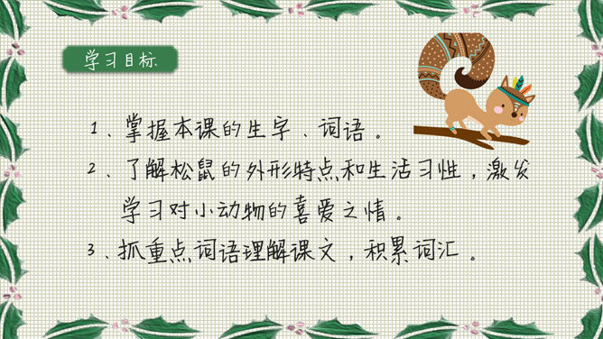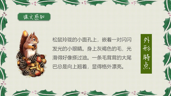 学习目标:1、掌握本课的生字、词语。2、了解松鼠的外形特点和生活习性,激发学习对小动物的喜爱之情。3、抓重点词语理解课文,积累词汇。有感情地朗读课文,并背诵自己喜欢的自然段。全文共4个自然段,可分为两大部分,第一部分(第1自然段)从外形上介绍松鼠是一种美丽的小动物。第二部分(2至4自然段)介绍了松鼠的生活习性。所属专题:松鼠ppt。