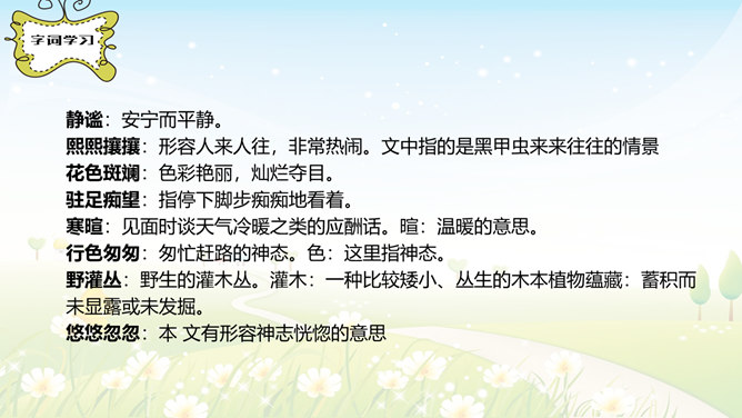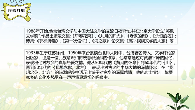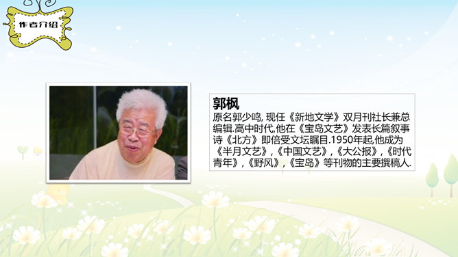 郭枫,原名郭少鸣, 现任《新地文学》双月刊社长兼总编辑.高中时代,他在《宝岛文艺》发表长篇叙事诗《北方》即倍受文坛瞩目.1950年起,他成为《半月文艺》,《中国文艺》,《大公报》,《时代青年》,《野风》,《宝岛》等刊物的主要撰稿人。静谧:安宁而平静。熙熙攘攘:形容人来人往,非常热闹。文中指的是黑甲虫来来往往的情景。花色斑斓:色彩艳丽,灿烂夺目。驻足痴望:指停下脚步痴痴地看着。寒暄:见面时谈天气冷暖之类的应酬话。暄:温暖的意思。行色匆匆:匆忙赶路的神态。色:这里指神态。野灌丛:野生的灌木丛。灌木:一种比较矮小、丛生的木本植物蕴藏:蓄积而未显露或未发掘。悠悠忽忽:本 文有形容神志恍惚的意思。