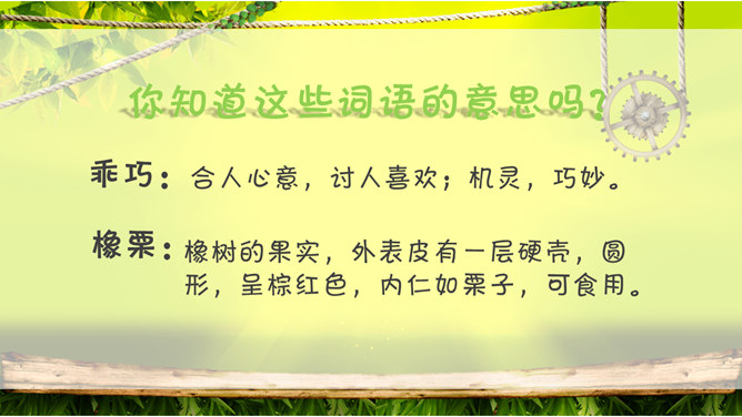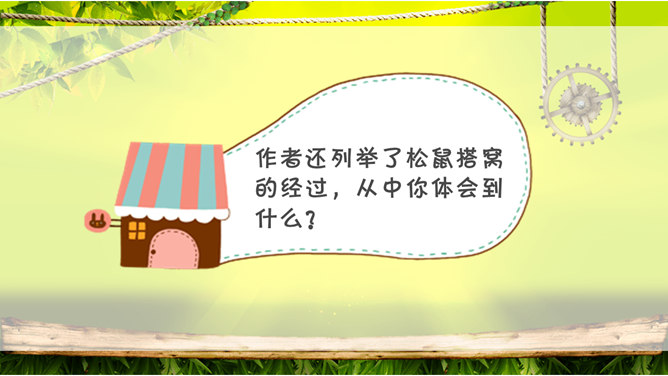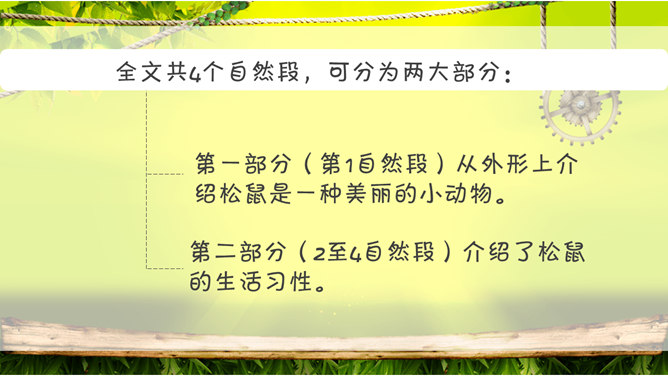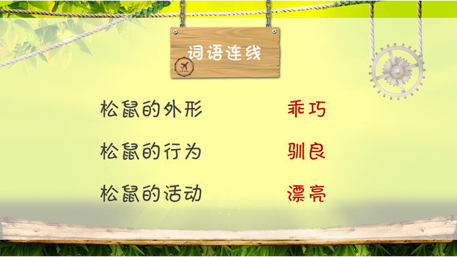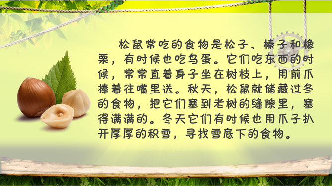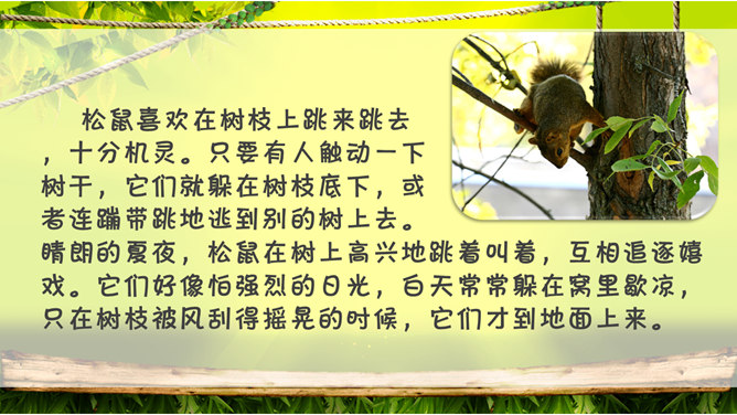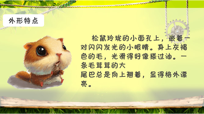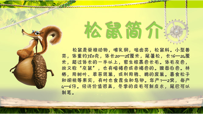 松鼠是脊椎动物,哺乳纲,啮齿类,松鼠科。小型兽类,体重约380克,体长20—28厘米,尾蓬松,长16—24厘米,超过体长的一半以上,密生棕黑色长毛。体毛灰色,故又称“灰鼠”,也有暗褐色或赤褐色的。腹面白色。林栖,用树叶、草苔筑巢,或利用鸦、鹊的废巢。喜食松子和胡桃等果实,有时也食昆虫和鸟卵。年产1—2窝,每产4—6仔。经济价值很高,冬季的皮毛可制皮衣,尾巴可以制笔。乖巧:合人心意,讨人喜欢;机灵,巧妙。橡栗:橡树的果实,外表皮有一层硬壳,圆形,呈棕红色,内仁如栗子,可食用。 蛰伏:动物冬眠,潜伏起来不食不动。 警觉:对危险或情况变化的敏锐感觉。 苔藓:苔藓植物的一纲,属这一纲的植物,根、茎、叶的区别不明显,绿色,生长在阴湿的地方。所属专题:松鼠ppt。