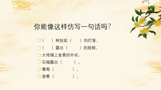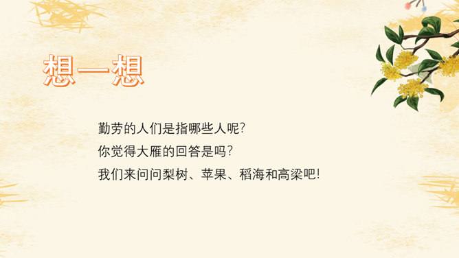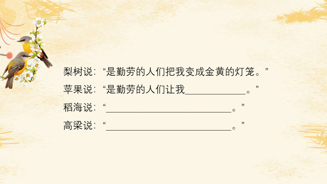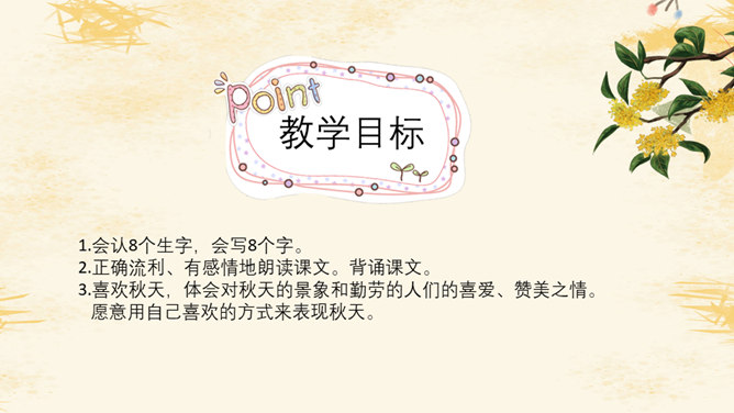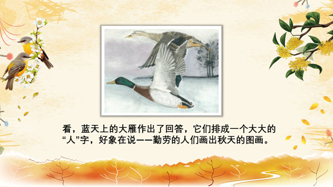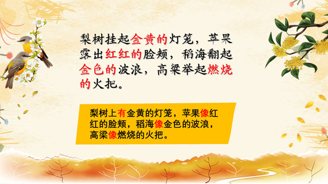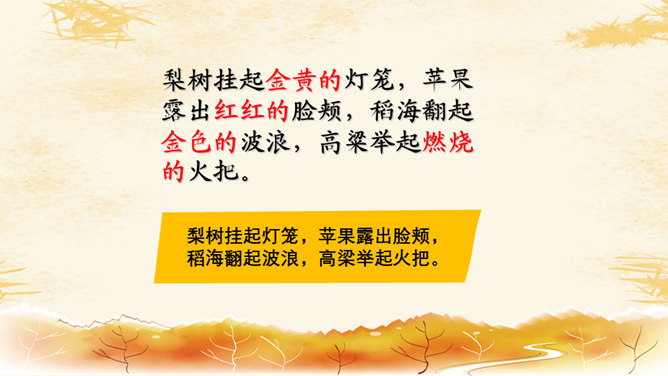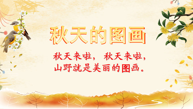 教学目标:1.会认8个生字,会写8个字。2.正确流利、有感情地朗读课文。背诵课文。3.喜欢秋天,体会对秋天的景象和勤劳的人们的喜爱、赞美之情。愿意用自己喜欢的方式来表现秋天。想一想:勤劳的人们是指哪些人呢?你觉得大雁的回答是吗?我们来问问梨树、苹果、稻海和高梁吧!朗读感悟:1.教师范读,学生注意体会教师在朗读中表达的喜爱与赞美的情感。2.学生自由读,一边读一边想象秋天的图画。3.小组内读,说说自己的感受。4.小组内选出自己喜欢的句子来读,并说说为什么喜欢。5.比赛读,看谁读得美。6.寻找自己喜欢的学习小伙伴,读喜欢的句子。7.看着画面用自己的话说说秋天,再试着背诵。推荐栏目:秋天的图画ppt。