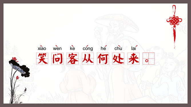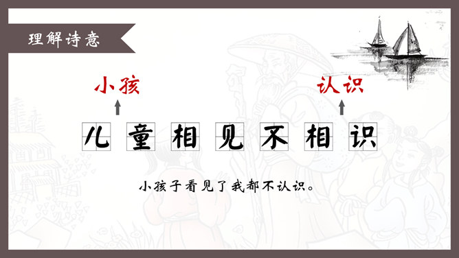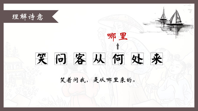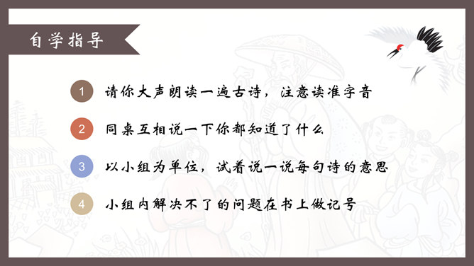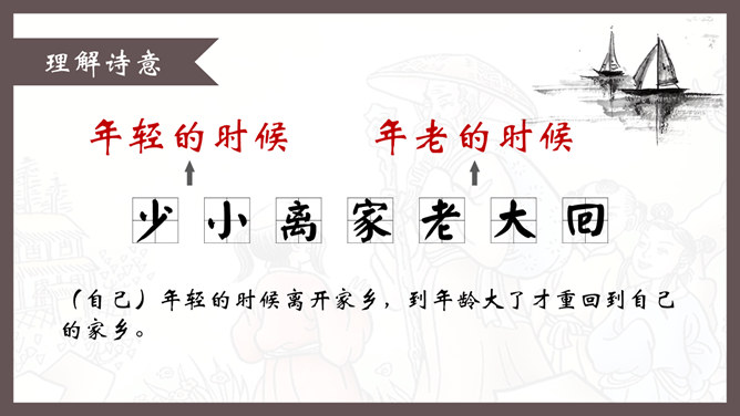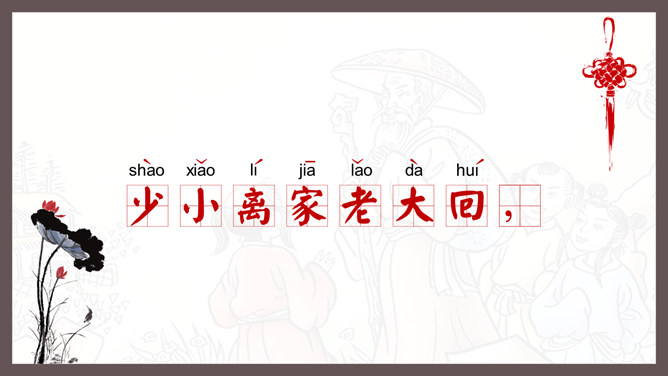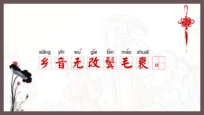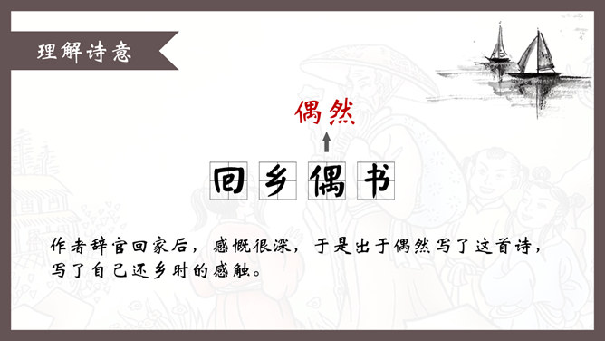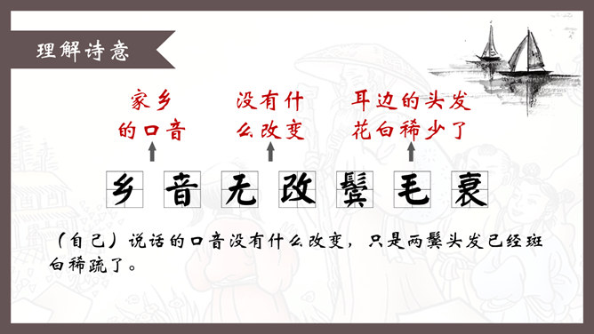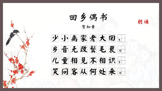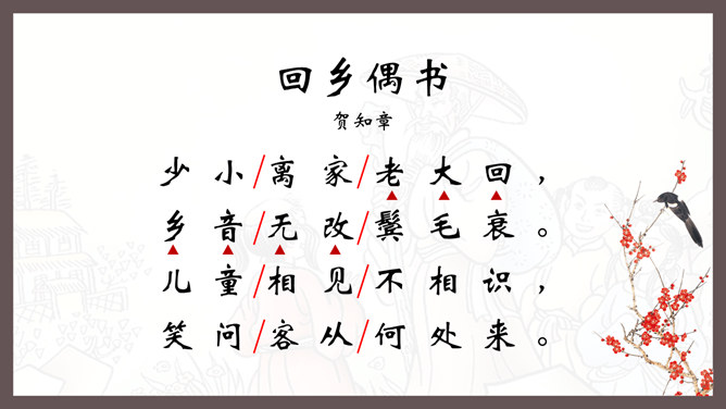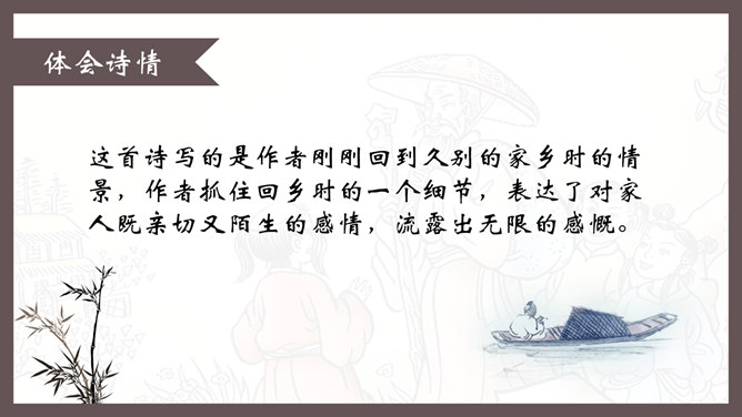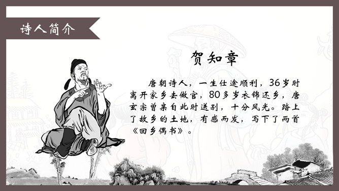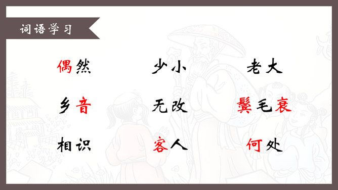 自学指导:1、请你大声朗读一遍古诗,注意读准字音。2、同桌互相说一下你都知道了什么。3、以小组为单位,试着说一说每句诗的意思。4、小组内解决不了的问题在书上做记号。贺知章,唐朝诗人,一生仕途顺利,36岁时离开家乡去做官,80多岁衣锦还乡,唐玄宗曾亲自此时送别,十分风光。踏上了故乡的土地,有感而发,写下了两首《回乡偶书》。理解诗意:作者辞官回家后,感慨很深,于是出于偶然写了这首诗,写了自己还乡时的感触。(自己)年轻的时候离开家乡,到年龄大了才重回到自己的家乡。(自己)说话的口音没有什么改变,只是两鬓头发已经斑白稀疏了。小孩子看见了我都不认识。笑着问我,是从哪里来的。这首诗写的是作者刚刚回到久别的家乡时的情景,作者抓住回乡时的一个细节,表达了对家人既亲切又陌生的感情,流露出无限的感慨。