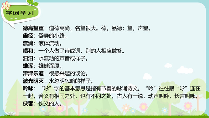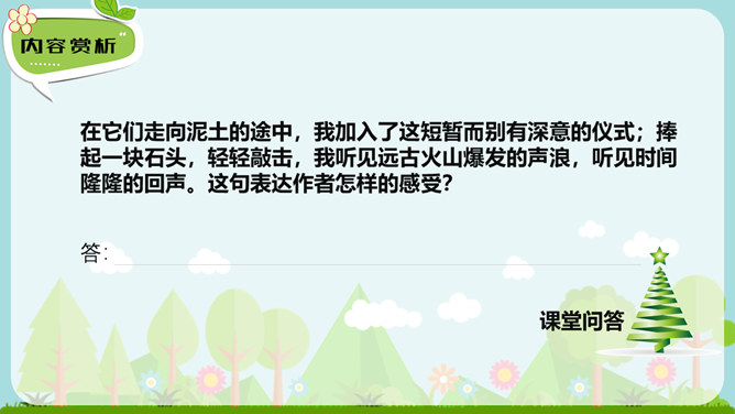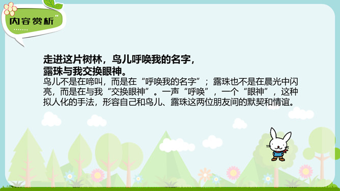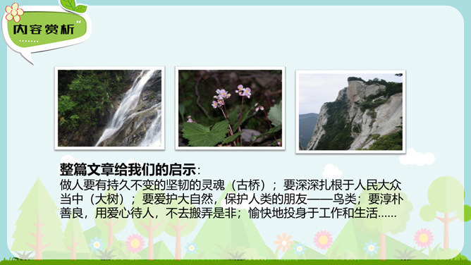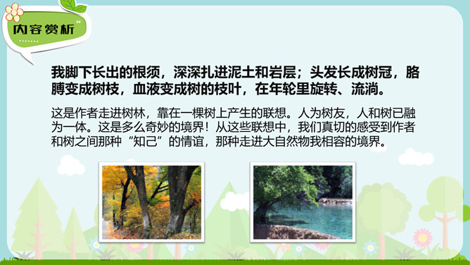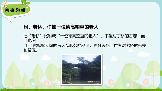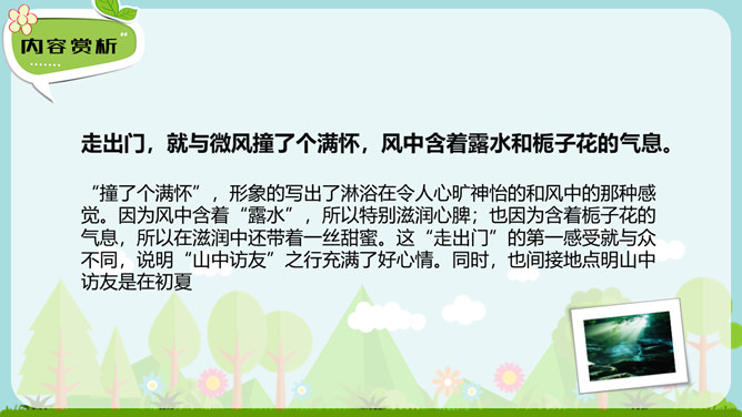 走出门,就与微风撞了个满怀,风中含着露水和栀子花的气息。“撞了个满怀”,形象的写出了淋浴在令人心旷神怡的和风中的那种感觉。因为风中含着“露水”,所以特别滋润心脾;也因为含着栀子花的气息,所以在滋润中还带着一丝甜蜜。这“走出门”的第一感受就与众不同,说明“山中访友”之行充满了好心情。同时,也间接地点明山中访友是在初夏。啊,老桥,你如一位德高望重的老人。把“老桥”比喻成“一位德高望重的老人”,不但写了桥的古老,而且也突出了它默默无闻的为大众服务的品质,充分表达了作者对老桥的赞美和敬佩。走进这片树林,鸟儿呼唤我的名字,露珠与我交换眼神。鸟儿不是在啼叫,而是在“呼唤我的名字”;露珠也不是在晨光中闪亮,而是在与我“交换眼神”。一声“呼唤”,一个“眼神”,这种拟人化的手法,形容自己和鸟儿、露珠这两位朋友间的默契和情谊。我脚下长出的根须,深深扎进泥土和岩层;头发长成树冠,胳膊变成树枝,血液变成树的枝叶,在年轮里旋转、流淌。这是作者走进树林,靠在一棵树上产生的联想。人为树友,人和树已融为一体。这是多么奇妙的境界!从这些联想中,我们真切的感受到作者和树之间那种“知己”的情谊,那种走进大自然物我相容的境界。
