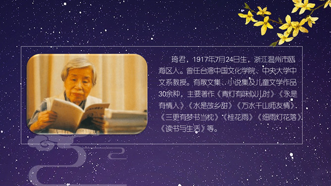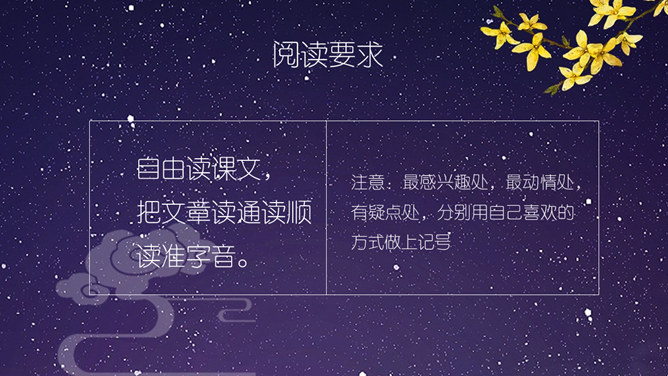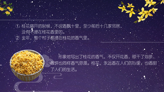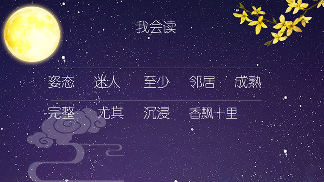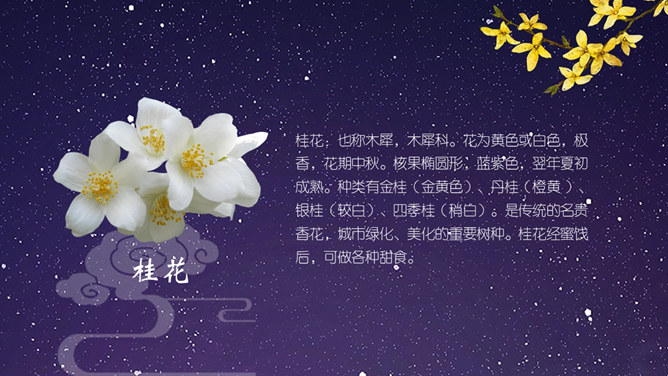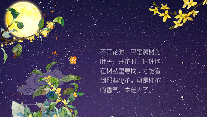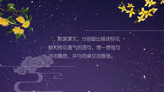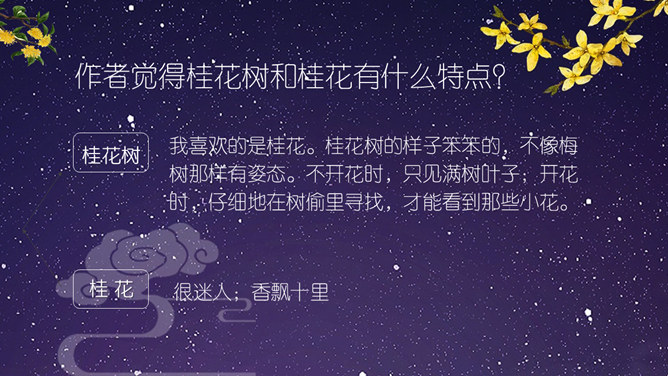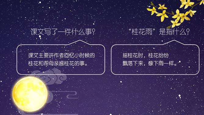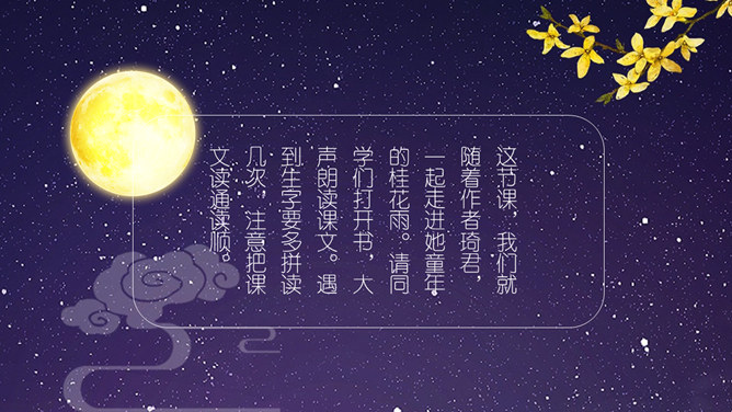 这节课,我们就随着作者琦君,一起走进她童年的桂花雨。请同学们打开书,大声朗读课文。遇到生字要多拼读几次,注意把课文读通读顺。琦君,1917年7月24日生,浙江温州市瓯海区人。曾任台湾中国文化学院、中央大学中文系教授。有散文集、小说集及儿童文学作品30余种,主要著作《青灯有味似儿时》《永是有情人》《水是故乡甜》《万水千山师友情》《三更有梦书当枕》《桂花雨》《细雨灯花落》《读书与生活》等。桂花:也称木犀,木犀科。花为黄色或白色,极香,花期中秋。核果椭圆形,蓝紫色,翌年夏初成熟。种类有金桂(金黄色)、丹桂(橙黄 )、银桂(较白)、四季桂(稍白)。是传统的名贵香花,城市绿化、美化的重要树种。桂花经蜜饯后,可做各种甜食。课文写了一件什么事?课文主要讲作者回忆小时候的桂花和帮母亲摇桂花的事。桂花雨”是指什么?摇桂花时,桂花纷纷飘落下来,像下雨一样。所属专题:桂花雨ppt。