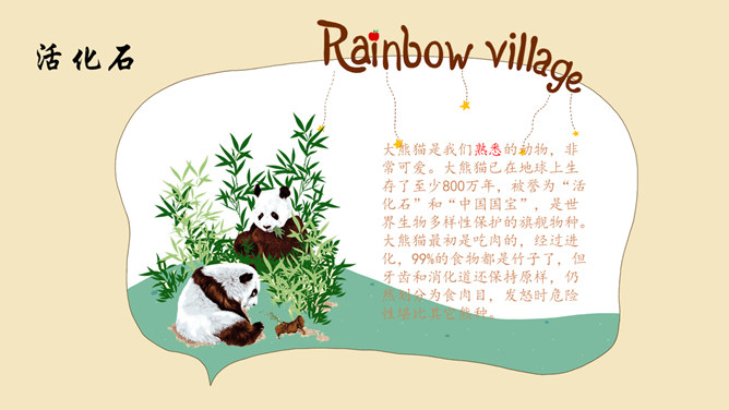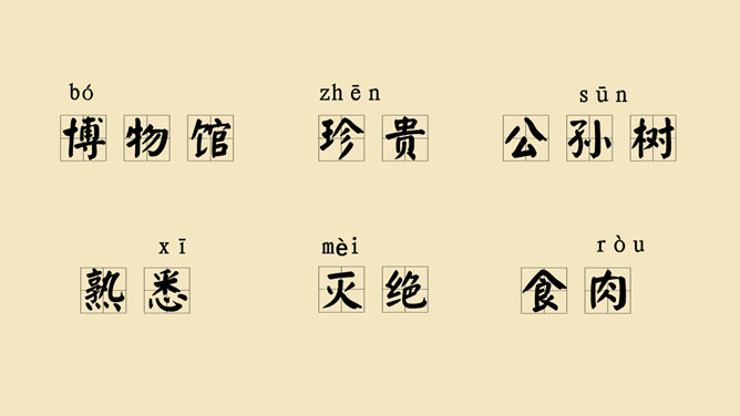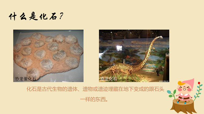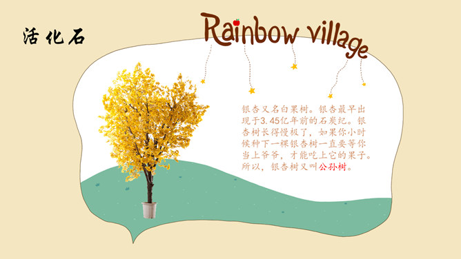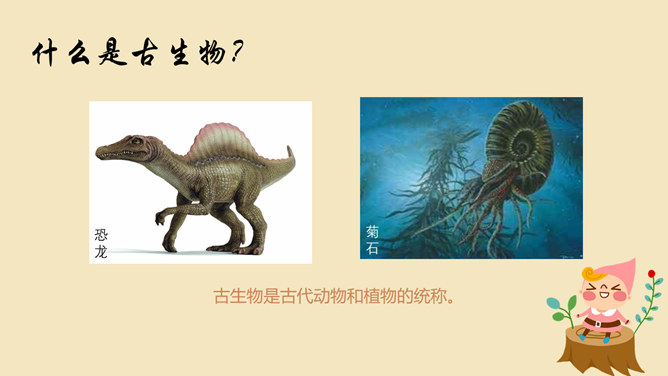 什么是古生物?古生物是古代动物和植物的统称。什么是化石?化石是古代生物的遗体、遗物或遗迹埋藏在地下变成的跟石头一样的东西。研究化石有什么意义呢?厚厚的地层好比一本硕大无比的书,夹藏在不同地层里的化石就像一种特殊的文字,记录着古生物生存活动的历史和地层的年龄,它是人类开启地球宫门的一把钥匙。因此,研究化石可以了解生物的演化并能帮助人们确定地层的年代。思考活化石又是什么呢?在化石博物馆当中,我们能看到一块一块的化石,了解以前存在于地球上的动物和植物。那么,你看见过活化石吗?银杏又名白果树。银杏最早出现于3.45亿年前的石炭纪。银杏树长得慢极了,如果你小时候种下一棵银杏树一直要等你当上爷爷,才能吃上它的果子。所以,银杏树又叫公孙树。大熊猫是我们熟悉的动物,非常可爱。大熊猫已在地球上生存了至少800万年,被誉为“活化石”和“中国国宝”,是世界生物多样性保护的旗舰物种。大熊猫最初是吃肉的,经过进化,99%的食物都是竹子了,但牙齿和消化道还保持原样,仍然划分为食肉目,发怒时危险性堪比其它熊种。
