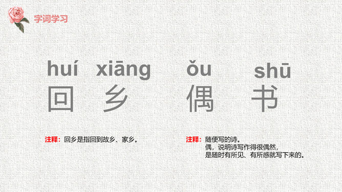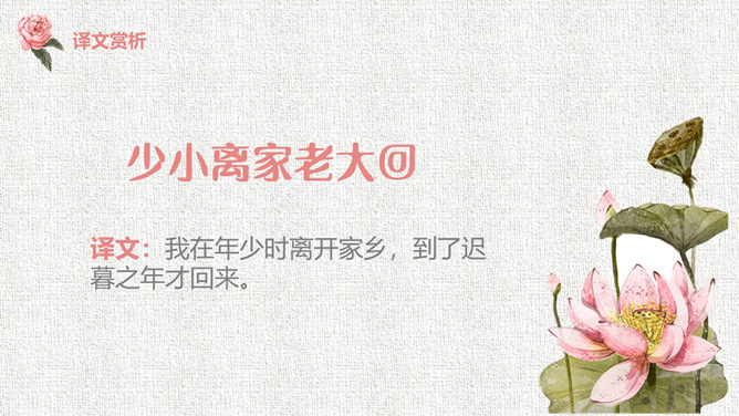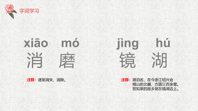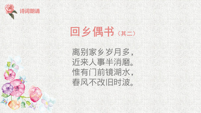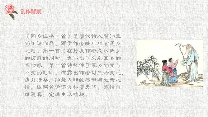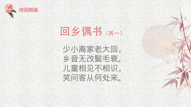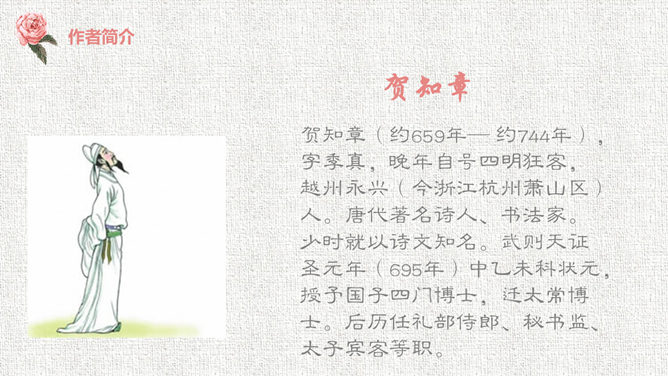 作者简介:贺知章(约659年— 约744年),字季真,晚年自号四明狂客,越州永兴(今浙江杭州萧山区)人。唐代著名诗人、书法家。少时就以诗文知名。武则天证圣元年(695年)中乙未科状元,授予国子四门博士,迁太常博士。后历任礼部侍郎、秘书监、太子宾客等职。创作背景:回乡偶书二首》是唐代诗人贺知章的组诗作品,写于作者晚年辞官还乡之时。第一首诗在抒发作者久客他乡的伤感的同时,也写出了久别回乡的亲切感;第二首诗抓住了家乡的变与不变的对比,流露出作者对生活变迁、岁月沧桑、物是人非的感慨与无奈之情。这两首诗语言朴实无华,感情自然逼真,充满生活情趣。1、贺知章除了创作《回乡偶书》外,还有哪些诗词作品?2、除了《回乡偶书》还有哪些诗词也表达了离别家乡,对家乡的思念之情?