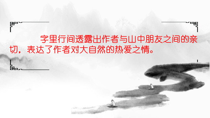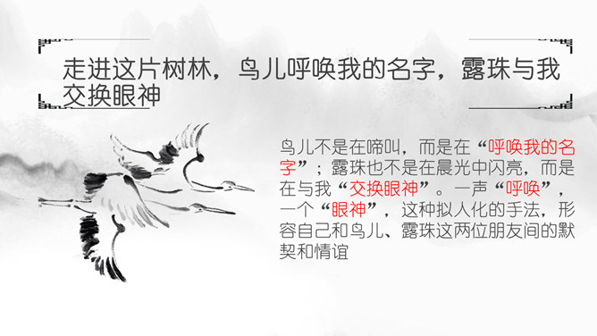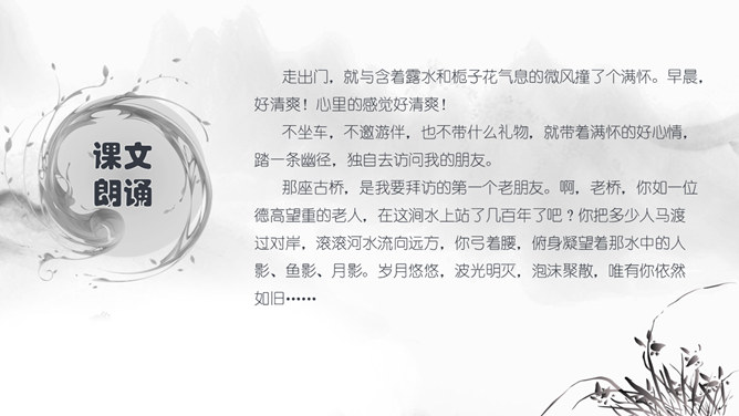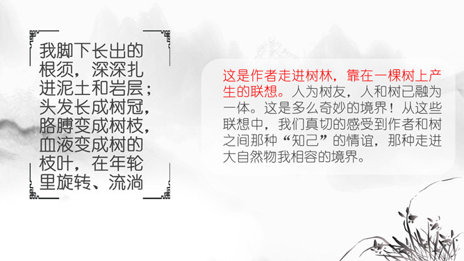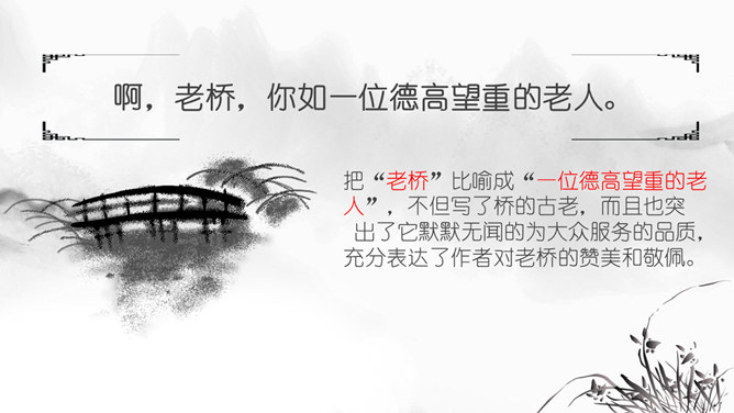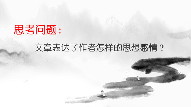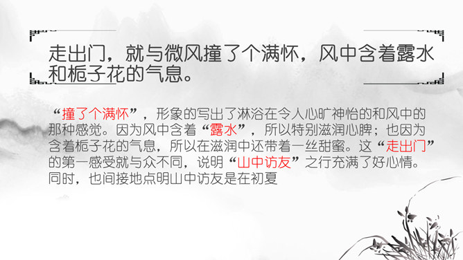 思考问题:文章表达了作者怎样的思想感情?字里行间透露出作者与山中朋友之间的亲切,表达了作者对大自然的热爱之情。啊,老桥,你如一位德高望重的老人。把“老桥”比喻成“一位德高望重的老人”,不但写了桥的古老,而且也突出了它默默无闻的为大众服务的品质,充分表达了作者对老桥的赞美和敬佩。走进这片树林,鸟儿呼唤我的名字,露珠与我交换眼神。鸟儿不是在啼叫,而是在“呼唤我的名字”;露珠也不是在晨光中闪亮,而是在与我“交换眼神”。一声“呼唤”,一个“眼神”,这种拟人化的手法,形容自己和鸟儿、露珠这两位朋友间的默契和情谊。走出门,就与微风撞了个满怀,风中含着露水和栀子花的气息。“撞了个满怀”,形象的写出了淋浴在令人心旷神怡的和风中的那种感觉。因为风中含着“露水”,所以特别滋润心脾;也因为含着栀子花的气息,所以在滋润中还带着一丝甜蜜。这“走出门”的第一感受就与众不同,说明“山中访友”之行充满了好心情。同时,也间接地点明山中访友是在初夏。