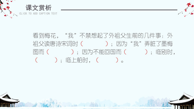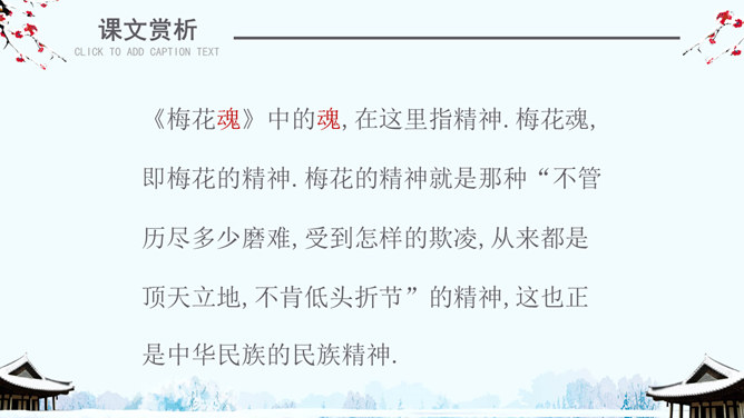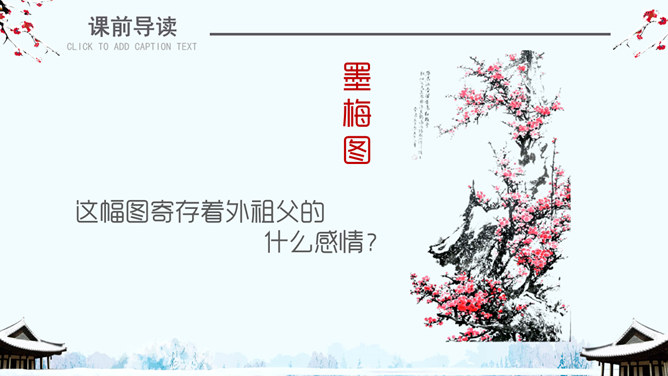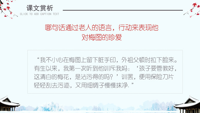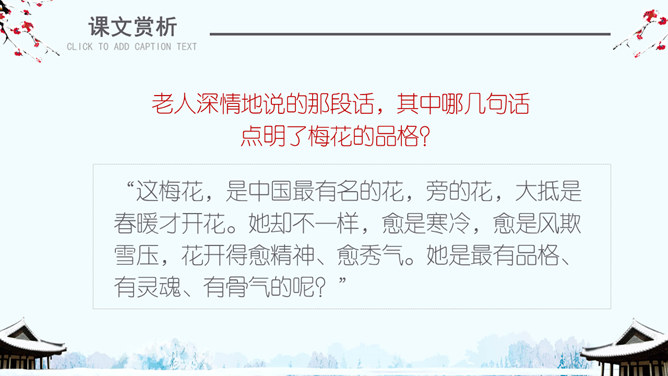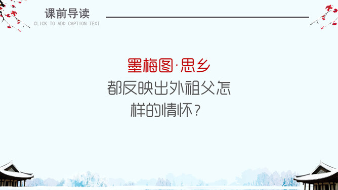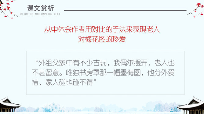墨梅图,这幅图寄存着外祖父的什么感情?墨梅图·思乡都反映出外祖父怎样的情怀?颇负盛名,解析:颇,相当地。负,享有。盛名,很大的名望。颇负盛名,有很大的名望。顶天立地,解析:头顶青天,脚立在地上。形容光明正大,形象高大,气概豪迈。不甚在意,解析:不怎么放在心上 不甚: 1.表示程度不很高。 在意: 1.留意;放在心上。老人深情地说的那段话,其中哪几句话点明了梅花的品格?这梅花,是中国最有名的花,旁的花,大抵是春暖才开花。她却不一样,愈是寒冷,愈是风欺雪压,花开得愈精神、愈秀气。她是最有品格、有灵魂、有骨气的呢?”从中体会作者用对比的手法来表现老人对梅花图的珍爱,外祖父家中有不少古玩,我偶尔摆弄,老人也不甚留意。唯独书房罩那一幅墨梅图,他分外爱惜,家人碰也碰不得”。哪句话通过老人的语言,行动来表现他对梅图的珍爱?我不小心在梅图上留下脏手印,外祖父顿时拉下脸来。有生以来,我第一次听到他训斥我妈:‘孩子要管教好,这清白的梅花,是沾污得的吗?’训罢,便用保险刀片轻轻刮去污迹,又用细绸子慢慢抹净。”所属专题:梅花魂ppt。