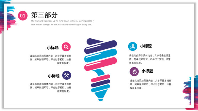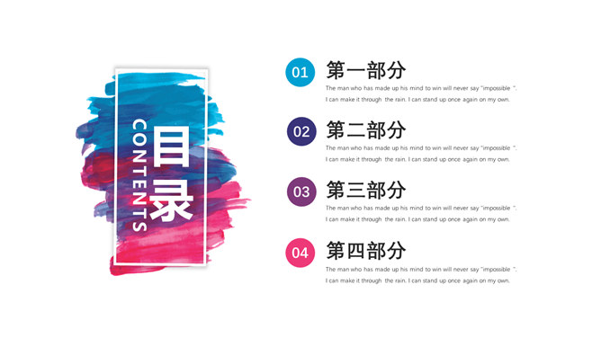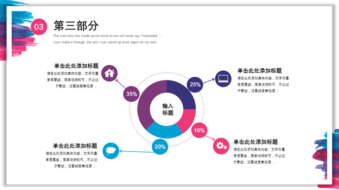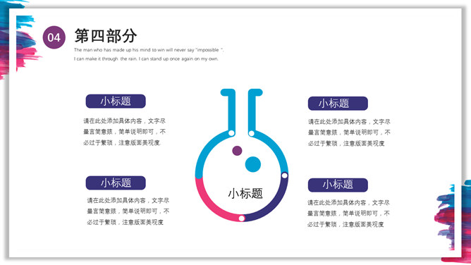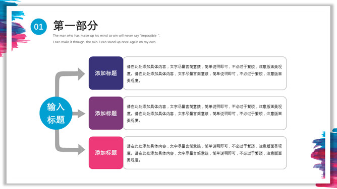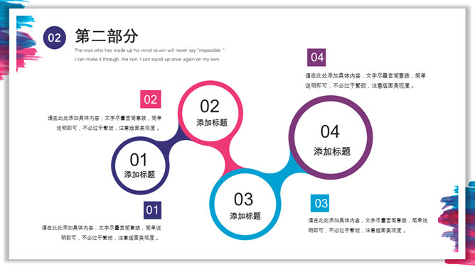 彩色水彩墨迹通用PPT模板。一套多功能通用幻灯片模板,彩色水彩墨迹装饰,多图形图表页面,通用性强。