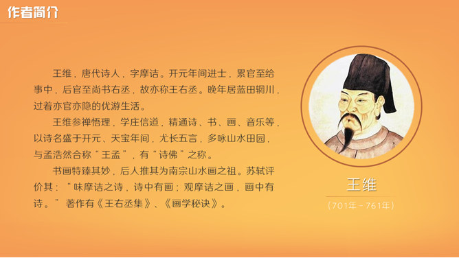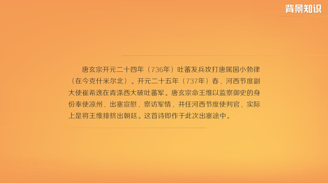 作者简介:王维,唐代诗人,字摩诘。开元年间进士,累官至给事中,后官至尚书右丞,故亦称王右丞。晚年居蓝田辋川,过着亦官亦隐的优游生活。王维参禅悟理,学庄信道,精通诗、书、画、音乐等,以诗名盛于开元、天宝年间,尤长五言,多咏山水田园,与孟浩然合称“王孟”,有“诗佛”之称。书画特臻其妙,后人推其为南宗山水画之祖。苏轼评价其:“味摩诘之诗,诗中有画;观摩诘之画,画中有诗。” 著作有《王右丞集》、《画学秘诀》。李白是天才,杜甫是地才,王维是人才。王维的诗你还知道哪些?背景知识:唐玄宗开元二十四年(736年)吐蕃发兵攻打唐属国小勃律(在今克什米尔北)。开元二十五年(737年)春,河西节度副大使崔希逸在青涤西大破吐蕃军。唐玄宗命王维以监察御史的身份奉使凉州,出塞宣慰,察访军情,并任河西节度使判官,实际上是将王维排挤出朝廷。这首诗即作于此次出塞途中。
