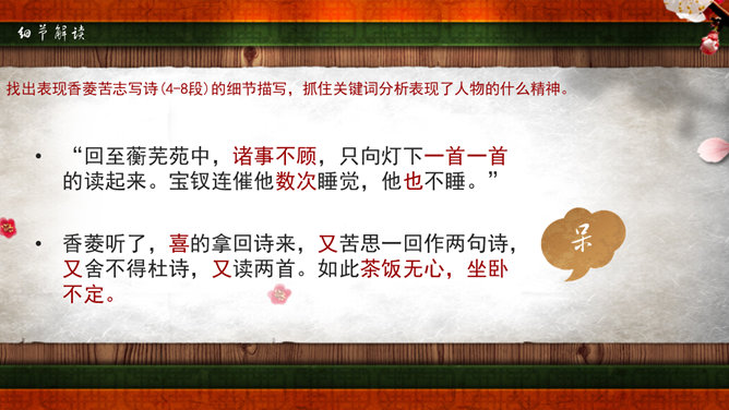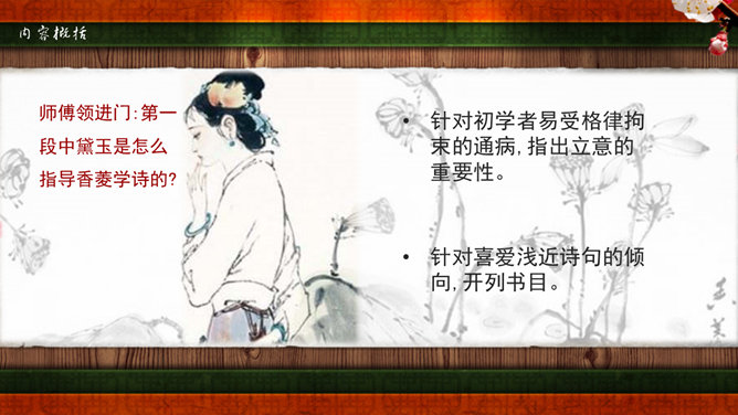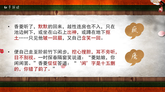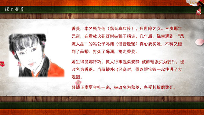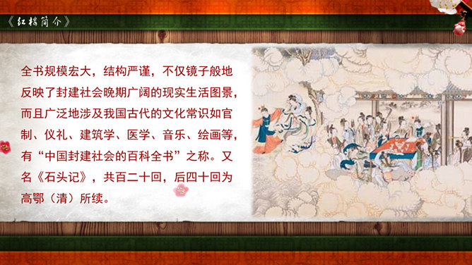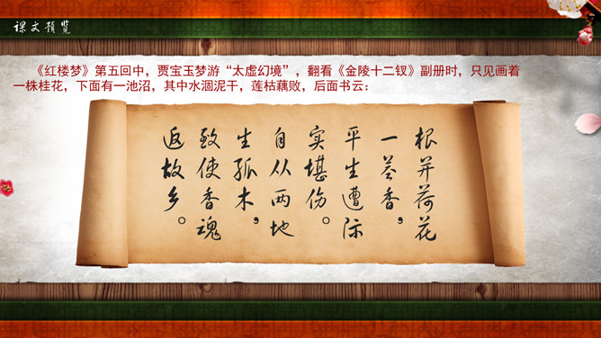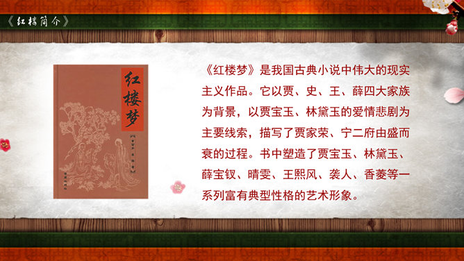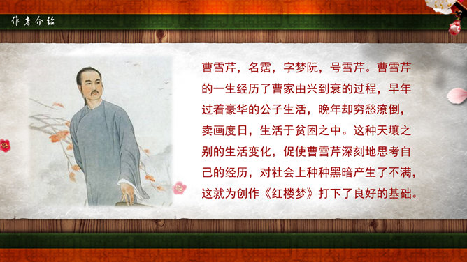 《红楼梦》是我国古典小说中伟大的现实主义作品。它以贾、史、王、薛四大家族为背景,以贾宝玉、林黛玉的爱情悲剧为主要线索,描写了贾家荣、宁二府由盛而衰的过程。书中塑造了贾宝玉、林黛玉、薛宝钗、晴雯、王熙风、袭人、香菱等一系列富有典型性格的艺术形象。全书规模宏大,结构严谨,不仅镜子般地反映了封建社会晚期广阔的现实生活图景,而且广泛地涉及我国古代的文化常识如官制、仪礼、建筑学、医学、音乐、绘画等,有“中国封建社会的百科全书”之称。又名《石头记》,共百二十回,后四十回为高鄂(清)所续。曹雪芹,名霑,字梦阮,号雪芹。曹雪芹的一生经历了曹家由兴到衰的过程,早年过着豪华的公子生活,晚年却穷愁潦倒,卖画度日,生活于贫困之中。这种天壤之别的生活变化,促使曹雪芹深刻地思考自己的经历,对社会上种种黑暗产生了不满,这就为创作《红楼梦》打下了良好的基础。红楼梦》第五回中,贾宝玉梦游“太虚幻境”,翻看《金陵十二钗》副册时,只见画着一株桂花,下面有一池沼,其中水涸泥干,莲枯藕败,后面书云:根并荷花一茎香,平生遭际实堪伤。自从两地生孤木,致使香魂返故乡。