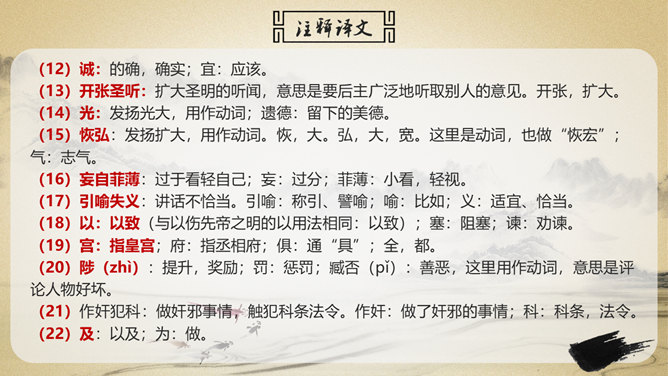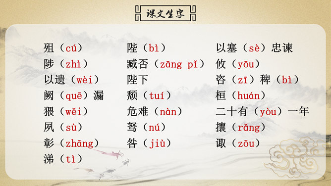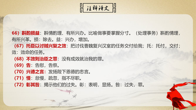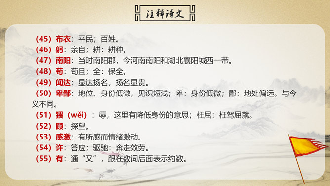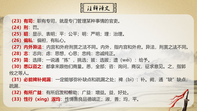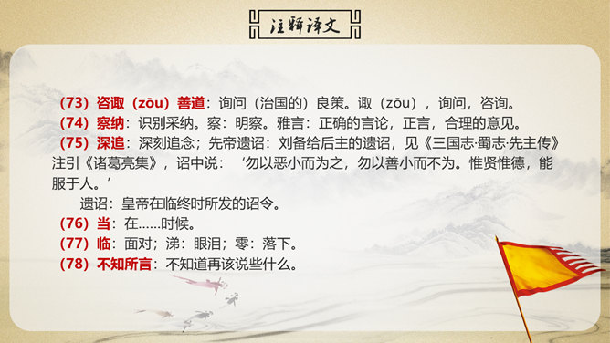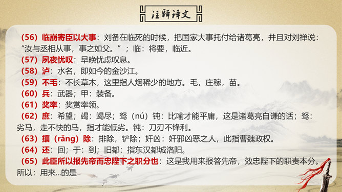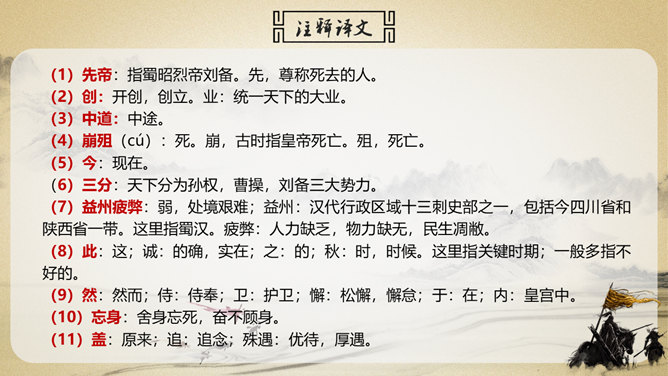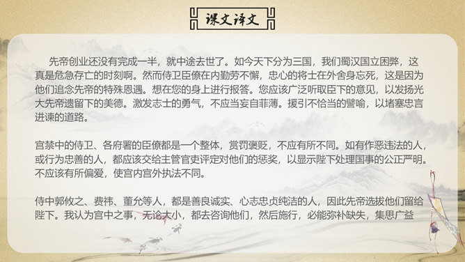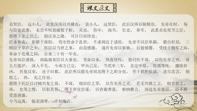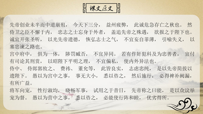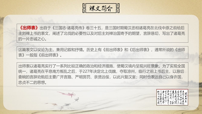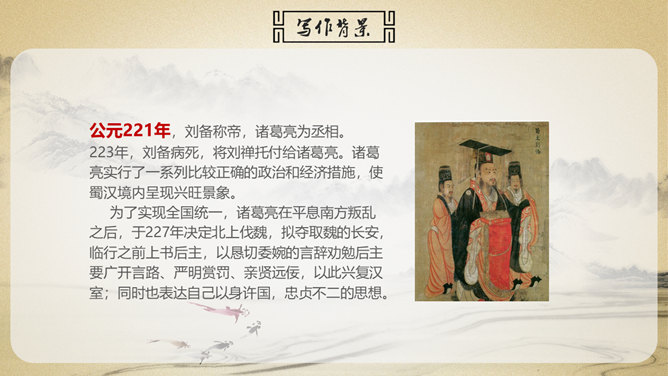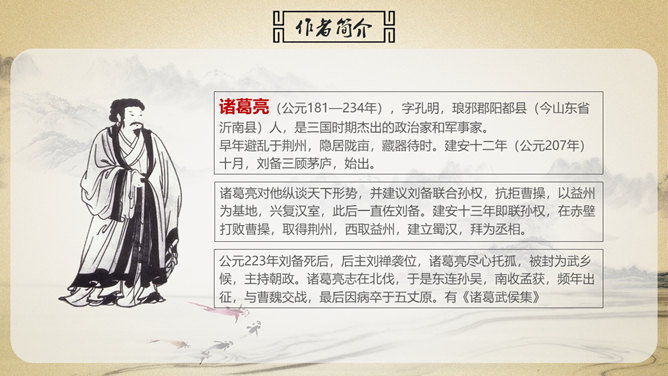 诸葛亮(公元181—234年),字孔明,琅邪郡阳都县(今山东省沂南县)人,是三国时期杰出的政治家和军事家。早年避乱于荆州,隐居陇亩,藏器待时。建安十二年(公元207年)十月,刘备三顾茅庐,始出。诸葛亮对他纵谈天下形势,并建议刘备联合孙权,抗拒曹操,以益州为基地,兴复汉室,此后一直佐刘备。建安十三年即联孙权,在赤壁打败曹操,取得荆州,西取益州,建立蜀汉,拜为丞相。公元223年刘备死后,后主刘禅袭位,诸葛亮尽心托孤,被封为武乡候,主持朝政。诸葛亮志在北伐,于是东连孙吴,南收孟获,频年出征,与曹魏交战,最后因病卒于五丈原。有《诸葛武侯集》。《出师表》出自于《三国志·诸葛亮传》卷三十五,是三国时期蜀汉丞相诸葛亮在北伐中原之前给后主刘禅上书的表文,阐述了北伐的必要性以及对后主刘禅治国寄予的期望,言辞恳切,写出了诸葛亮的一片忠诚之心。这篇表文以议论为主,兼用记叙和抒情。历史上有《前出师表》和《后出师表》,通常所说的《出师表》一般指《前出师表》。所属专题:出师表ppt。