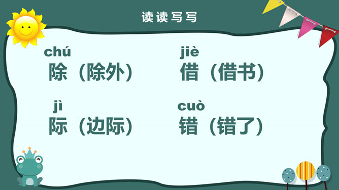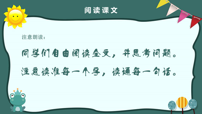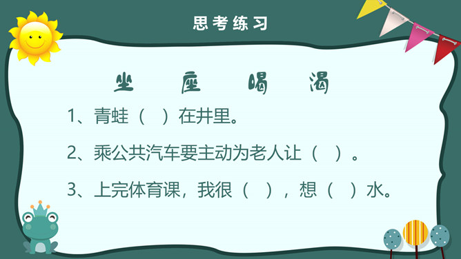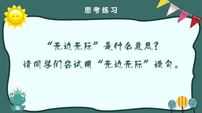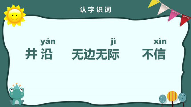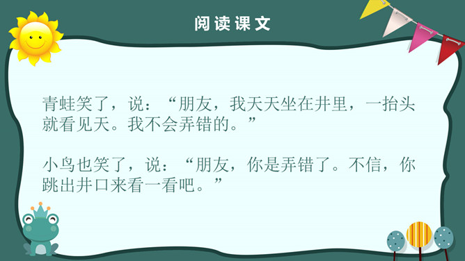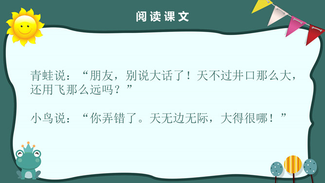 同学们自由阅读全文,并思考问题。注意读准每一个字,读通每一句话。注意思考:1、为什么青蛙认为天“不过井口那大”?2、为什么小鸟认为“天无边无际,大得很哪”?请用上“因为……所以……”作答。思考练习:“无边无际”是什么意思?请同学们尝试用“无边无际”造句。扩展活动:小组合作,续编第四次对话:青蛙如果真的跳出井口,他会看到什么,会说些什么?1.学生分小组合作学习,续编第四次对话,并分角色读一读。2.全班交流续编的对话。