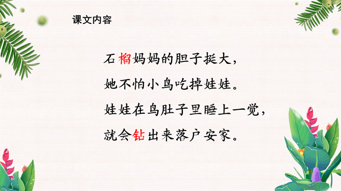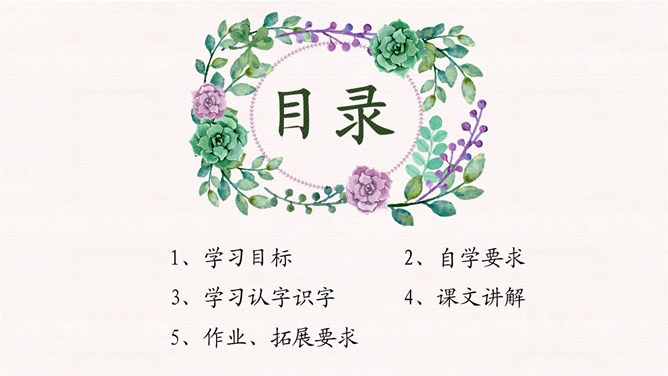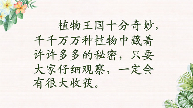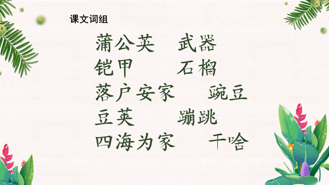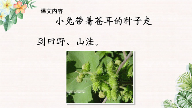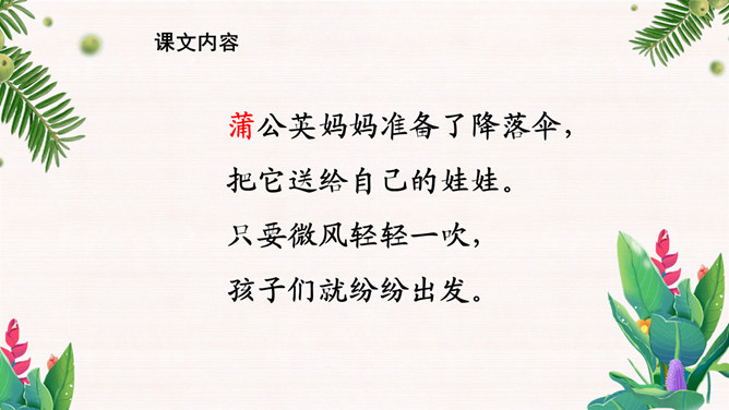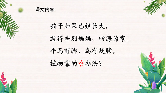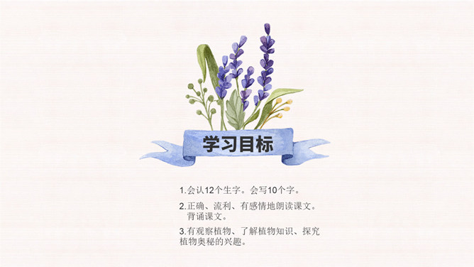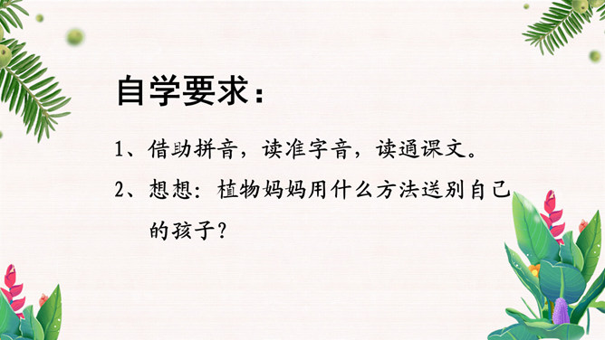 学习目标:1.会认12个生字。会写10个字。2.正确、流利、有感情地朗读课文。背诵课文。3.有观察植物、了解植物知识、探究植物奥秘的兴趣。植物王国十分奇妙,千千万万种植物中藏着许许多多的秘密,只要大家仔细观察,一定会有很大收获。自学要求:1、借助拼音,读准字音,读通课文。2、想想:植物妈妈用什么方法送别自己的孩子?作业:1、认读本课生字、词语。2、正确、流利地朗读课文。拓展:阅读课外书籍,了解其他植物是如何传播种子的。朗读感悟:本课将自然知识寓于充满儿童情趣、富有韵律感的诗歌当中。推荐栏目:植物妈妈有办法ppt。