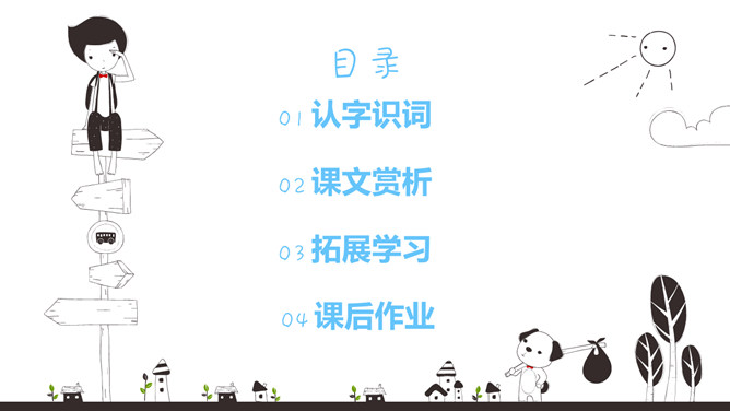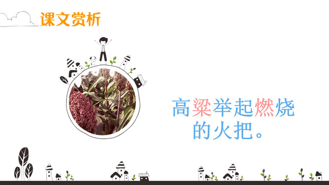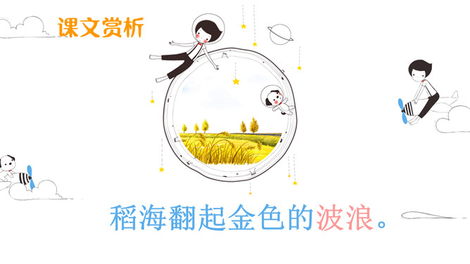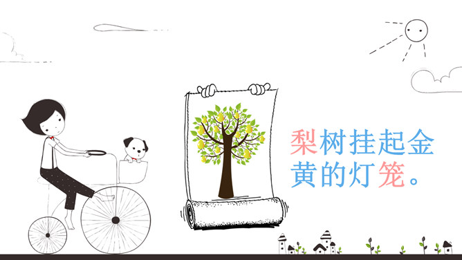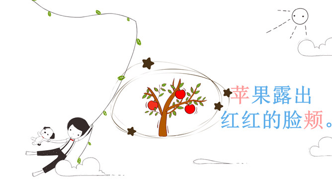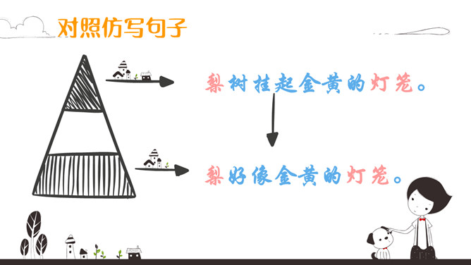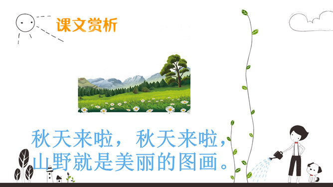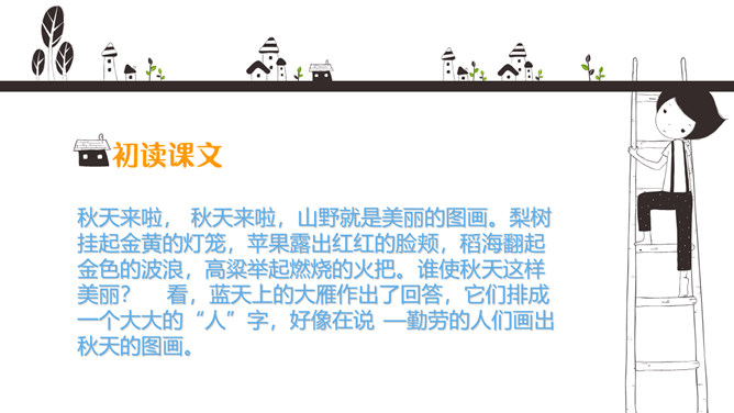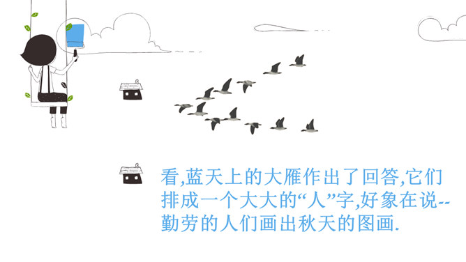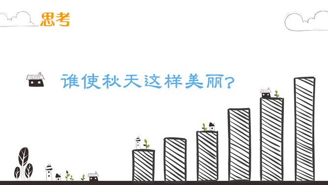 初读课文:秋天来啦, 秋天来啦,山野就是美丽的图画。梨树挂起金黄的灯笼,苹果露出红红的脸颊,稻海翻起金色的波浪,高粱举起燃烧的火把。谁使秋天这样美丽?看,蓝天上的大雁作出了回答,它们排成一个大大的“人”字,好像在说—勤劳的人们画出秋天的图画。思考:谁使秋天这样美丽?看,蓝天上的大雁作出了回答,它们排成一个大大的“人”字,好象在说--勤劳的人们画出秋天的图画。对照仿写句子:梨树挂起金黄的灯笼。梨好像金黄的灯笼。苹果露出红红的脸颊。苹果好像红红的脸颊。想一想:此时,梨树、苹果树、蹈海、高粱会对勤劳的人们说些什么?说一说:学习了课文,你想对秋天说些什么?推荐栏目:秋天的图画ppt。