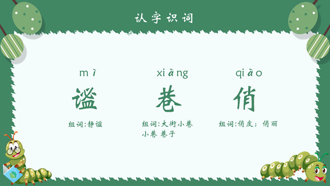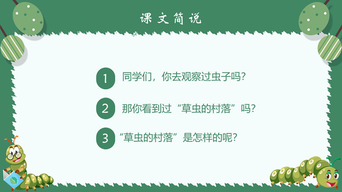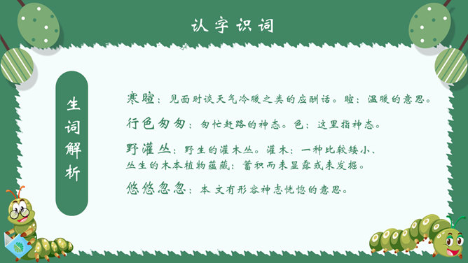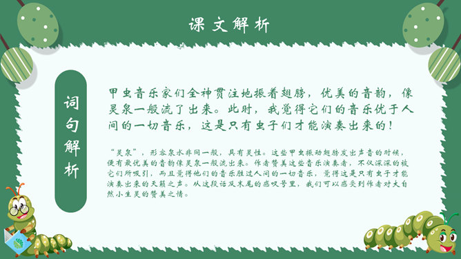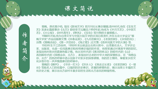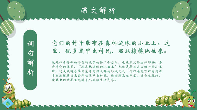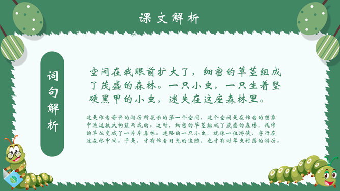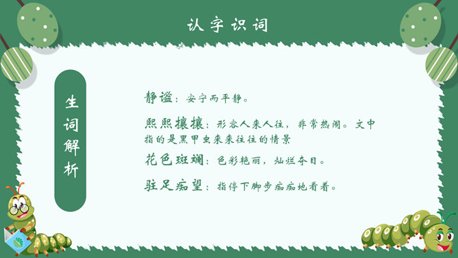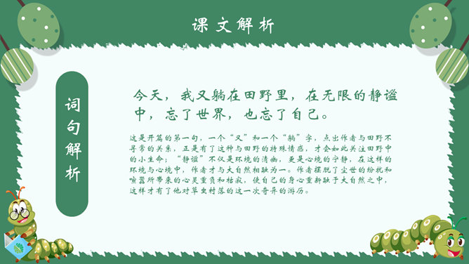 作者简介:郭枫,原名郭少鸣, 现任《新地文学》双月刊社长兼总编辑.高中时代,他在《宝岛文艺》发表长篇叙事诗《北方》即倍受文坛瞩目。1950年起,他成为《半月文艺》,《中国文艺》,《大公报》,《时代青年》,《野风》,《宝岛》等刊物的主要撰稿人。生词解析:花色斑斓:色彩艳丽,灿烂夺目。熙熙攘攘:形容人来人往,非常热闹。文中指的是黑甲虫来来往往的情景。驻足痴望:指停下脚步痴痴地看着。静谧:安宁而平静。词句解析:今天,我又躺在田野里,在无限的静谧中,忘了世界,也忘了自己。这是开篇的第一句,一个“又”和一个“躺”字,点出作者与田野不寻常的关系,正是有了这种与田野的特殊情感,才会如此关注田野中的小生命;“静谧”不仅是环境的清幽,更是心境的宁静,在这样的环境与心境中,作者才与大自然相融为一。作者摆脱了尘世的纷扰和喧嚣所带来的心灵重负和枯寂,使自己的身心重新融于大自然之中,这样才有了他对草虫村落的这一次奇异的游历。