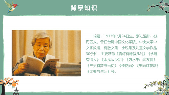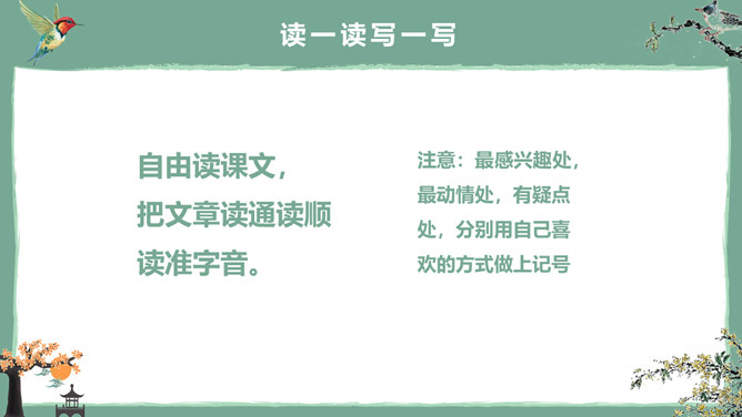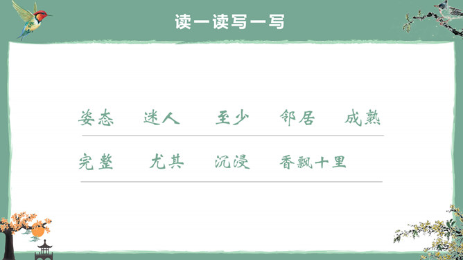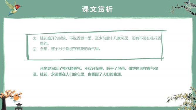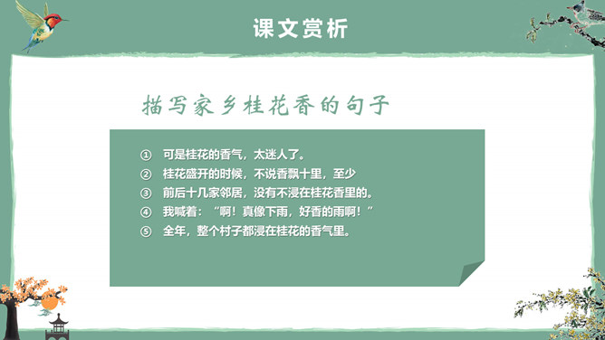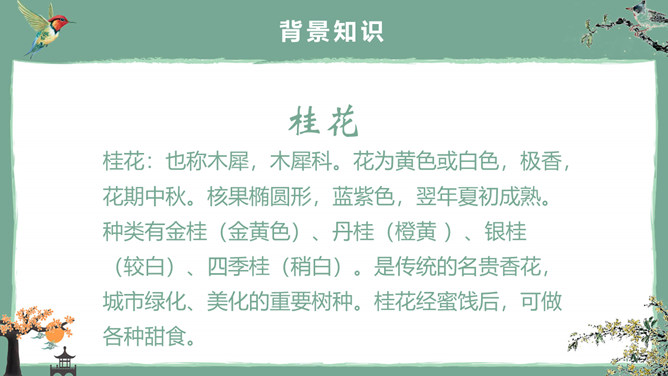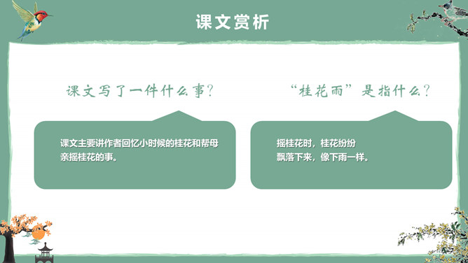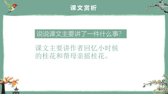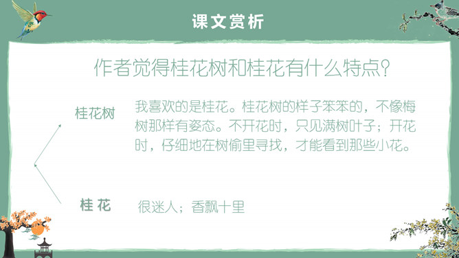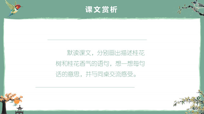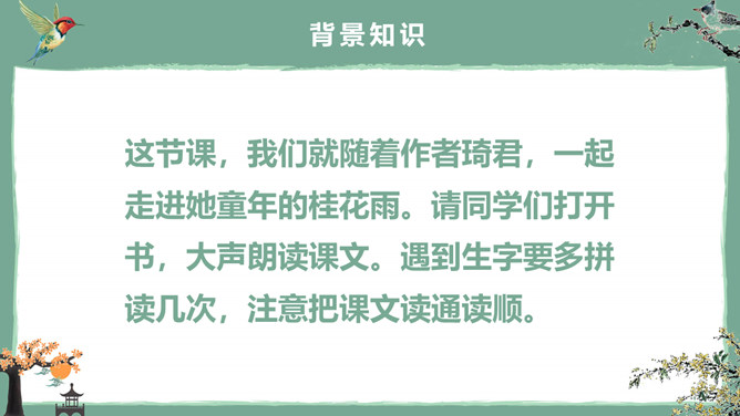 这节课,我们就随着作者琦君,一起走进她童年的桂花雨。请同学们打开书,大声朗读课文。遇到生字要多拼读几次,注意把课文读通读顺。桂花:也称木犀,木犀科。花为黄色或白色,极香,花期中秋。核果椭圆形,蓝紫色,翌年夏初成熟。种类有金桂(金黄色)、丹桂(橙黄 )、银桂(较白)、四季桂(稍白)。是传统的名贵香花,城市绿化、美化的重要树种。桂花经蜜饯后,可做各种甜食。说说课文主要讲了一件什么事?课文主要讲作者回忆小时候的桂花和帮母亲摇桂花。默读课文,分别画出描述桂花树和桂花香气的语句,想一想每句话的意思,并与同桌交流感受。作者觉得桂花树和桂花有什么特点?我喜欢的是桂花。桂花树的样子笨笨的,不像梅树那样有姿态。不开花时,只见满树叶子;开花时,仔细地在树偷里寻找,才能看到那些小花。描家乡桂花香的句子:可是桂花的香气,太迷人了。桂花盛开的时候,不说香飘十里,至少前后十几家邻居,没有不浸在桂花香里的。我喊着:“啊!真像下雨,好香的雨啊!”全年,整个村子都浸在桂花的香气里。所属专题:桂花雨ppt。