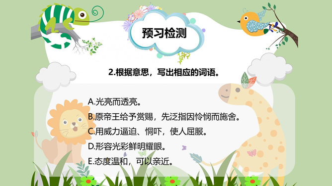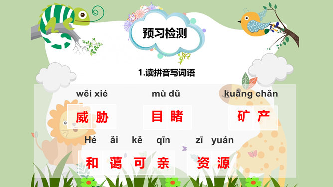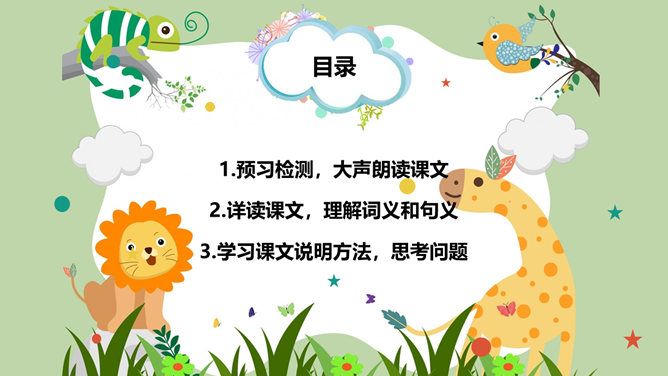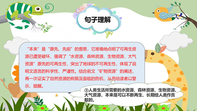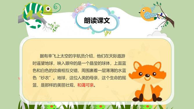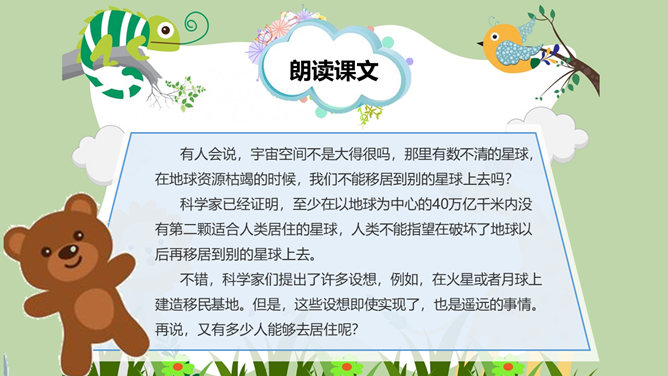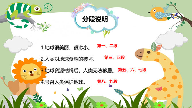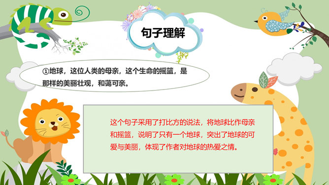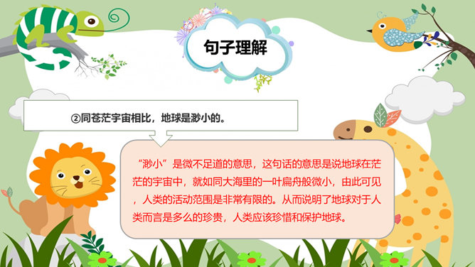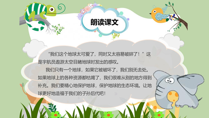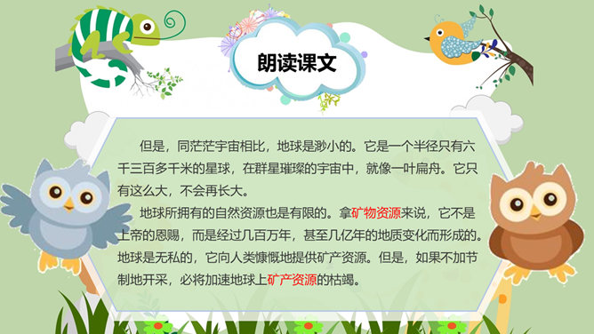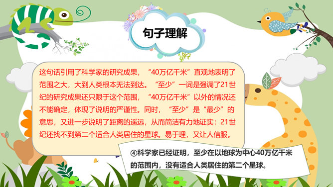 1.预习检测,大声朗读课文。2.详读课文,理解词义和句义。3.学习课文说明方法,思考问题。句子理解:①地球,这位人类的母亲,这个生命的摇篮,是那样的美丽壮观,和蔼可亲。这个句子采用了打比方的说法,将地球比作母亲和摇篮,说明了只有一个地球,突出了地球的可爱与美丽,体现了作者对地球的热爱之情。②同苍茫宇宙相比,地球是渺小的。“渺小”是微不足道的意思,这句话的意思是说地球在茫茫的宇宙中,就如同大海里的一叶扁舟般微小,由此可见,人类的活动范围是非常有限的。从而说明了地球对于人类而言是多么的珍贵,人类应该珍惜和保护地球。③人类生活所需要的水资源、森林资源、生物资源、大气资源,本来是可以不断再生,长期给人类作贡献的。“本来”是“原先、先前”的意思,它准确地点明了可再生资源已遭受破坏,强调了“水资源、森林资源、生物资源、大气资源”原先的可再生性,突出了地球的不可再生性,体现了说明文语言的科学性、严谨性。结合前文“矿物资源”的阐述,再一次证实了自然资源的有限及面临的危机,从而给读者以警示、提醒。④科学家已经证明,至少在以地球为中心40万亿千米的范围内,没有适合人类居住的第二个星球。这句话引用了科学家的研究成果,“40万亿千米”直观地表明了范围之大,大到人类根本无法到达。“至少”一词是强调了21世纪的研究成果还只限于这个范围,“40万亿千米”以外的情况还不能确定,体现了说明的严谨性。同时,“至少”是“最少”的意思,又进一步说明了距离的遥远,从而简洁有力地证实:21世纪还找不到第二个适合人类居住的星球。易于理,又让人信服。所属专题:只有一个地球ppt。