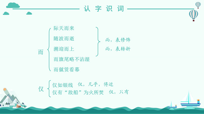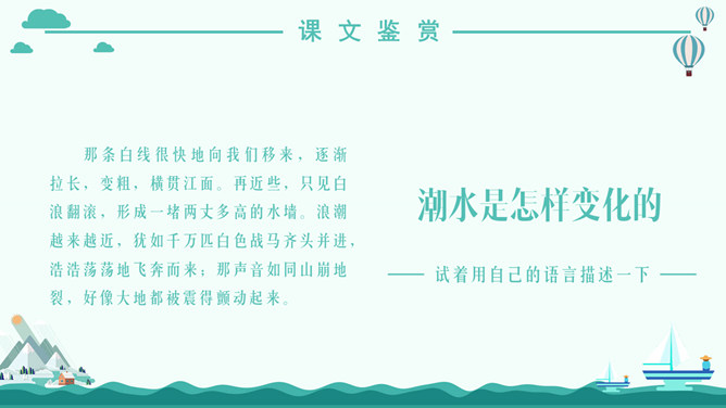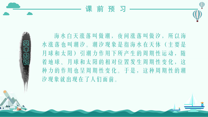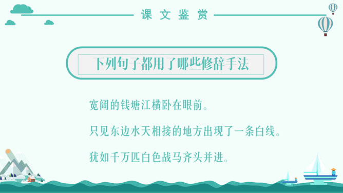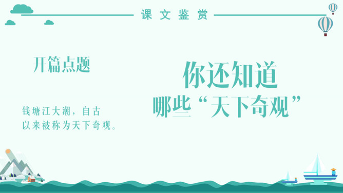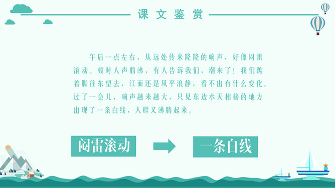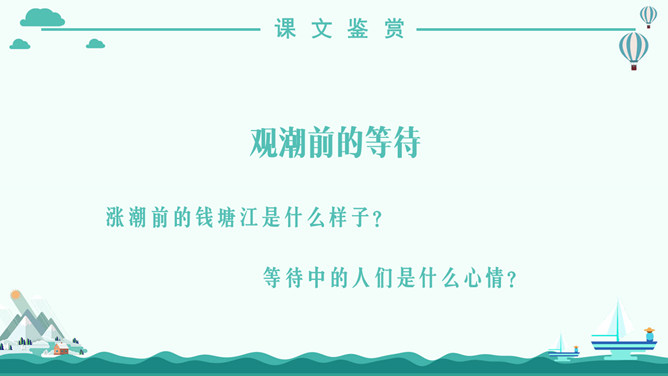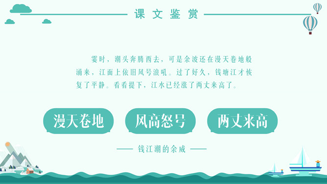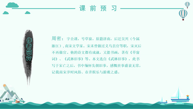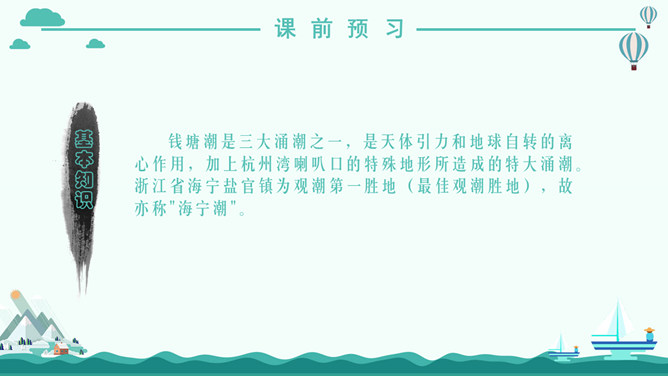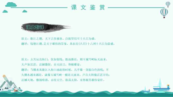 周密:字公谨,号草窗,原籍济南,后迁吴兴(今属浙江),南宋文学家。宋末曾做过义乌县官等职,宋灭后不再做官。他的诗文都有成就,又能书画,著有《草窗词》、《武林旧事》等。本文选自《武林旧事》,此书写于宋亡之后,书中缅怀先朝旧事,感慨世事盛衰无常,记载南宋岁时风俗、市井娱乐与游观之盛。海水白天涨落叫做潮,夜间涨落叫做汐,所以海水涨落也叫潮汐。潮汐现象是指海水在天体(主要是月球和太阳)引潮力作用下所产生的周期性运动,随着地球、月球和太阳的相对位置发生周期性变化,这种力的作用也呈周期性变化。于是,这种周期性的潮汐现象就出现在了人们面前。钱塘潮是三大涌潮之一,是天体引力和地球自转的离心作用,加上杭州湾喇叭口的特殊地形所造成的特大涌潮。浙江省海宁盐官镇为观潮第一胜地(最佳观潮胜地),故亦称"海宁潮"。原文:浙江之潮,天下之伟观也。自既望以至十八日为盛。翻译:钱塘江潮,是天下雄伟的景象。从农历(八月)十六到十八日为最盛。原文:方其远出海门,仅如银线;既而渐近,则玉城雪岭际天而来,大声如雷霆,震撼激射,吞天沃日,势极雄豪。翻译:当潮水从浙江入海口涌起的时候,几乎像一条银白色的线;不久潮水越来越近,就像玉城雪岭一般连天涌来,声音大得像雷霆万钧,震撼天地,激扬喷薄,吞没天空,涤荡太阳,来势极其雄伟豪壮。所属专题:观潮ppt。