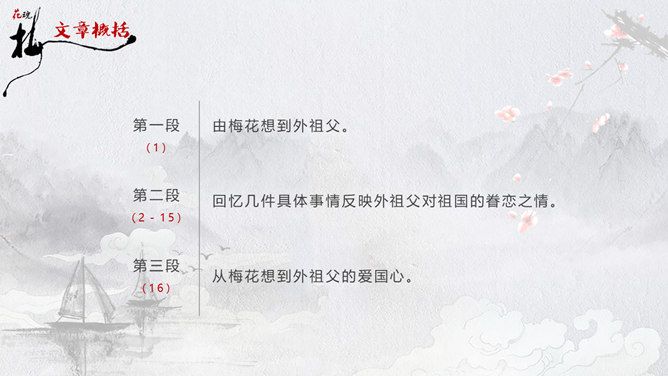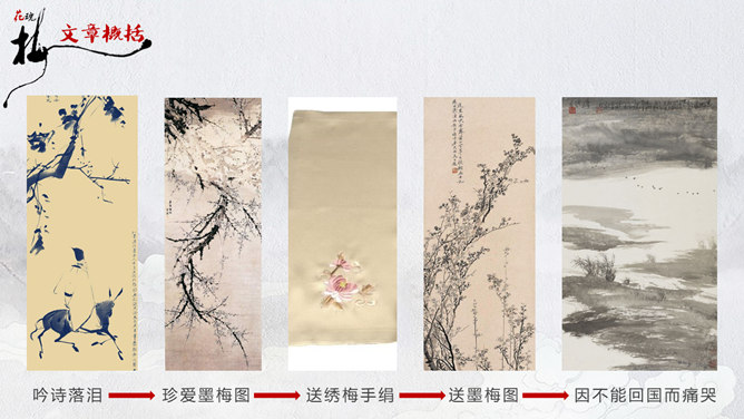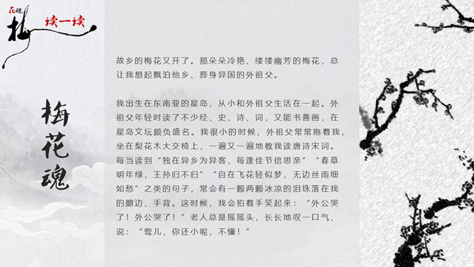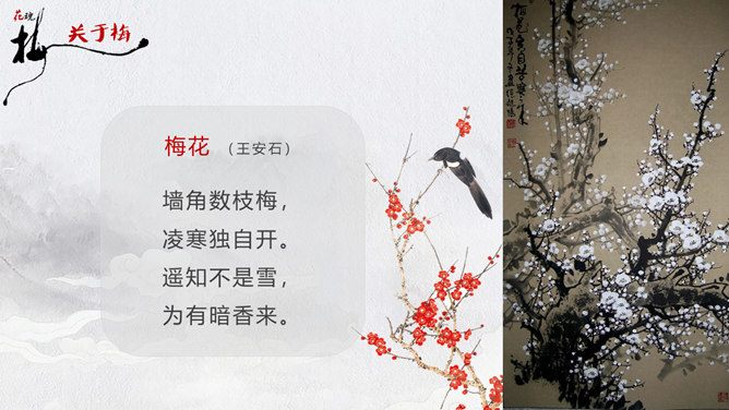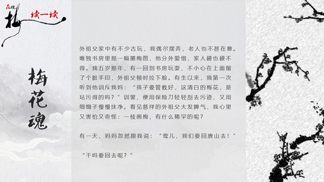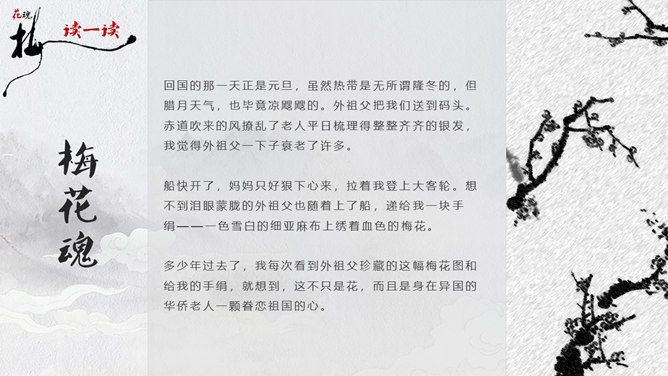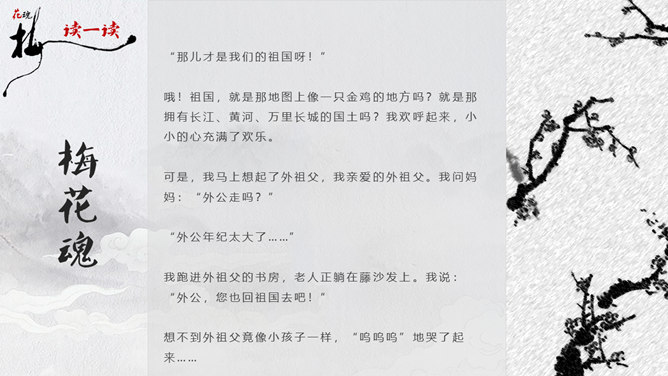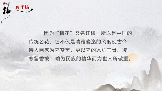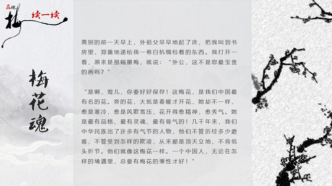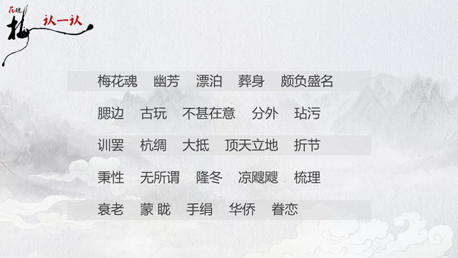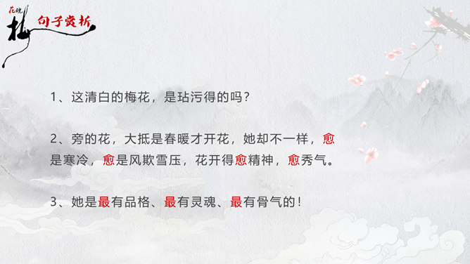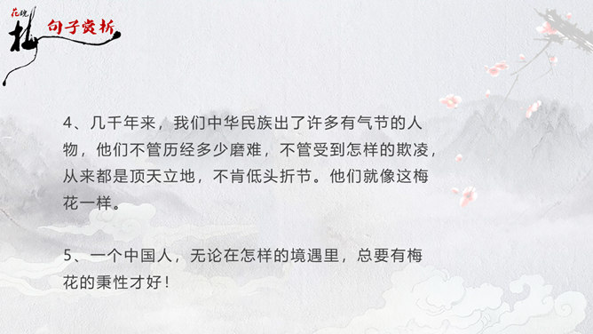 因为“梅花”又名红梅,所以是中国的传统名花。它不仅是清雅俊逸的风度使古今诗人画家为它赞美,更以它的冰肌玉骨、凌寒留香被 喻为民族的精华而为世人所敬重。梅花魂 幽芳 漂泊 葬身 颇负盛名 腮边 古玩 不甚在意 分外 玷污 训罢 杭绸 大抵 顶天立地 折节 秉性 无所谓 隆冬 凉飕飕 梳理 衰老 蒙 眬 手绢 华侨 1、这清白的梅花,是玷污得的吗? 2、旁的花,大抵是春暖才开花,她却不一样,愈是寒冷,愈是风欺雪压,花开得愈精神,愈秀气。3、她是最有品格、最有灵魂、最有骨气的!4、几千年来,我们中华民族出了许多有气节的人物,他们不管历经多少磨难,不管受到怎样的欺凌,从来都是顶天立地,不肯低头折节。他们就像这梅花一样。5、一个中国人,无论在怎样的境遇里,总要有梅花的秉性才好!梅花:不怕风欺雪压,有品格、有灵魂、有骨气。中华民族:顶天立地,不肯低头折节。所属专题:梅花魂ppt。