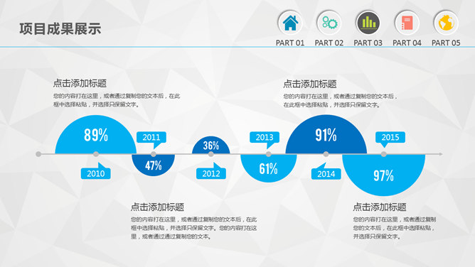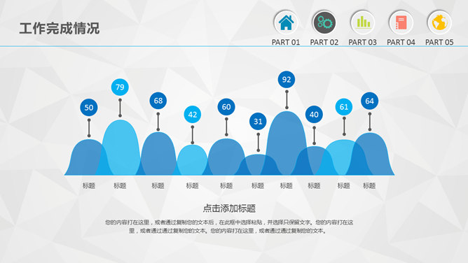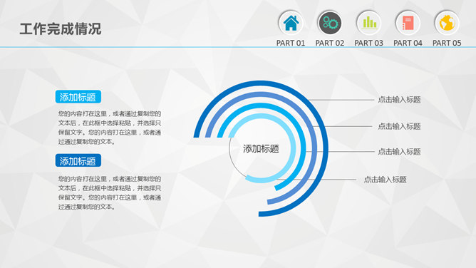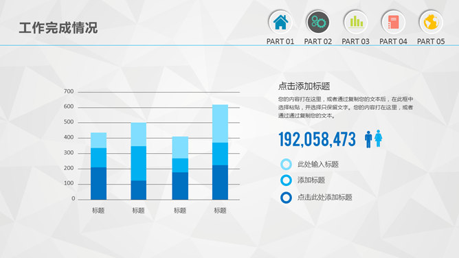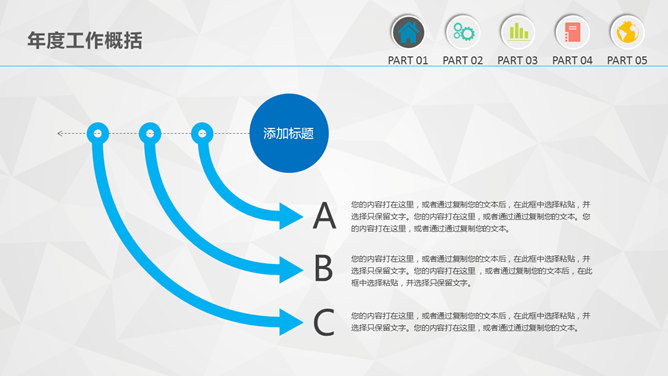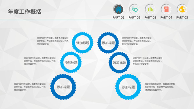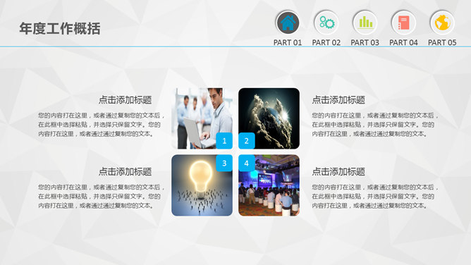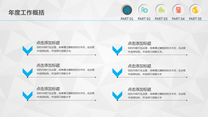 大气实用年度总结汇报PPT模板。一套年终工作总结汇报报告幻灯片模板,蓝灰配色,页面丰富,大气实用。