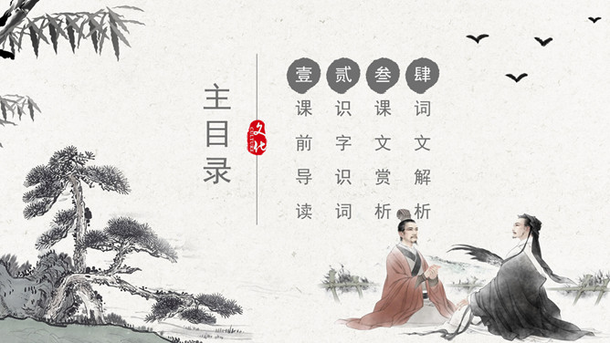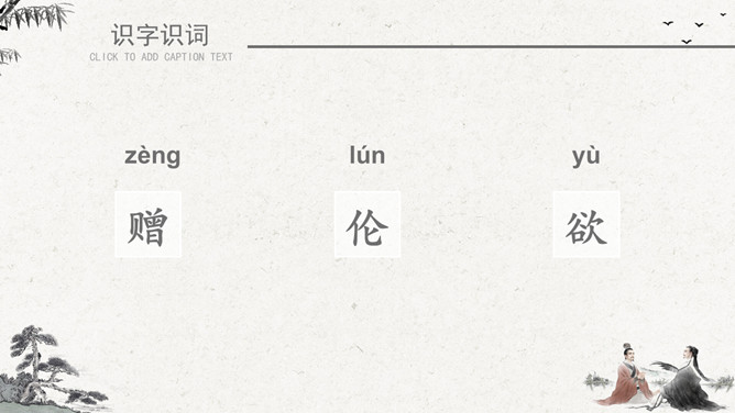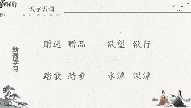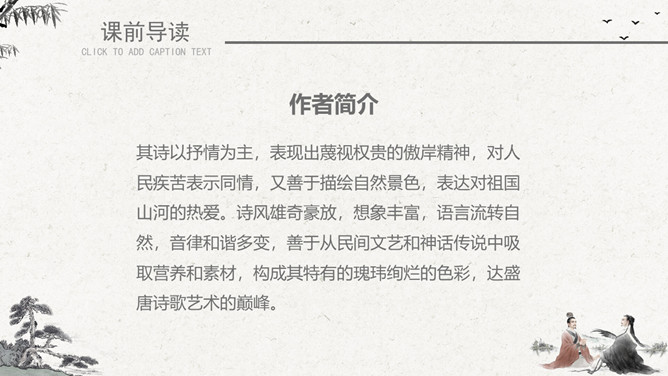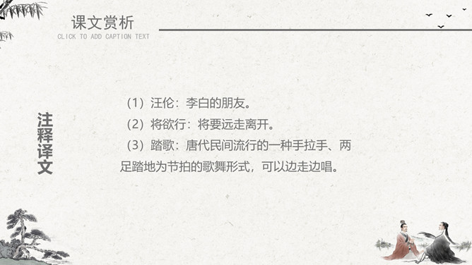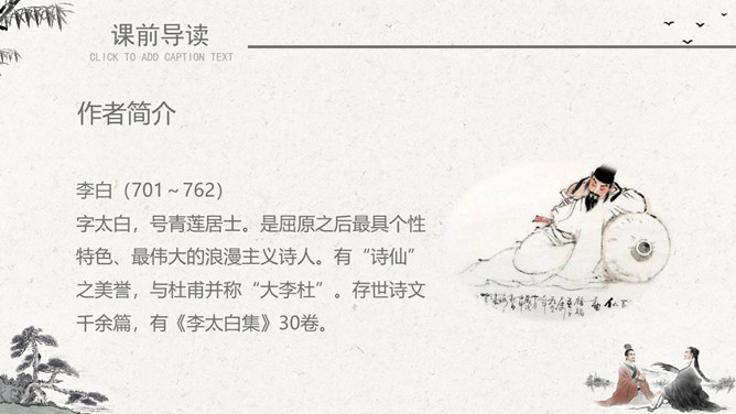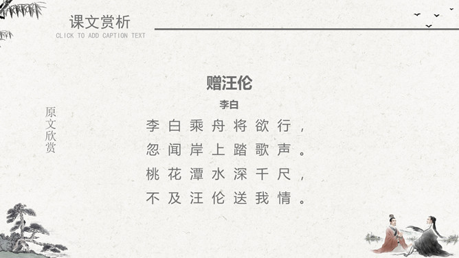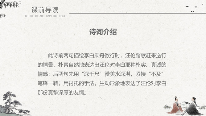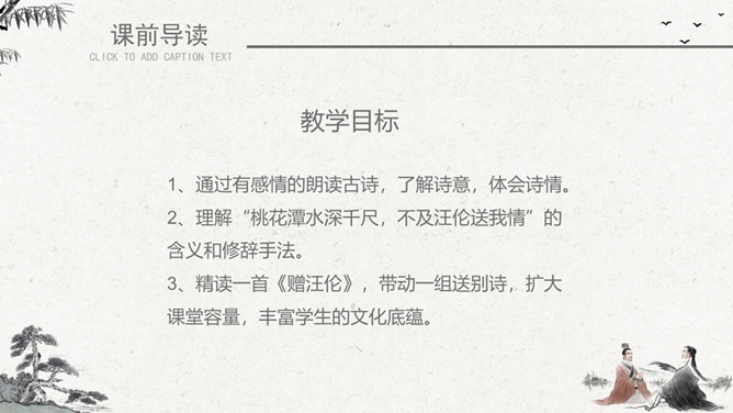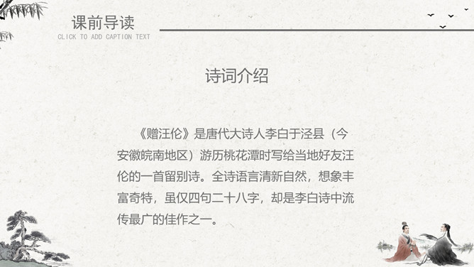 作者简介:李白(701~762)字太白,号青莲居士。是屈原之后最具个性特色、最伟大的浪漫主义诗人。有“诗仙”之美誉,与杜甫并称“大李杜”。存世诗文千余篇,有《李太白集》30卷。《赠汪伦》是唐代大诗人李白于泾县(今安徽皖南地区)游历桃花潭时写给当地好友汪伦的一首留别诗。全诗语言清新自然,想象丰富奇特,虽仅四句二十八字,却是李白诗中流传最广的佳作之一。教学目标:1、通过有感情的朗读古诗,了解诗意,体会诗情。2、理解“桃花潭水深千尺,不及汪伦送我情”的含义和修辞手法。3、精读一首《赠汪伦》,带动一组送别诗,扩大课堂容量,丰富学生的文化底蕴。白话译文:李白乘舟将要离别远行。忽然听见岸上踏地为节拍,有人边走边唱前来送行。桃花潭水即使深至千尺。也比不上汪伦送我之情。