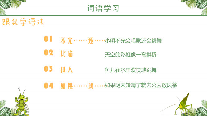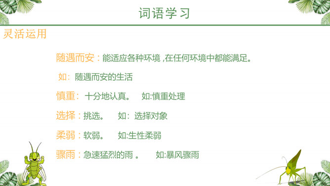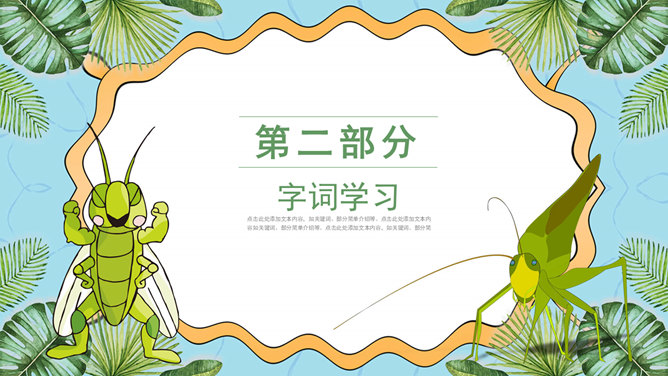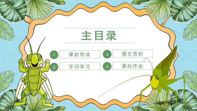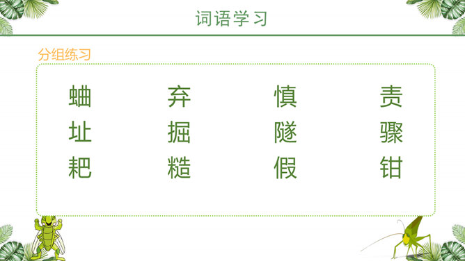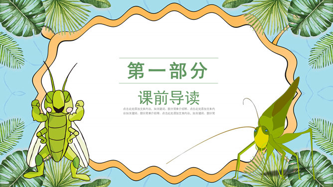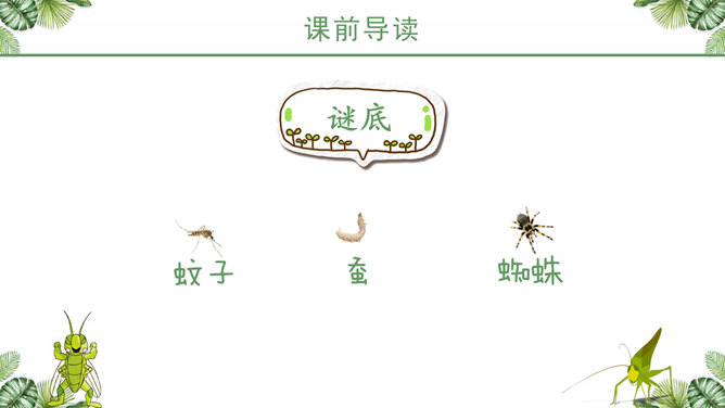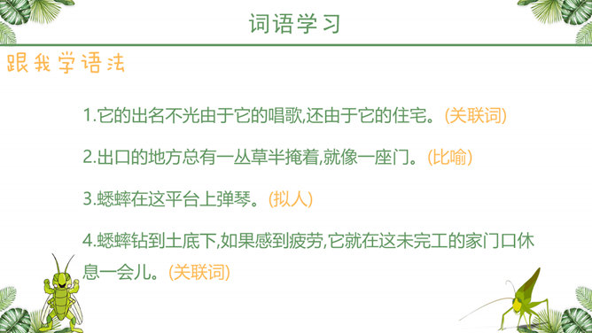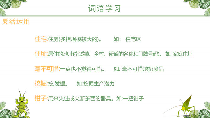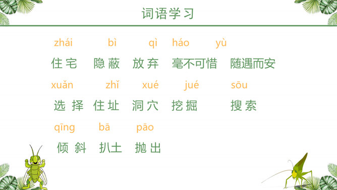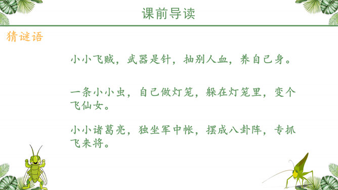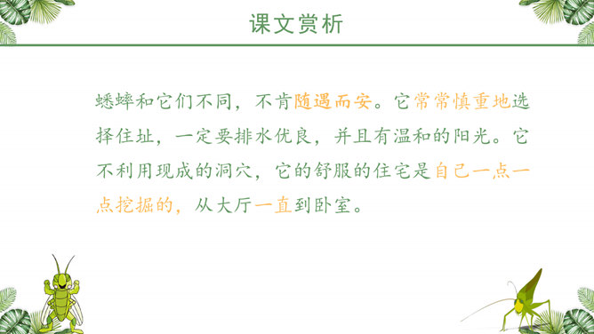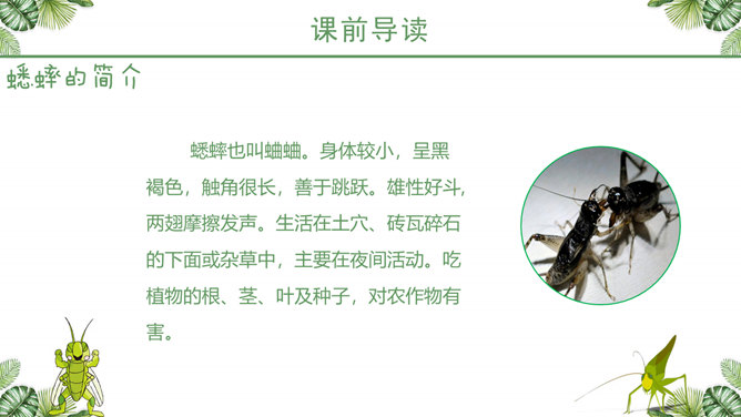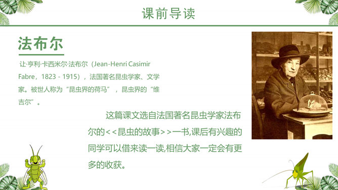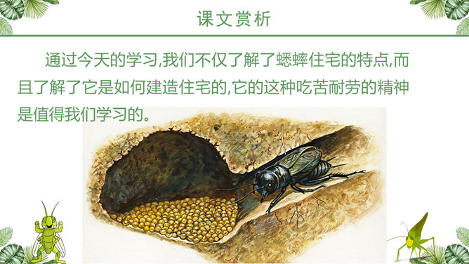 让·亨利·卡西米尔·法布尔(Jean-Henri Casimir Fabre,1823-1915),法国著名昆虫学家、文学家。被世人称为“昆虫界的荷马” ,昆虫界的“维吉尔”。这篇课文选自法国著名昆虫学家法布尔的<<昆虫的故事>>一书,课后有兴趣的同学可以借来读一读,相信大家一定会有更多的收获。蟋蟀也叫蛐蛐。身体较小,呈黑褐色,触角很长,善于跳跃。雄性好斗,两翅摩擦发声。生活在土穴、砖瓦碎石的下面或杂草中,主要在夜间活动。吃植物的根、茎、叶及种子,对农作物有害。小小飞贼,武器是针,抽别人血,养自己身。小小诸葛亮,独坐军中帐,摆成八卦阵,专抓飞来将。一条小小虫,自己做灯笼,躲在灯笼里,变个飞仙女。住宅:住房(多指规模较大的)。如:住宅区住址:居住的地址(指城镇、乡村、街道的名称和门牌号码)。如: 家庭住址毫不可惜:一点也不觉得可惜。如: 毫不可惜地扔废品。挖掘:挖,发掘。如:挖掘生产潜力。钳子:用来夹住或夹断东西的器具。如:一把钳子。1.它的出名不光由于它的唱歌,还由于它的住宅。(关联词)2.出口的地方总有一丛草半掩着,就像一座门。(比喻)3.蟋蟀在这平台上弹琴。(拟人)4.蟋蟀钻到土底下,如果感到疲劳,它就在这未完工的家门口休息一会儿。(关联词) 所属专题:蟋蟀的住宅ppt。
