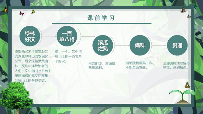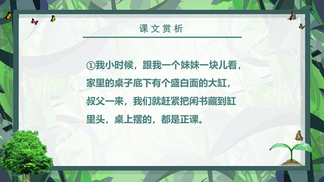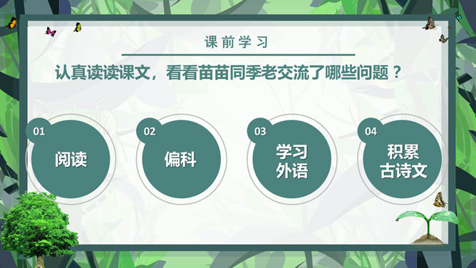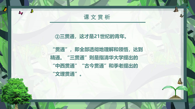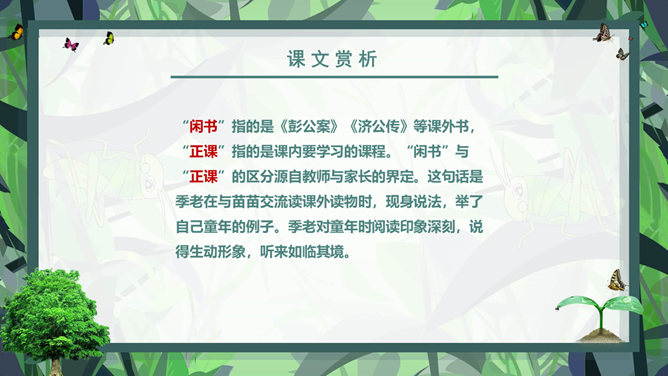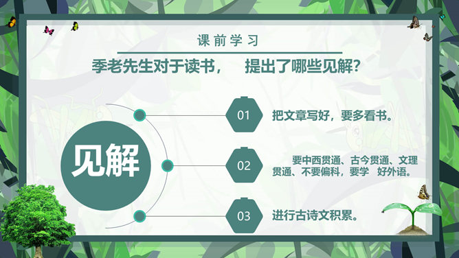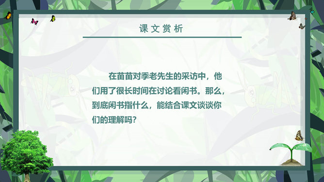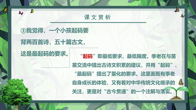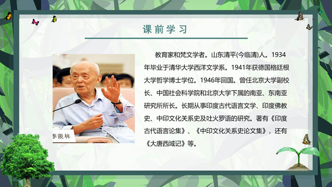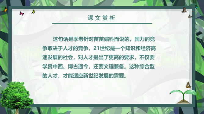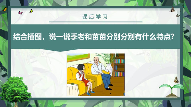 课前学习:教育家和梵文学者。山东清平(今临清)人。1934年毕业于清华大学西洋文学系。1941年获德国格廷根大学哲学博士学位。1946年回国。曾任北京大学副校长、中国社会科学院和北京大学下属的南亚、东南亚研究所所长。长期从事印度古代语言文学、印度佛教史、中印文化关系史及吐火罗语的研究。著有《印度古代语言论集》、《中印文化关系史论文集》,还有《大唐西域记》等。课后学习:结合插图,说一说季老和苗苗分别分别有什么特点?季老:平易近人,亲切随和,幽默中善于引导,满含着对下一代的关爱之情。苗苗:热爱读书的小学生,谦虚好问,对季老的充满着尊敬崇拜。1、课文中的“苗苗”和“大树”分别指的是谁?2、读了课文,你认为文中的“苗苗”和“大树”还有什么更深的含义吗?实际上“小苗”还包含着苗苗在求学和增长知识的路上刚刚起步,犹如破土而出的小苗要汲取营养;而季老学识渊博、学有建树,恰似一株根深叶茂的大树。“小苗”与“大树”交流的正是如何生长、汲取营养,小苗才会长成参天大树,像苗苗这样的孩子们才会成才的内容。