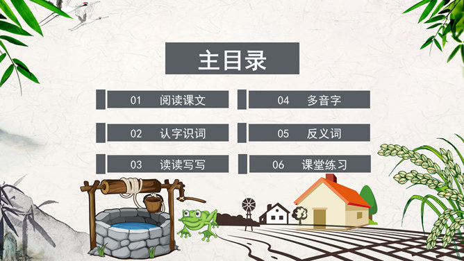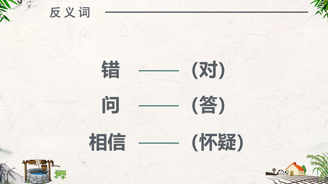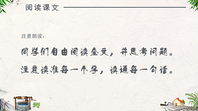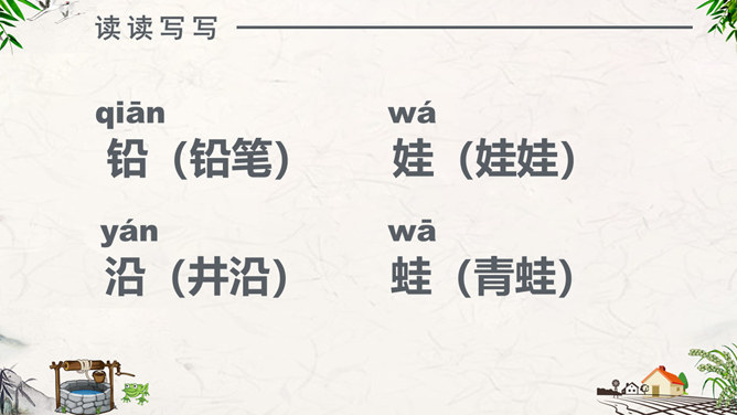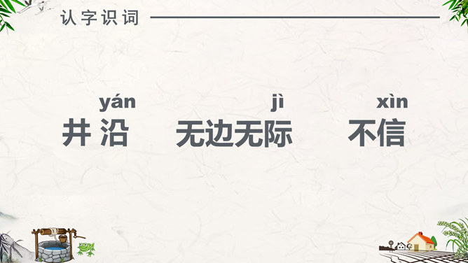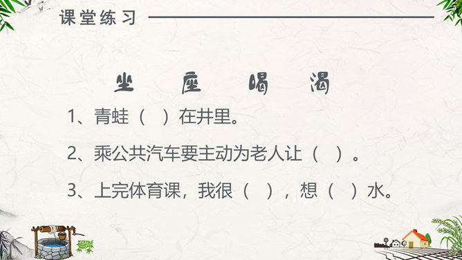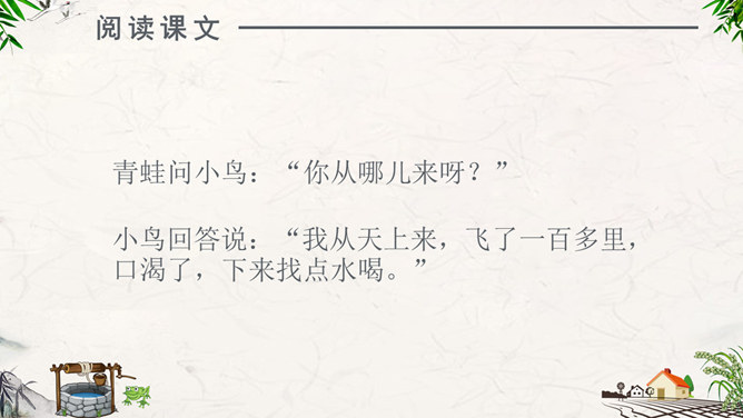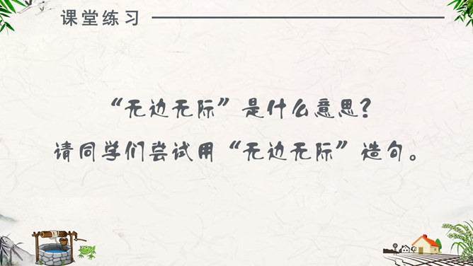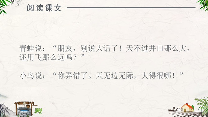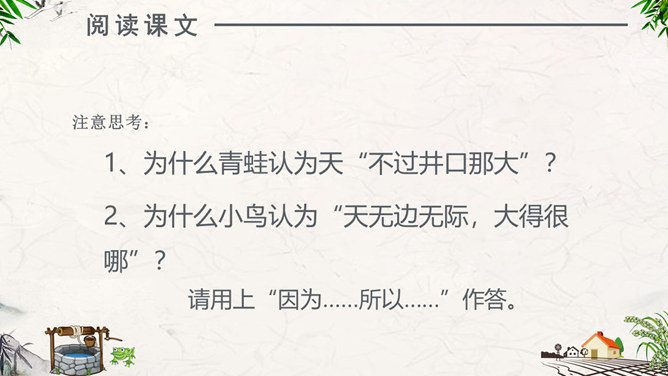 注意朗读:同学们自由阅读全文,并思考问题。注意读准每一个字,读通每一句话。注意思考:1、为什么青蛙认为天“不过井口那大”?2、为什么小鸟认为“天无边无际,大得很哪”?请用上“因为……所以……”作答。课堂练习:“无边无际”是什么意思?请同学们尝试用“无边无际”造句。1、青蛙( )在井里。2、乘公共汽车要主动为老人让( )。3、上完体育课,我很( ),想( )水。扩展活动:小组合作,续编第四次对话:青蛙如果真的跳出井口,他会看到什么,会说些什么?1.学生分小组合作学习,续编第四次对话,并分角色读一读。2.全班交流续编的对话。