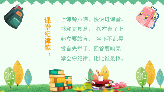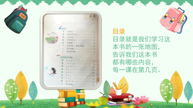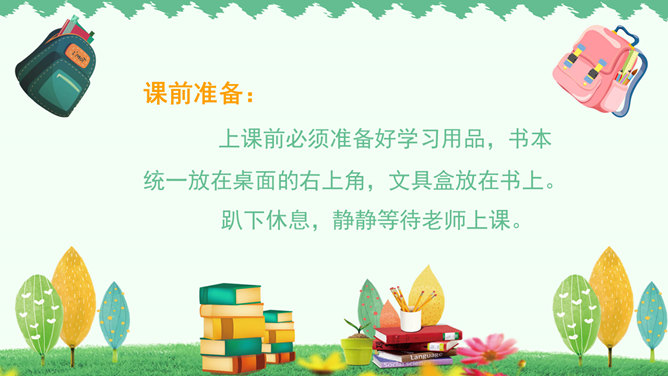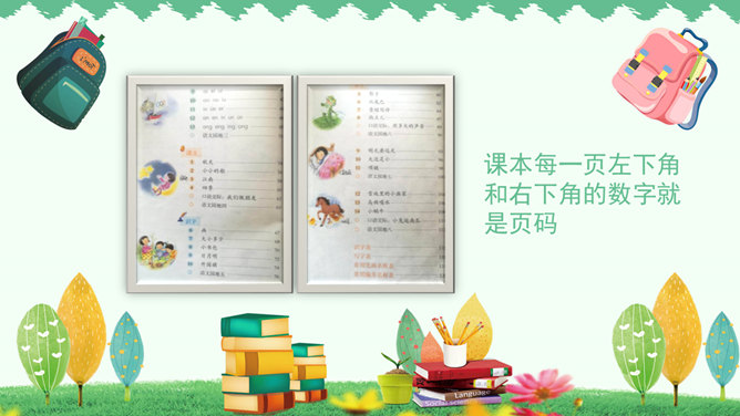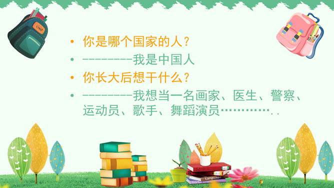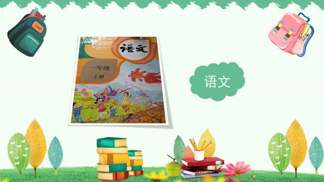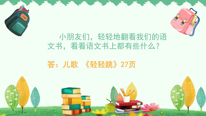 你是哪个国家的人?--------我是中国人。你长大后想干什么?--------我想当一名画家、医生、警察、运动员、歌手、舞蹈演员……同学们要实现理想,现在就要开始学习本领了,学校就是一个学习的乐园,小朋友们看一看我们都有哪些课程。课前准备:上课前必须准备好学习用品,书本统一放在桌面的右上角,文具盒放在书上。趴下休息,静静等待老师上课。举手发言:右手自然举起,五指并拢向上举直,肘部不离开桌面。课堂纪律歌:上课铃声响,快快进课堂。书和文具盒,摆在桌子上。起立要站直,坐下不乱晃。发言先举手,回答要响亮。学会守纪律,比比谁最棒。小朋友们,轻轻地翻看我们的语文书,看看语文书上都有些什么?答:儿歌《轻轻跳》27页。目录就是我们学习这本书的一张地图,告诉我们这本书都有哪些内容,每一课在第几页。课本每一页左下角和右下角的数字就是页码。考一考:试着找到识字第5课。打开课本第2第3页,看第一幅图回答问题:1、这是什么地方?2、画面上有什么人?3、他们在做什么?所属专题:我上学了ppt。