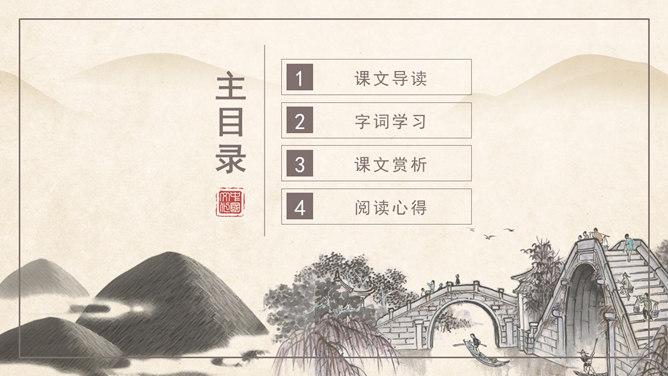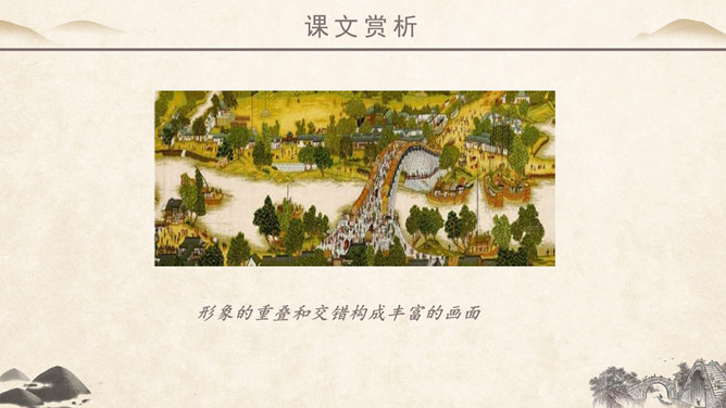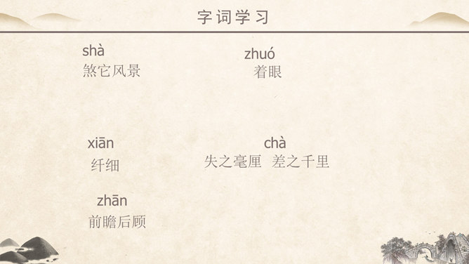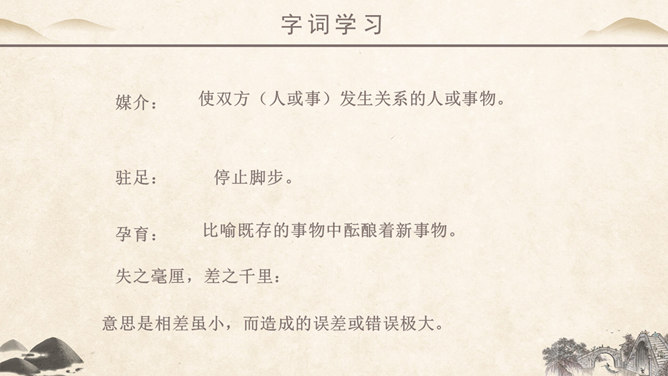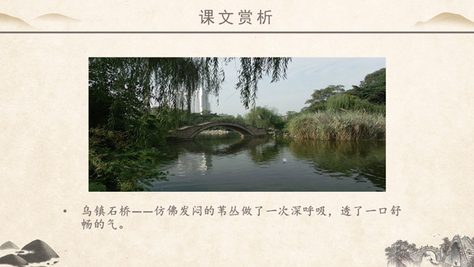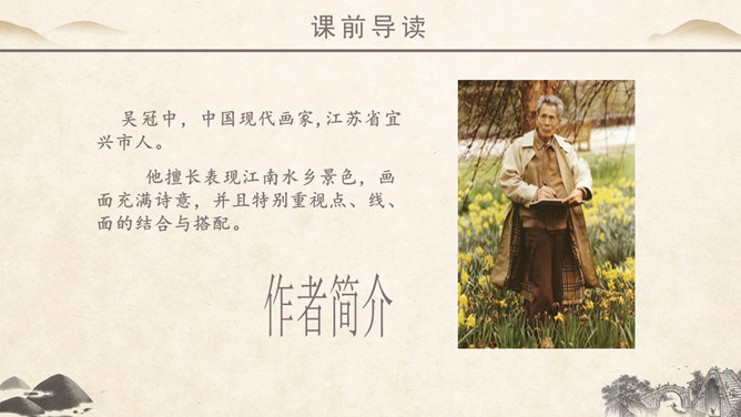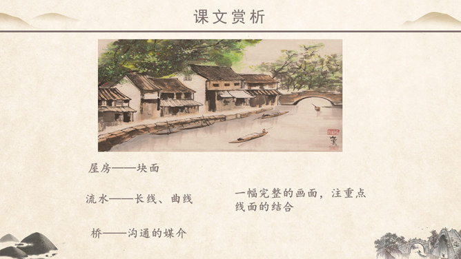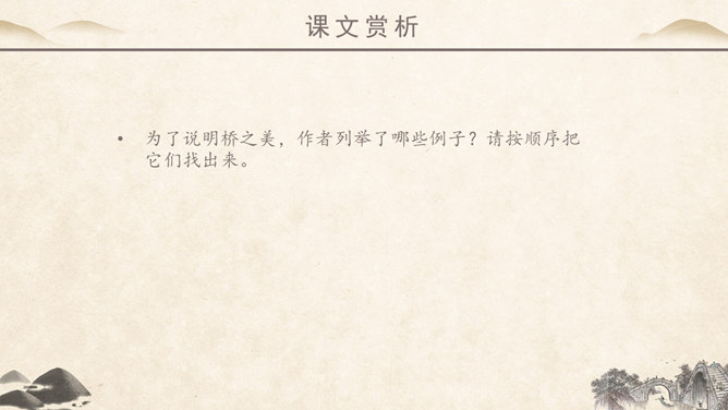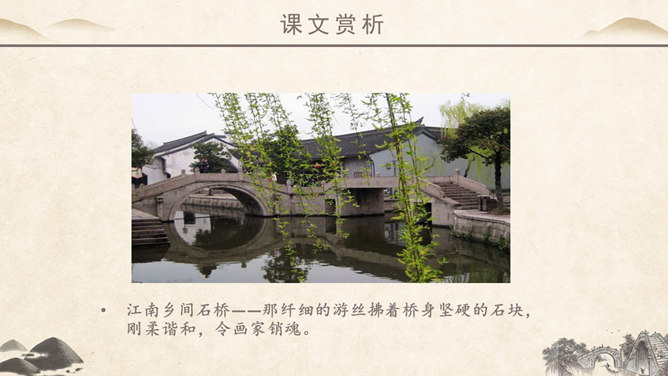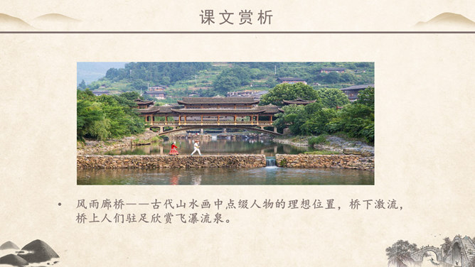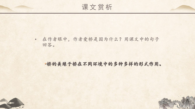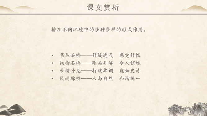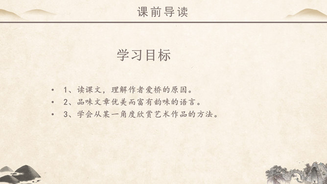 作者简介:吴冠中,中国现代画家,江苏省宜兴市人。他擅长表现江南水乡景色,画面充满诗意,并且特别重视点、线、面的结合与搭配。学习目标:1、读课文,理解作者爱桥的原因。2、品味文章优美而富有韵味的语言。3、学会从某一角度欣赏艺术作品的方法。字词学习:媒介:使双方(人或事)发生关系的人或事物。驻足:停止脚步。孕育:比喻既存的事物中酝酿着新事物。失之毫厘,差之千里:意思是相差虽小,而造成的误差或错误极大。在作者眼中,作者爱桥是因为什么?用课文中的句子回答。桥的美缘于桥在不同环境中的多种多样的形式作用。桥在不同环境中的多种多样的形式作用。苇丛石桥——舒缓透气 感觉舒畅。细柳石桥——刚柔并济 令人销魂。长桥卧龙——打破单调 宛如史诗。风雨廊桥——人与自然 和谐统一。“凡是起到构成及联系之关键作用的形象,其实也就具备了桥之美。”这是文章最末一句话,作用是什么? ①揭示规律②再次点题③总结全文。你认为文中描写的哪一座桥最美?找出描写这座桥的相关语句,美美地读一读,细细地品一品,然后说一段话。