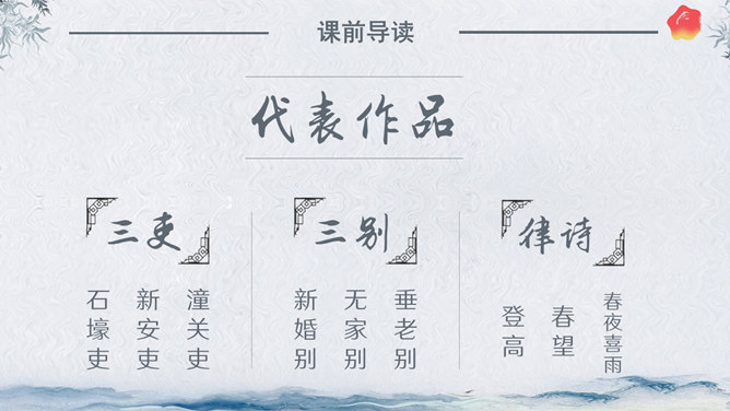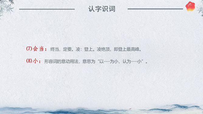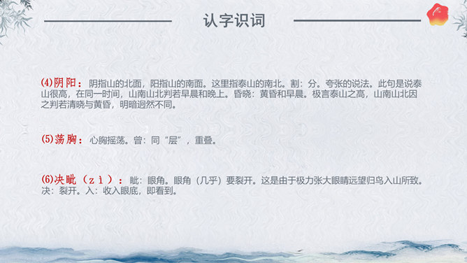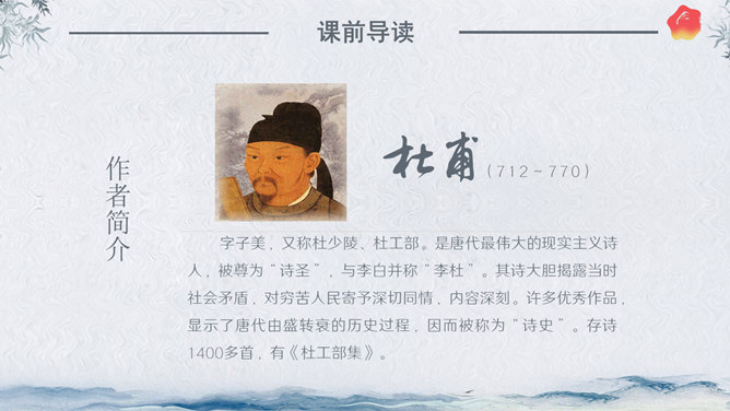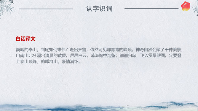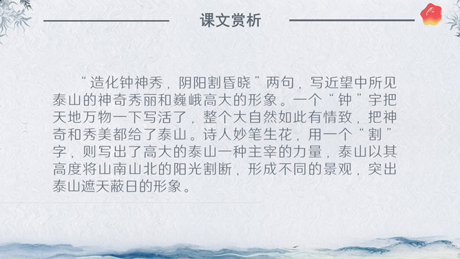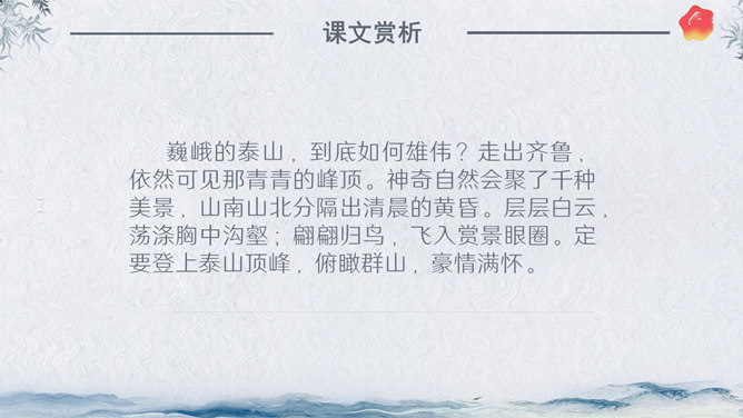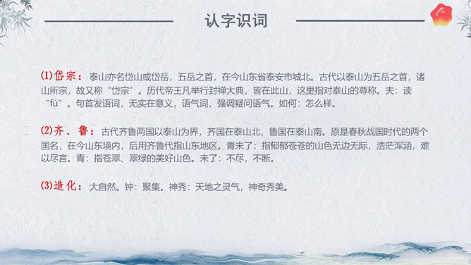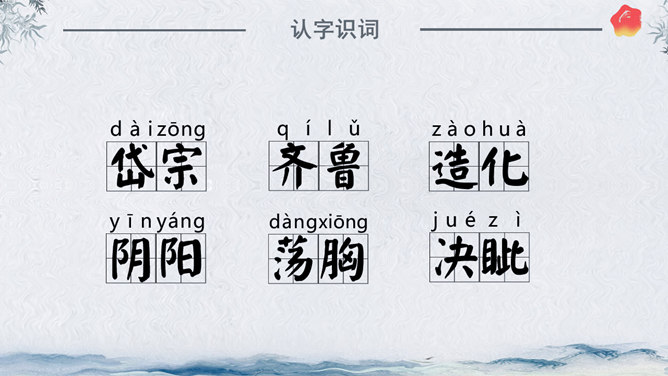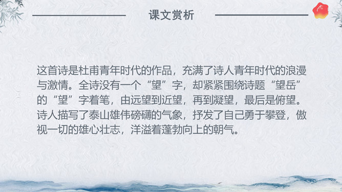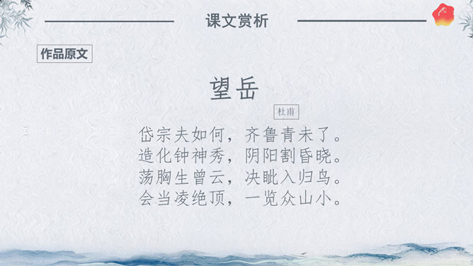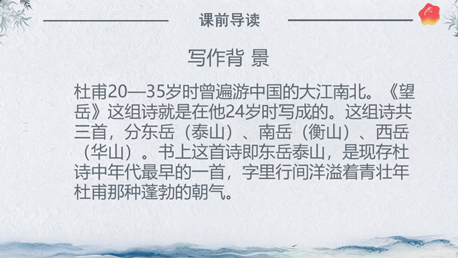 作者简介:杜甫,字子美,又称杜少陵、杜工部。是唐代最伟大的现实主义诗人,被尊为“诗圣”,与李白并称“李杜”。其诗大胆揭露当时社会矛盾,对穷苦人民寄予深切同情,内容深刻。许多优秀作品,显示了唐代由盛转衰的历史过程,因而被称为“诗史”。存诗1400多首,有《杜工部集》。写作背景:杜甫20—35岁时曾遍游中国的大江南北。《望岳》这组诗就是在他24岁时写成的。这组诗共三首,分东岳(泰山)、南岳(衡山)、西岳(华山)。书上这首诗即东岳泰山,是现存杜诗中年代最早的一首,字里行间洋溢着青壮年杜甫那种蓬勃的朝气。认字识词:⑴岱宗:泰山亦名岱山或岱岳,五岳之首,在今山东省泰安市城北。古代以泰山为五岳之首,诸山所宗,故又称“岱宗”。历代帝王凡举行封禅大典,皆在此山,这里指对泰山的尊称。夫:读“fú”。句首发语词,无实在意义,语气词,强调疑问语气。如何:怎么样。⑵齐、鲁:古代齐鲁两国以泰山为界,齐国在泰山北,鲁国在泰山南。原是春秋战国时代的两个国名,在今山东境内,后用齐鲁代指山东地区。青未了:指郁郁苍苍的山色无边无际,浩茫浑涵,难以尽言。青:指苍翠、翠绿的美好山色。未了:不尽,不断。⑶造化:大自然。钟:聚集。神秀:天地之灵气,神奇秀美。所属专题:望岳ppt。
