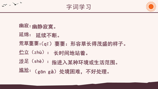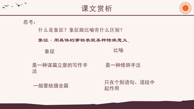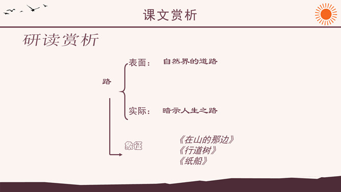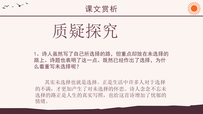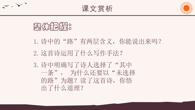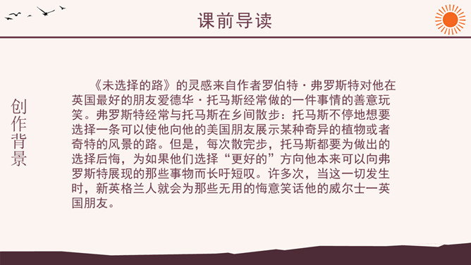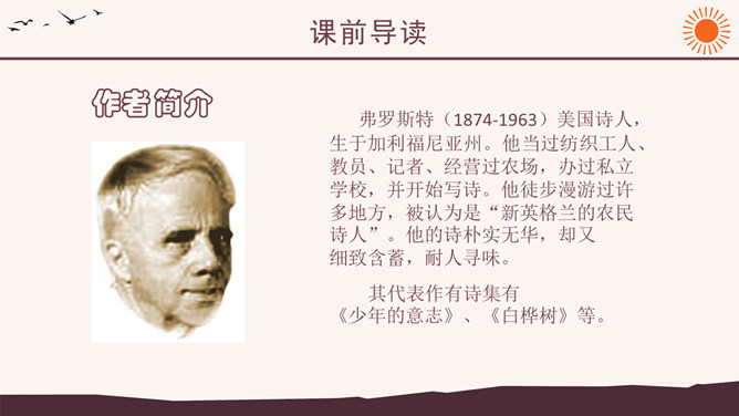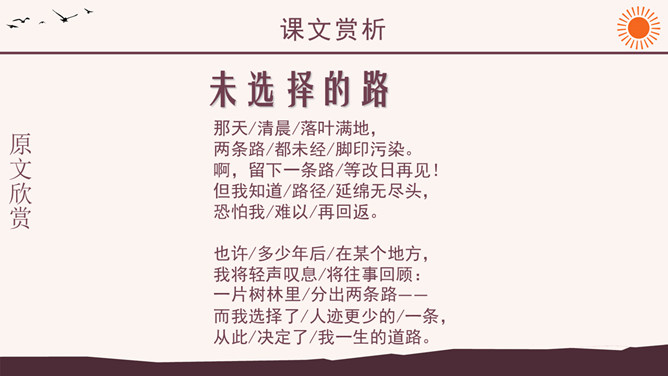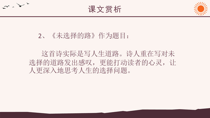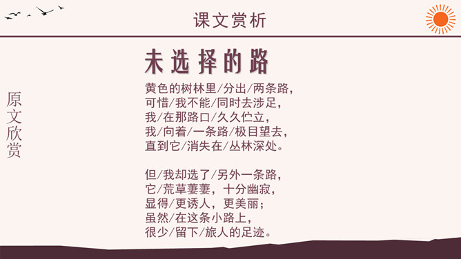 作者简介:弗罗斯特(1874-1963)美国诗人,生于加利福尼亚州。他当过纺织工人、教员、记者、经营过农场,办过私立学校,并开始写诗。他徒步漫游过许多地方,被认为是“新英格兰的农民诗人”。他的诗朴实无华,却又细致含蓄,耐人寻味。其代表作有诗集有《少年的意志》、《白桦树》等。 创作背景:《未选择的路》的灵感来自作者罗伯特·弗罗斯特对他在英国最好的朋友爱德华·托马斯经常做的一件事情的善意玩笑。弗罗斯特经常与托马斯在乡间散步:托马斯不停地想要选择一条可以使他向他的美国朋友展示某种奇异的植物或者奇特的风景的路。但是,每次散完步,托马斯都要为做出的选择后悔,为如果他们选择“更好的”方向他本来可以向弗罗斯特展现的那些事物而长吁短叹。许多次,当这一切发生时,新英格兰人就会为那些无用的悔意笑话他的威尔士一英国朋友。诗中的“路”有两层含义,你能说出来吗?这首诗运用了什么写作手法?诗中明确写了诗人选择了“其中一条”, 为什么还要以“未选择的路”为题?读了这首诗,你悟出了什么道理?1、诗人虽然写了自己所选择的路,但重点却放在未选择的路上。诗题也表明了这一点。既然已经作出了选择,为什么着重写未选择呢?其实未选择也就是选择。正是生活中许多人对于选择的不满,才更加产生了对未选择的怀恋。诗人念念不忘未选择的路正是人生的真实写照,也给这首诗增加了忧郁的情绪。所属专题:未选择的路ppt。