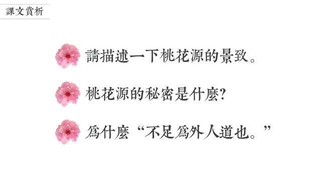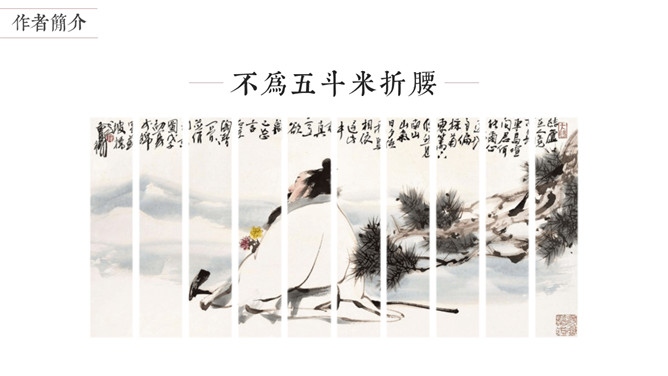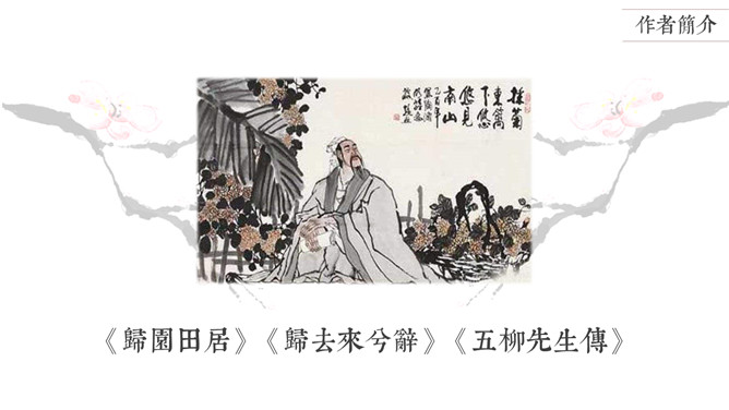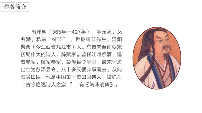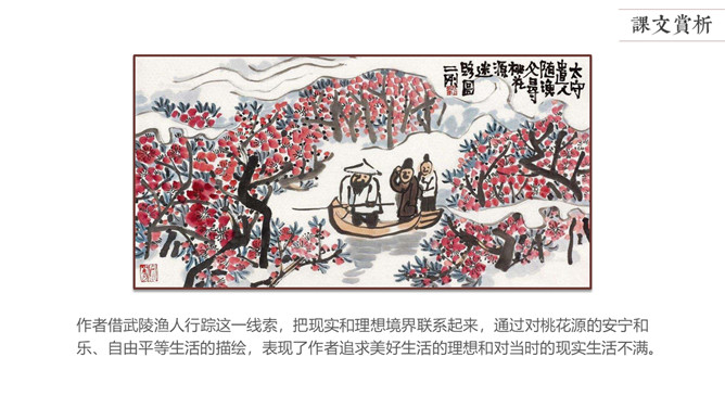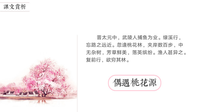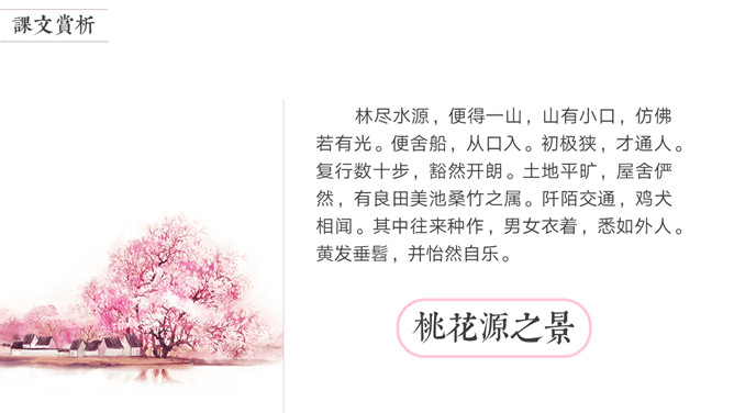 陶渊明是中国第一位田园诗人,被称为“古今隐逸诗人之宗 ”,有《陶渊明集》。东晋太元年间,武陵郡有个人以打渔为生。一天,他顺着溪水行船,忘记了路程的远近。忽然遇到一片桃花林,生长在溪水的两岸,长达几百步,中间没有别的树,花草鲜嫩美丽,落花纷纷的散在地上。渔人对此感到十分诧异,继续往前行船,想走到林子的尽头。桃林的尽头就是溪水的发源地,于是便出现一座山,山上有个小洞口,洞里仿佛有点光亮。于是他下了船,从洞口进去了。起初洞口很狭窄,仅容一人通过。又走了几十步,突然变得开阔明亮了。眼前是一片平坦宽广的土地,一排排整齐的房舍。还有肥沃的田地、美丽的池沼,桑树竹林之类的。田间小路交错相通,鸡鸣狗叫到处可以听到。人们在田野里来来往往耕种劳作,男女的穿戴跟桃花源以外的世人完全一样。老人和小孩们个个都安适愉快,自得其乐。所属专题:桃花源记ppt。