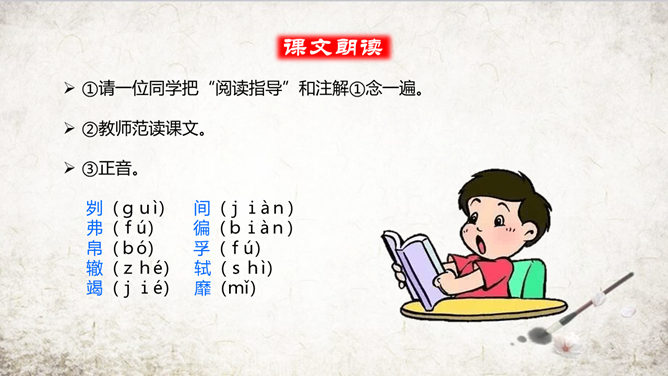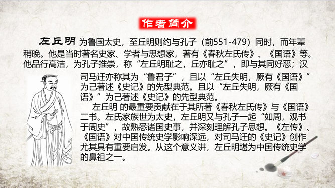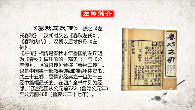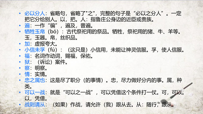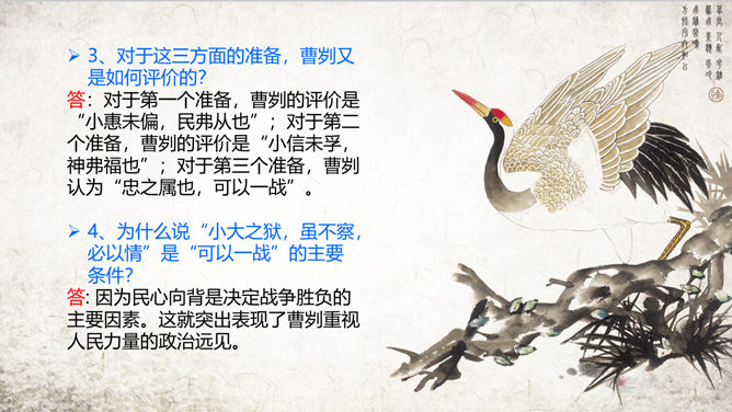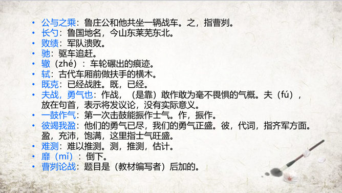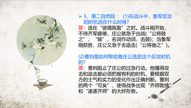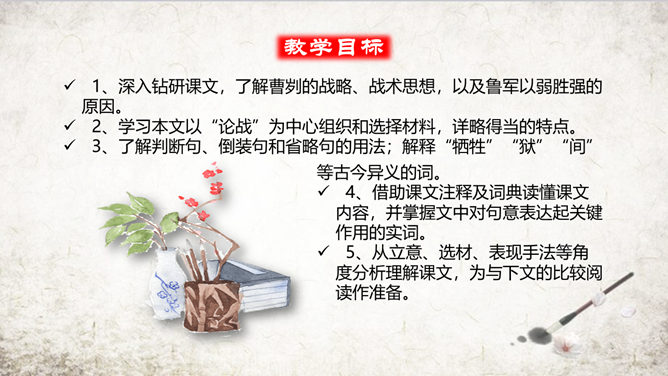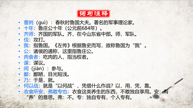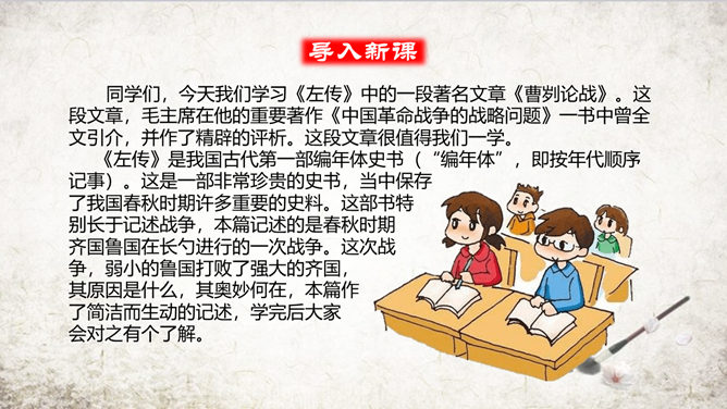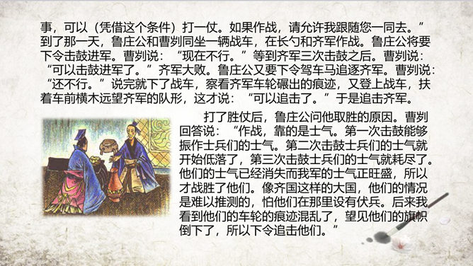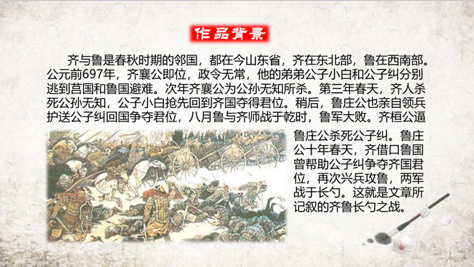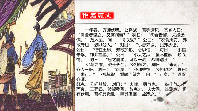 同学们,今天我们学习《左传》中的一段著名文章《曹刿论战》。这段文章,毛主席在他的重要著作《中国革命战争的战略问题》一书中曾全文引介,并作了精辟的评析。这段文章很值得我们一学。《左传》是我国古代第一部编年体史书(“编年体”,即按年代顺序记事)。这是一部非常珍贵的史书,当中保存了我国春秋时期许多重要的史料。这部书特别长于记述战争,本篇记述的是春秋时期齐国鲁国在长勺进行的一次战争。这次战争,弱小的鲁国打败了强大的齐国,其原因是什么,其奥妙何在,本篇作了简洁而生动的记述,学完后大家会对之有个了解。1、深入钻研课文,了解曹刿的战略、战术思想,以及鲁军以弱胜强的原因。2、学习本文以“论战”为中心组织和选择材料,详略得当的特点。3、了解判断句、倒装句和省略句的用法;解释“牺牲”“狱”“间”等古今异义的词。4、借助课文注释及词典读懂课文内容,并掌握文中对句意表达起关键作用的实词。5、从立意、选材、表现手法等角度分析理解课文,为与下文的比较阅读作准备。所属专题:曹刿论战ppt。