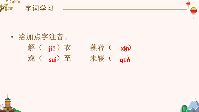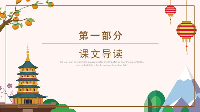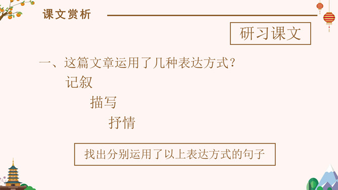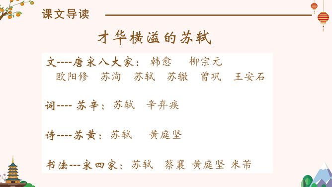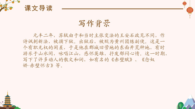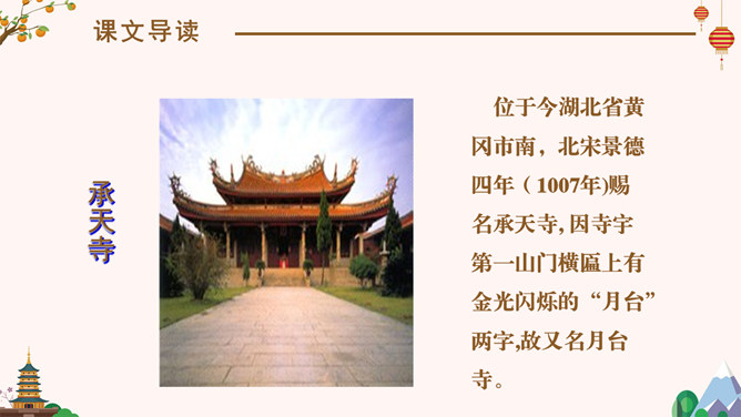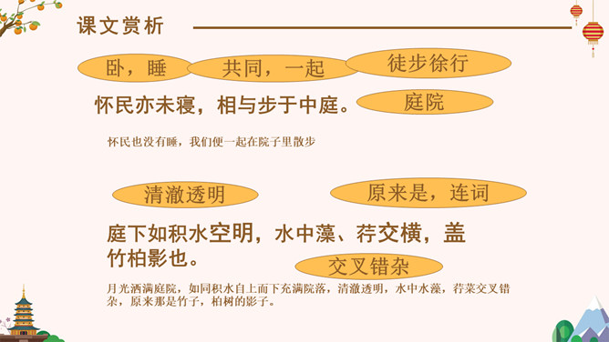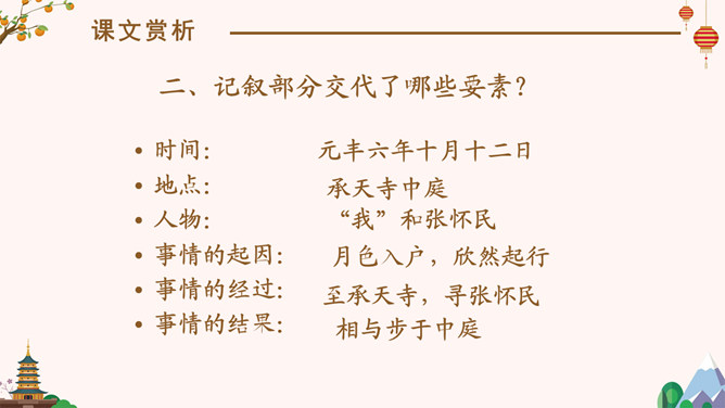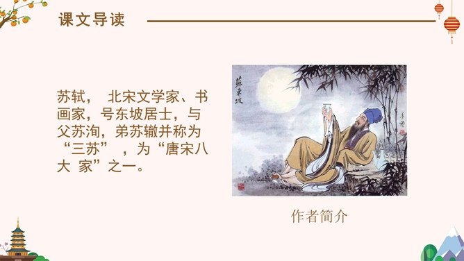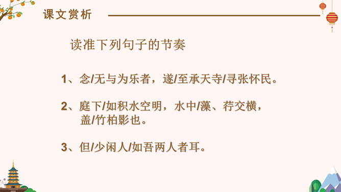 作者简介:苏轼, 北宋文学家、书画家,号东坡居士,与父苏洵,弟苏辙并称为“三苏” ,为“唐宋八大 家”之一。写作背景:元丰二年,苏轼由于和当时主张变法的王安石政见不同,作诗讽刺新法,被捕下狱。出狱后,被贬为黄州团练副使。这是一个有职无权的闲差,于是他在郡城旧营地的东面开荒种地,有时游乐于山水间,咏唱江山,感怀英雄,抒发郁闷心情。这一时期,写下了许多动人的散文和词,如有名的《赤壁赋》、《念奴娇·赤壁怀古》等。课文简说:本文写于元丰六年(1083年),当时,作者被贬到黄州已经有四年了。作者写了这篇短文,对月夜的景色作了美妙的描绘,真实地记录了他当时生活的一个小片段。承天寺:位于今湖北省黄冈市南,北宋景德四年(1007年)赐名承天寺, 因寺宇第一山门横匾上有金光闪烁的“月台”两字,故又名月台寺。问题探究:全文没有一处直接写友情,但可以从字里行间看出来。请找出能表现苏轼与张怀民友情的句子(写出两句),并以其中一句为例,说说你选择它的理由。①遂至承天寺。 理由:唯张怀民可以同乐。②怀民亦未寝 。 理由:心境相同,欣赏趣味相同。③相与步于中庭。 理由:关系亲密。④但少闲人如吾两人者耳。 理由:志同道合,志趣相投,命运相同。所属专题:记承天寺夜游ppt。