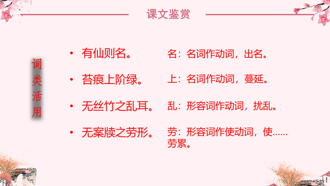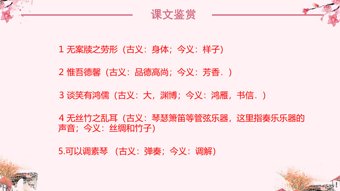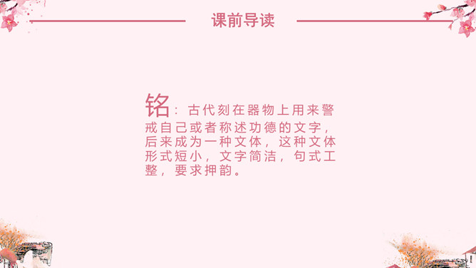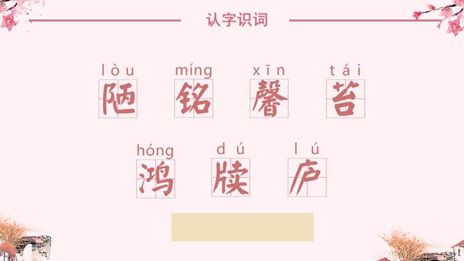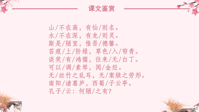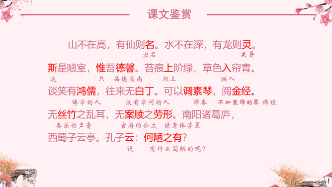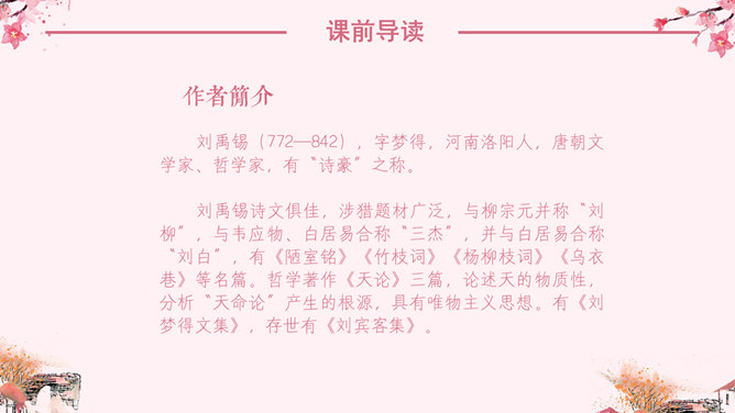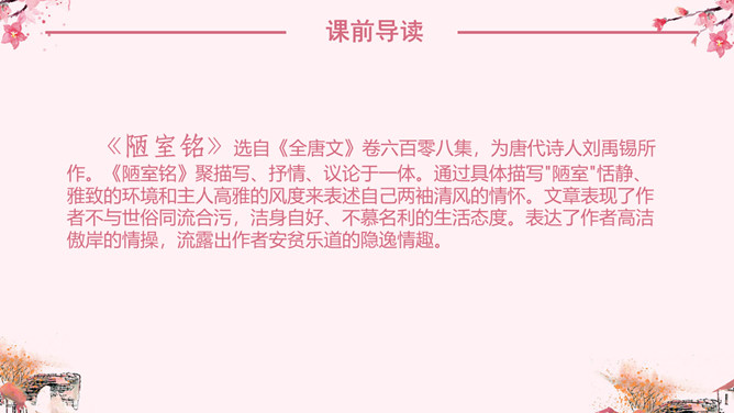 作者简介:刘禹锡(772—842),字梦得,河南洛阳人,唐朝文学家、哲学家,有“诗豪”之称。刘禹锡诗文俱佳,涉猎题材广泛,与柳宗元并称“刘柳”,与韦应物、白居易合称“三杰”,并与白居易合称“刘白”,有《陋室铭》《竹枝词》《杨柳枝词》《乌衣巷》等名篇。哲学著作《天论》三篇,论述天的物质性,分析“天命论”产生的根源,具有唯物主义思想。有《刘梦得文集》,存世有《刘宾客集》。《陋室铭》选自《全唐文》卷六百零八集,为唐代诗人刘禹锡所作。《陋室铭》聚描写、抒情、议论于一体。通过具体描写"陋室"恬静、雅致的环境和主人高雅的风度来表述自己两袖清风的情怀。文章表现了作者不与世俗同流合污,洁身自好、不慕名利的生活态度。表达了作者高洁傲岸的情操,流露出作者安贫乐道的隐逸情趣。铭:古代刻在器物上用来警戒自己或者称述功德的文字,后来成为一种文体,这种文体形式短小,文字简洁,句式工整,要求押韵。所属专题:陋室铭ppt。