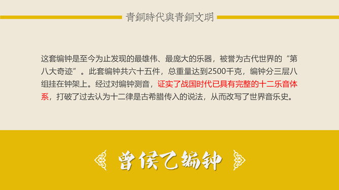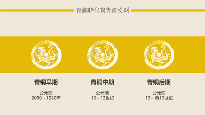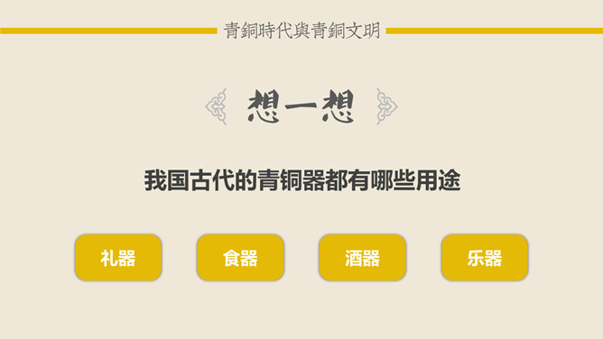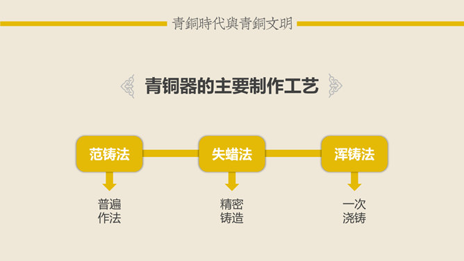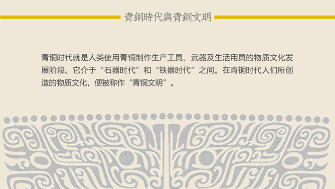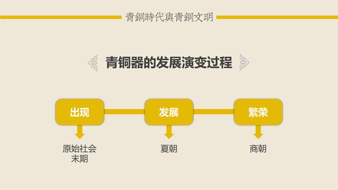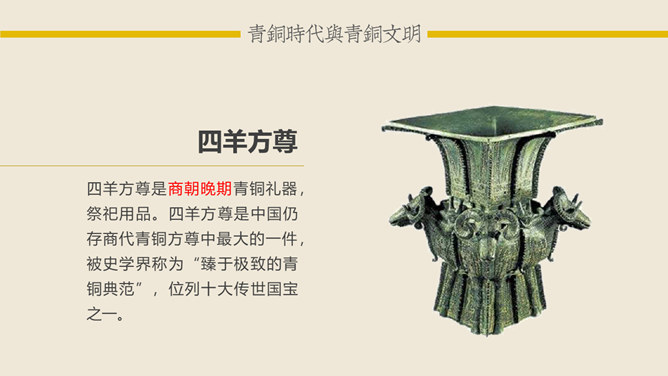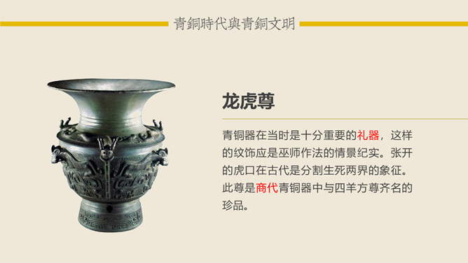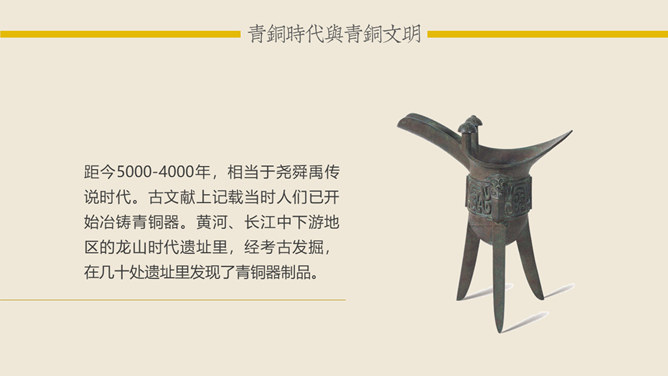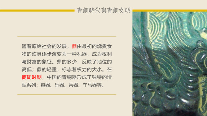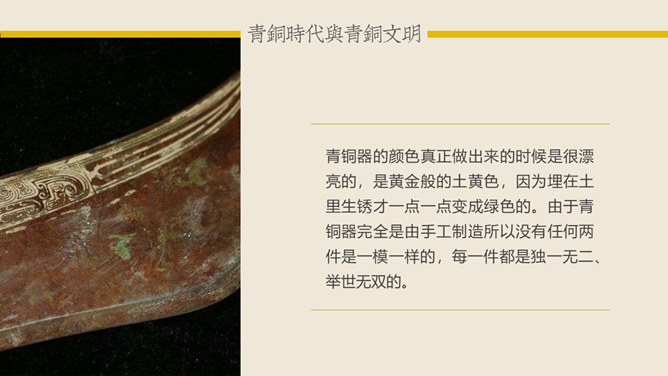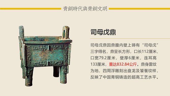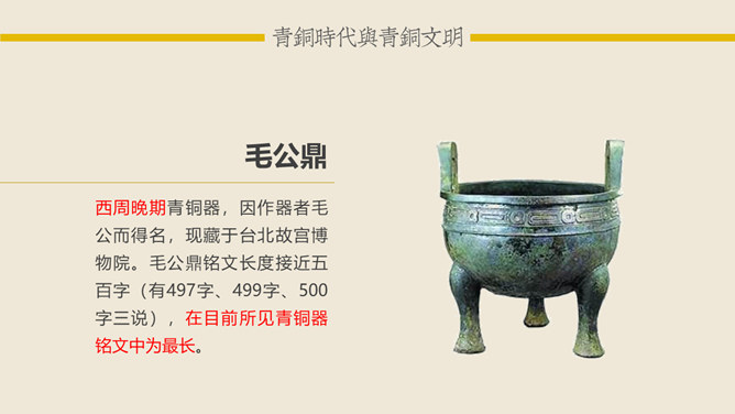 青铜时代与青铜文明:青铜时代就是人类使用青铜制作生产工具、武器及生活用具的物质文化发展阶段。它介于“石器时代”和“铁器时代”之间。在青铜时代人们所创造的物质文化,便被称作“青铜文明”。距今5000-4000年,相当于尧舜禹传说时代。古文献上记载当时人们已开始冶铸青铜器。黄河、长江中下游地区的龙山时代遗址里,经考古发掘,在几十处遗址里发现了青铜器制品。青铜器的颜色真正做出来的时候是很漂亮的,是黄金般的土黄色,因为埋在土里生锈才一点一点变成绿色的。由于青铜器完全是由手工制造所以没有任何两件是一模一样的,每一件都是独一无二、举世无双的。随着原始社会的发展,鼎由最初的烧煮食物的炊具逐步演变为一种礼器,成为权利与财富的象征。鼎的多少,反映了地位的高低;鼎的轻重,标志着权力的大小。在商周时期,中国的青铜器形成了独特的造型系列:容器、乐器、兵器、车马器等。鸮尊为古代盛酒器。铜尊,最早见于商代。鸮,俗称猫头鹰。在古代,鸮是人们最喜爱和崇拜的神鸟。鸮的形象是古代艺术品经常采用的原形。西周晚期青铜器,因作器者毛公而得名,现藏于台北故宫博物院。毛公鼎铭文长度接近五百字(有497字、499字、500字三说),在目前所见青铜器铭文中为最长。