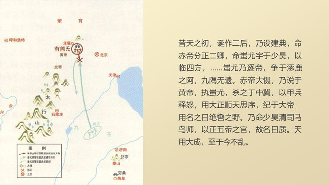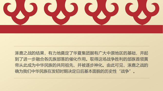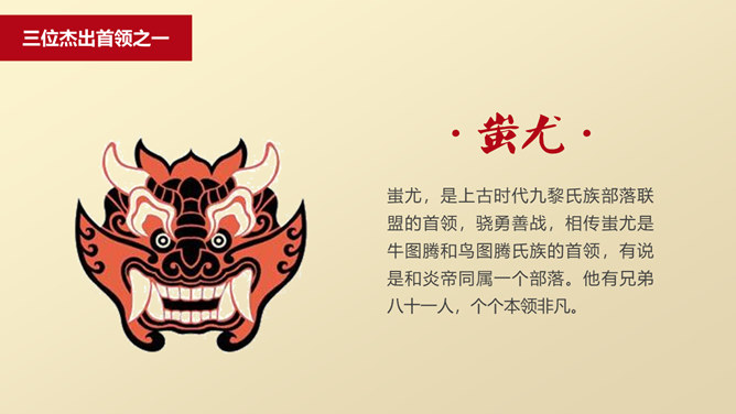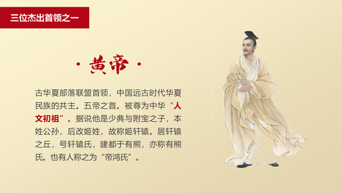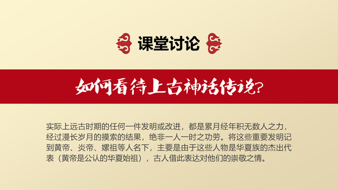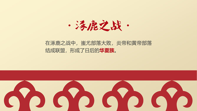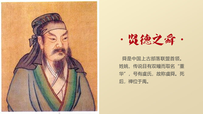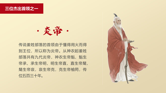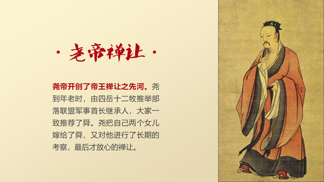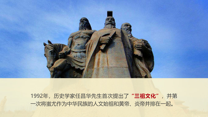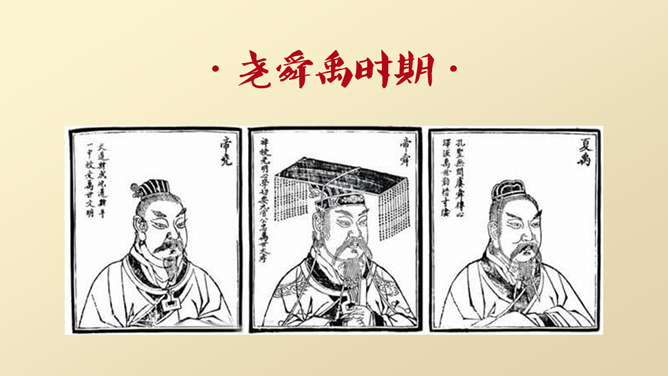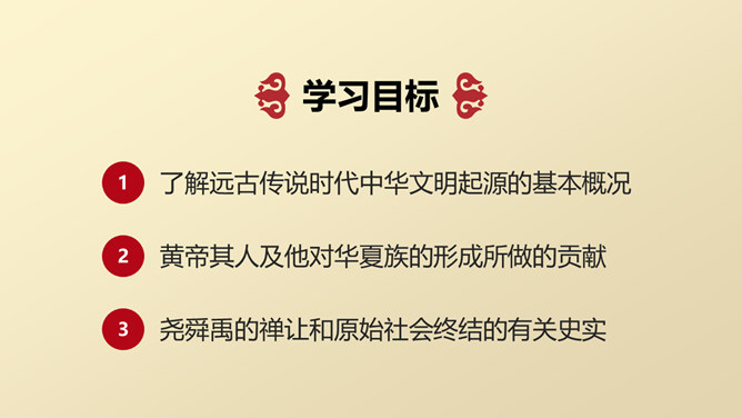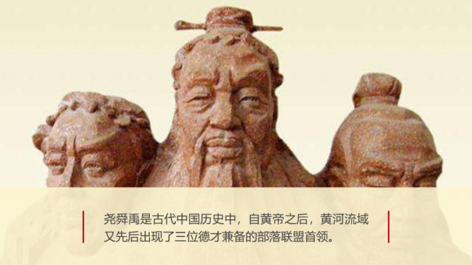 学习目标:了解远古传说时代中华文明起源的基本概况。黄帝其人及他对华夏族的形成所做的贡献。尧舜禹的禅让和原始社会终结的有关史实。传说姜姓部落的首领由于懂得用火而得到王位,所以称为炎帝。从神农起姜姓部落共有九代炎帝,神农生帝魁,魁生帝承,承生帝明,明生帝直,直生帝氂,氂生帝哀,哀生帝克,克生帝榆罔,传位五百三十年。古华夏部落联盟首领,中国远古时代华夏民族的共主。五帝之首。被尊为中华“人文初祖”。据说他是少典与附宝之子,本姓公孙,后改姬姓,故称姬轩辕。居轩辕之丘,号轩辕氏,建都于有熊,亦称有熊氏。也有人称之为“帝鸿氏”。蚩尤,是上古时代九黎氏族部落联盟的首领,骁勇善战,相传蚩尤是牛图腾和鸟图腾氏族的首领,有说是和炎帝同属一个部落。他有兄弟八十一人,个个本领非凡。1992年,历史学家任昌华先生首次提出了“三祖文化”,并第一次将蚩尤作为中华民族的人文始祖和黄帝、炎帝并排在一起。涿鹿之战的结果,有力地奠定了华夏集团据有广大中原地区的基础,并起到了进一步融合各氏族部落的催化作用。取得这场战争胜利的部族首领黄帝从此成为中华民族的共同祖先,并被逐步神化。由此可见,涿鹿之战的确为我们中华民族在发轫时期决定日后基本面貌的历史性“战争”。