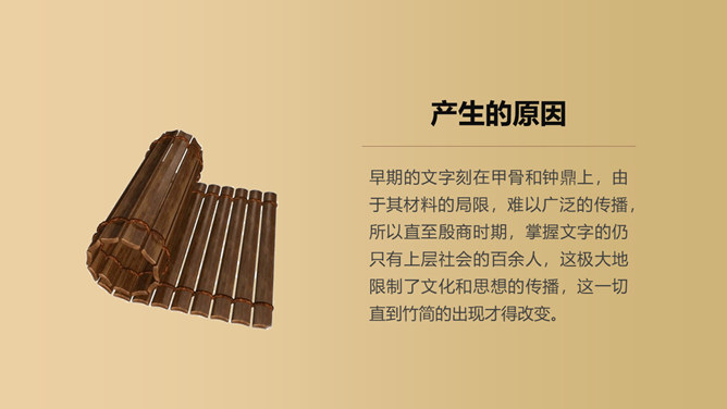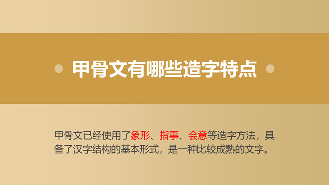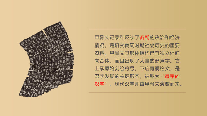 仓颉造字:仓颉造字是中国古代神话传说之一。仓颉,轩辕黄帝史官,曾把流传于先民中的文字加以搜集、整理和使用,在汉字创造的过程中起了重要作用,他根据野兽的脚印研究出了汉字,为中华民族的繁衍和昌盛做出了不朽的功绩。甲骨文的故事:甲骨文,是中国的一种古代文字,又称“契文”、“甲骨卜辞”、殷墟文字或“龟甲兽骨文”。是汉字的早期形式,是现存中国王朝时期最古老的一种成熟文字,最早出土于河南省安阳市殷墟。属于上古汉语(old chinese),而非上古或者原始的其他语系的语言。甲骨文有哪些造字特点:甲骨文已经使用了象形、指事、会意等造字方法,具备了汉字结构的基本形式,是一种比较成熟的文字。甲骨文记录和反映了商朝的政治和经济情况,是研究商周时期社会历史的重要资料。甲骨文其形体结构已有独立体趋向合体,而且出现了大量的形声字。它上承原始刻绘符号,下启青铜铭文,是汉字发展的关键形态,被称为“最早的汉字”。现代汉字即由甲骨文演变而来。竹简,古代用来写字的竹片,也指写了字的竹片。战国至魏晋时代的书写材料。是削制成的狭长竹片(也有木片,称木简),牍比简宽厚,竹制称竹牍,木制称木牍。均用毛笔墨书。