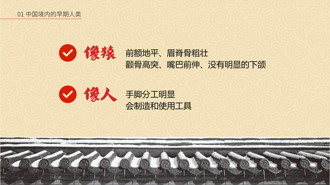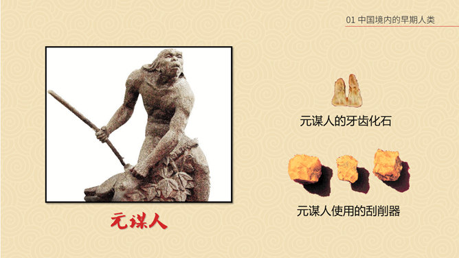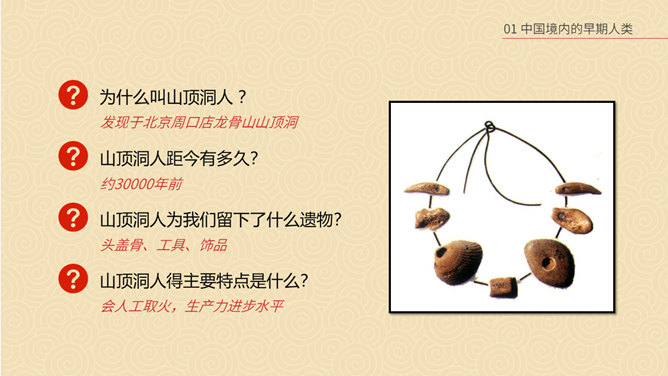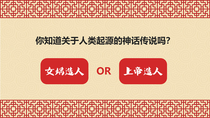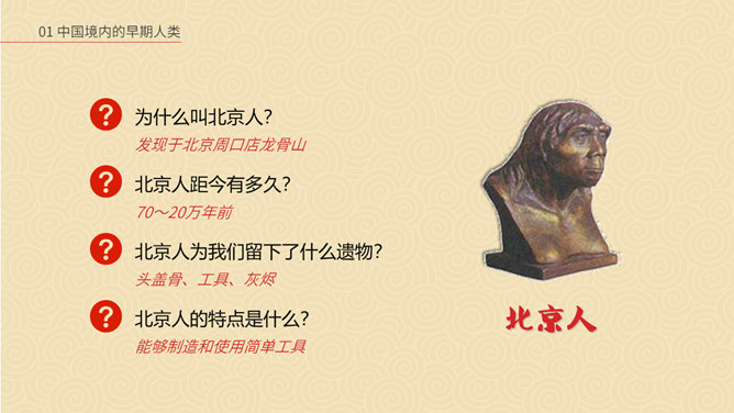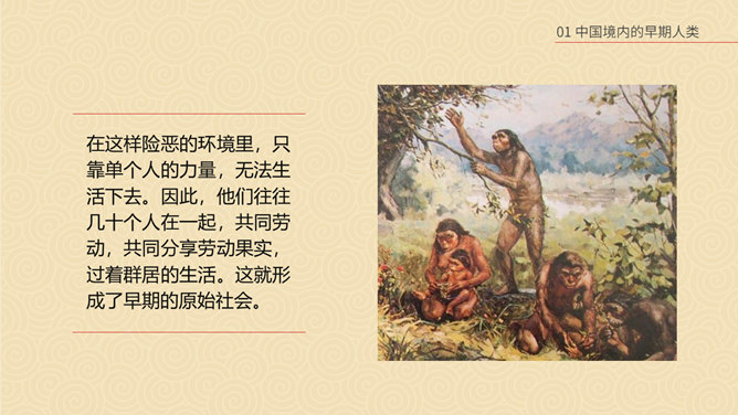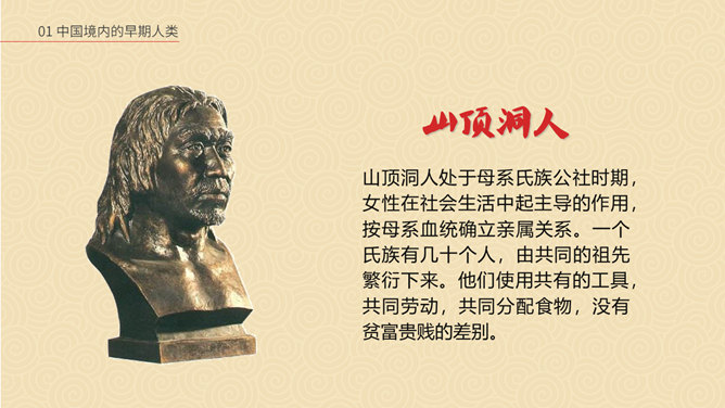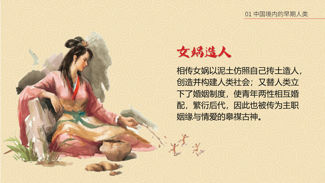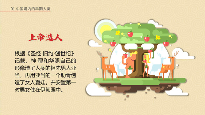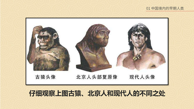 相传女娲以泥土仿照自己抟土造人,创造并构建人类社会;又替人类立下了婚姻制度,使青年两性相互婚配,繁衍后代,因此也被传为主职姻缘与情爱的皋禖古神。根据《圣经·旧约·创世纪》记载,神·耶和华照自己的形像造了人类的祖先男人亚当,再用亚当的一个肋骨创造了女人夏娃,并安置第一对男女住在伊甸园中。仔细观察上图古猿、北京人和现代人的不同之处。想一想:北京人是如何得到火种的?北京人用火来干什么?火的使用有什么样的意义?山顶洞人处于母系氏族公社时期,女性在社会生活中起主导的作用,按母系血统确立亲属关系。一个氏族有几十个人,由共同的祖先繁衍下来。他们使用共有的工具,共同劳动,共同分配食物,没有贫富贵贱的差别。想一想,与北京人相比,山顶洞人的生活有哪些进步?北京人还保留着猿的某些特征,而山顶洞人的模样和现代人基本相同。北京人使用打制石器,山顶洞人已掌握磨光和钻孔技术。北京人使用天然火,而山顶洞人已会人工取火。北京人过群居生活,而山顶洞人过氏族公社生活。