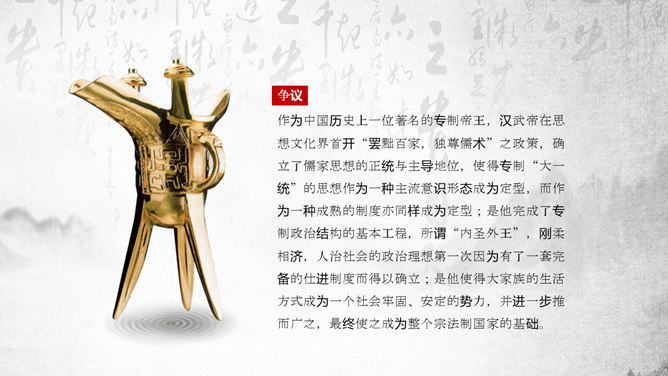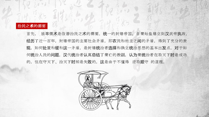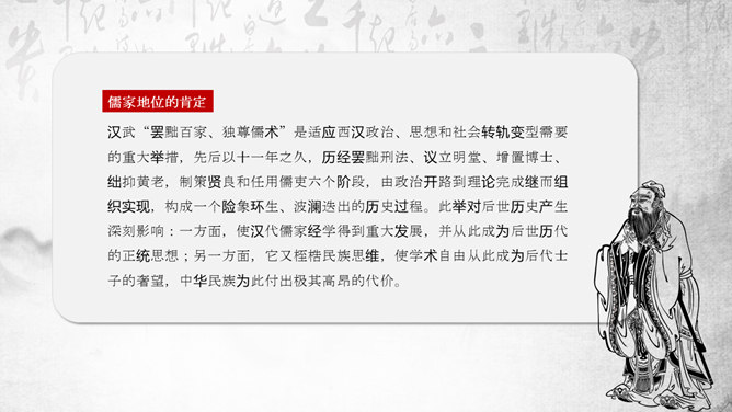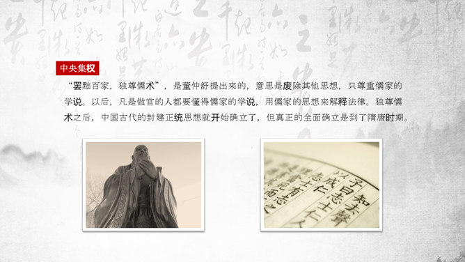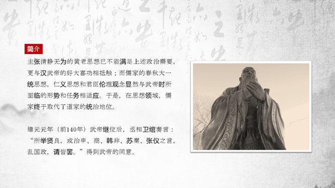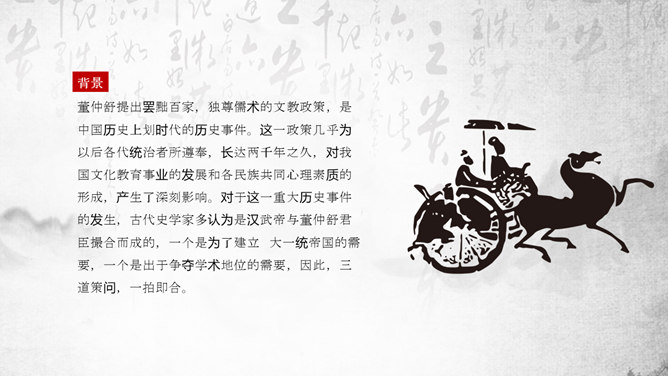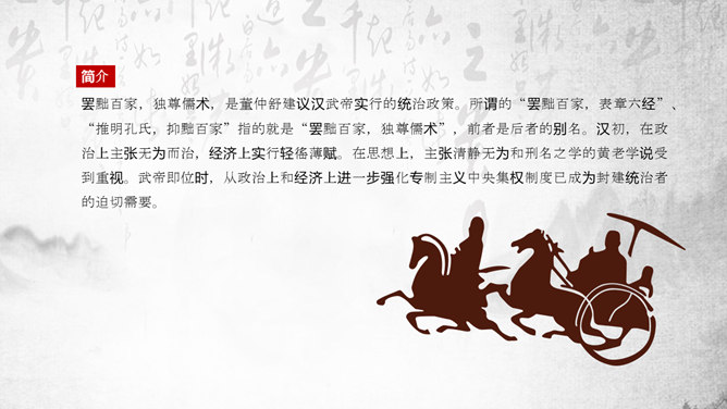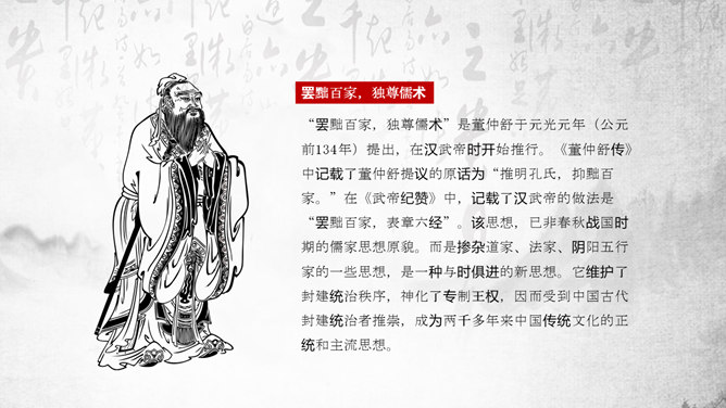 “罢黜百家,独尊儒术”是董仲舒于元光元年(公元前134年)提出,在汉武帝时开始推行。《董仲舒传》中记载了董仲舒提议的原话为“推明孔氏,抑黜百家。”在《武帝纪赞》中,记载了汉武帝的做法是“罢黜百家,表章六经”。该思想,已非春秋战国时期的儒家思想原貌。而是掺杂道家、法家、阴阳五行家的一些思想,是一种与时俱进的新思想。它维护了封建统治秩序,神化了专制王权,因而受到中国古代封建统治者推崇,成为两千多年来中国传统文化的正统和主流思想。罢黜百家,独尊儒术,是董仲舒建议汉武帝实行的统治政策。所谓的“罢黜百家,表章六经”、“推明孔氏,抑黜百家”指的就是“罢黜百家,独尊儒术”,前者是后者的别名。汉初,在政治上主张无为而治,经济上实行轻徭薄赋。在思想上,主张清静无为和刑名之学的黄老学说受到重视。武帝即位时,从政治上和经济上进一步强化专制主义中央集权制度已成为封建统治者的迫切需要。主张清静无为的黄老思想已不能满足上述政治需要,更与汉武帝的好大喜功相抵触;而儒家的春秋大一统思想,仁义思想和君臣伦理观念显然与武帝时所面临的形势和任务相适应。于是,在思想领域,儒家终于取代了道家的统治地位。建元元年(前140年)武帝继位后,丞相卫绾奏言:“所举贤良,或治申、商、韩非、苏秦、张仪之言,乱国政,请皆罢。”得到武帝的同意。