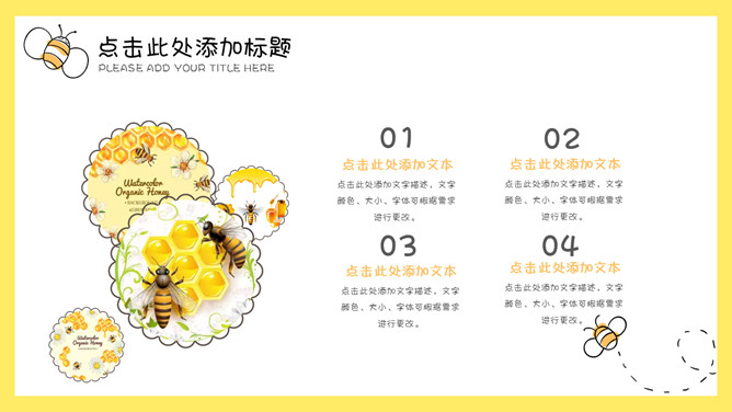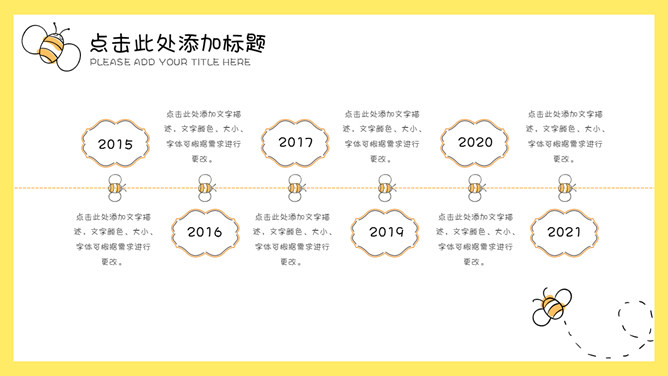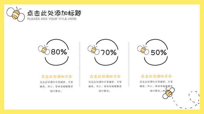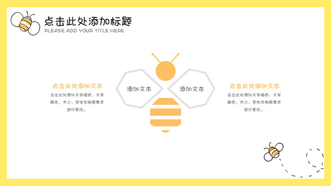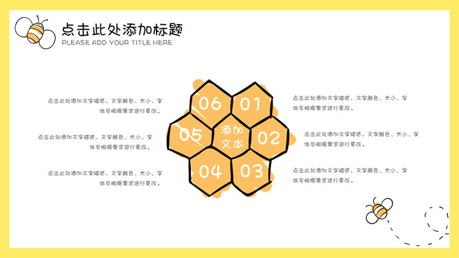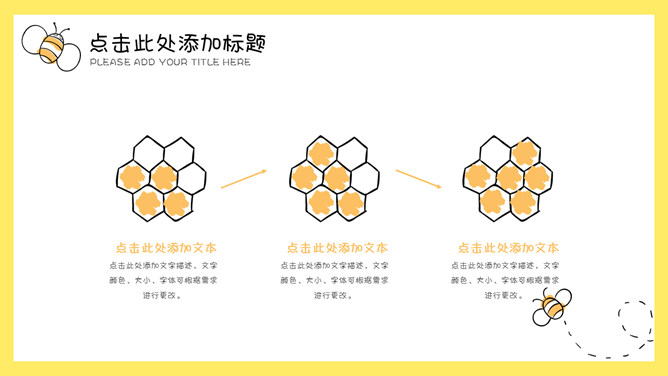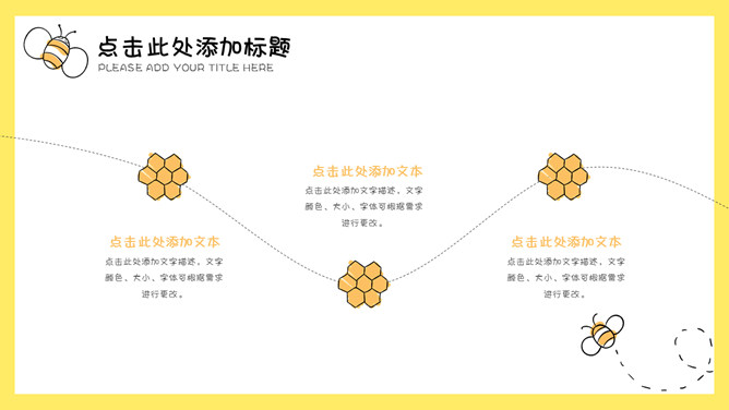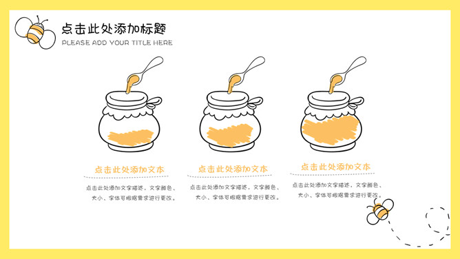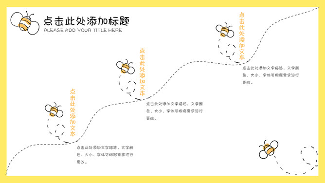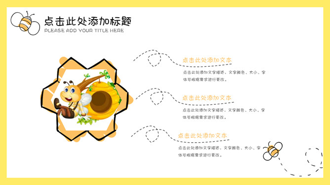 可爱卡通小蜜蜂PPT模板。一套卡通风格幻灯片模板,可爱手绘小蜜蜂主题设计,使用字体: