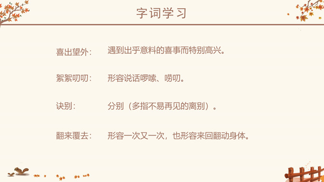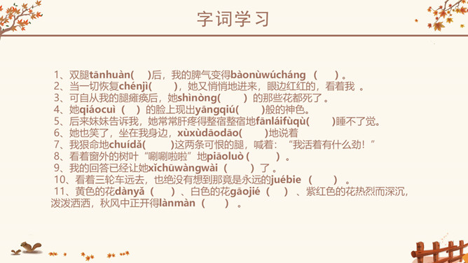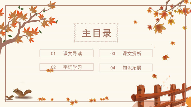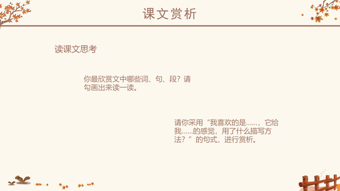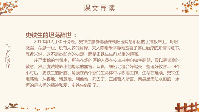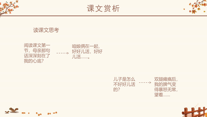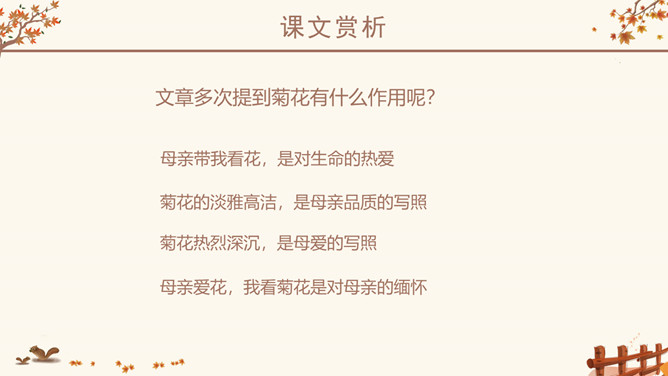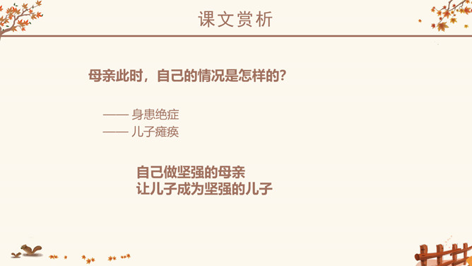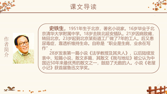 作者简介:史铁生,1951年生于北京,著名小说家。16岁毕业于北京清华大学附属中学。18岁去陕北延安插队。21岁因病致瘫,转回北京。23岁起到北京某街道工厂做了7年的工人。后又患尿毒症,靠透析维持生命。自称是“职业是生病,业余在写作”。28岁发表第一篇小说《法学教授及其夫人》,以后陆续发表中、短篇小说,散文多篇,其散文《我与地坛》被公认为中国近50年来最优秀的散文之一,鼓励了无数的人。小说《老屋小记》获首届鲁迅文学奖。课文几次写到秋天,为什么文章的题目叫“秋天的怀念”?文章两次写到秋天。其原因有:1、“秋天”是背景和引子,是母亲去世的季节;2、 “秋天”是“我”不幸遭遇,暗淡心情的写照,具有象征性;3、在一个秋天妹妹推我去看菊花,“秋天”是“我”悟出母爱,走出低谷乐观生活的象征。以此为题,抒写了对母亲的怀念之情。感知内容,领悟主题:1、双腿瘫痪后,“我”是怎样的状态?2、面对我的暴怒悲观,母亲是怎么说的,又是怎么做的?3、品读第二段,母亲又是怎样对待儿子的?4、母亲此时,自己的情况是怎样的?5、文中多次提到菊花,有何用意?所属专题:秋天的怀念ppt。