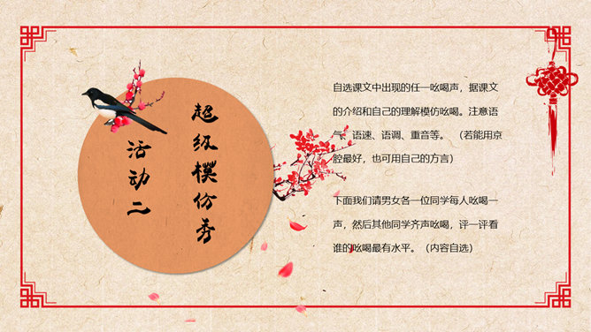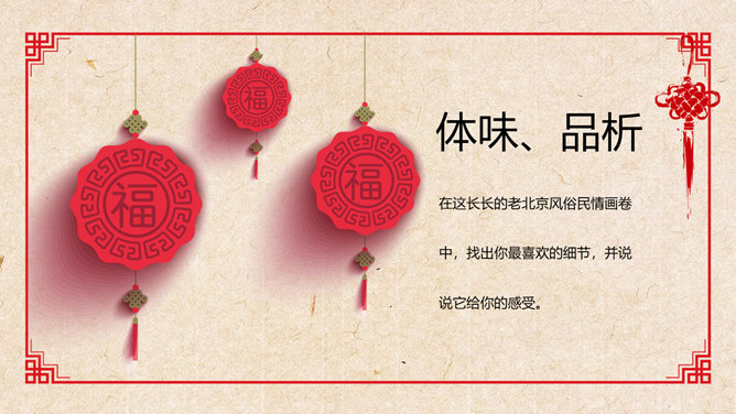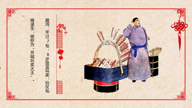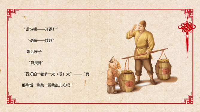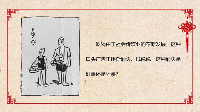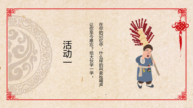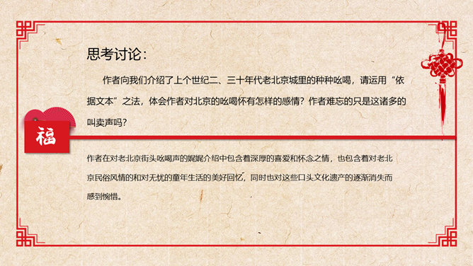 活动一:在你的记忆中,什么样的叫卖吆喝声让你至今难忘?给大伙学一学。思考讨论:作者向我们介绍了上个世纪二、三十年代老北京城里的种种吆喝,请运用“依据文本”之法,体会作者对北京的吆喝怀有怎样的感情?作者难忘的只是这诸多的叫卖声吗?作者在对老北京街头吆喝声的娓娓介绍中包含着深厚的喜爱和怀念之情,也包含着对老北京民俗风情的和对无忧的童年生活的美好回忆,同时也对这些口头文化遗产的逐渐消失而感到惋惜。吆喝由于社会传媒业的不断发展,这种口头广告正逐渐消失。试说说:这种消失是好事还是坏事?自选课文中出现的任一吆喝声,据课文的介绍和自己的理解模仿吆喝。注意语气、语速、语调、重音等。 (若能用京腔最好,也可用自己的方言)下面我们请男女各一位同学每人吆喝一声,然后其他同学齐声吆喝,评一评看谁的吆喝最有水平。(内容自选)