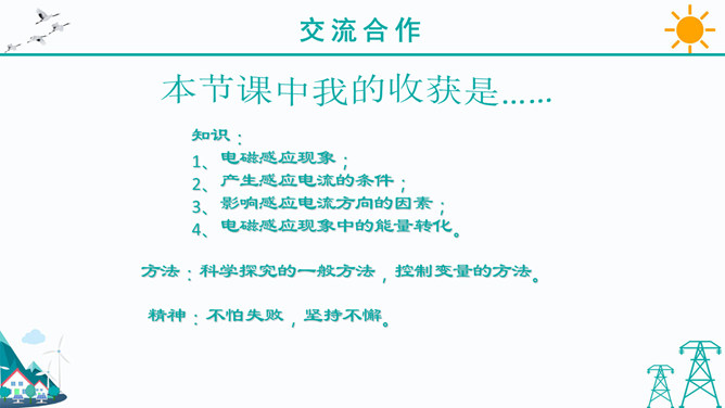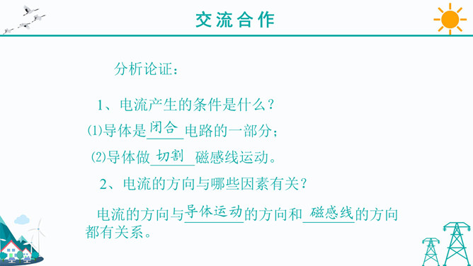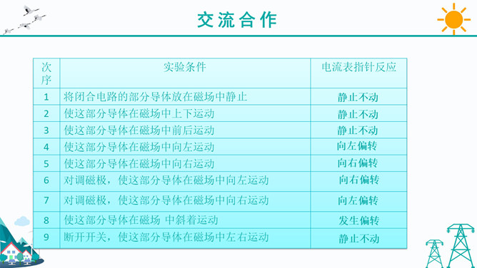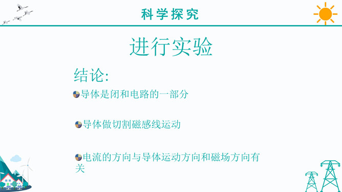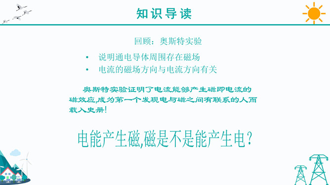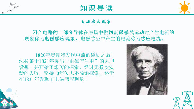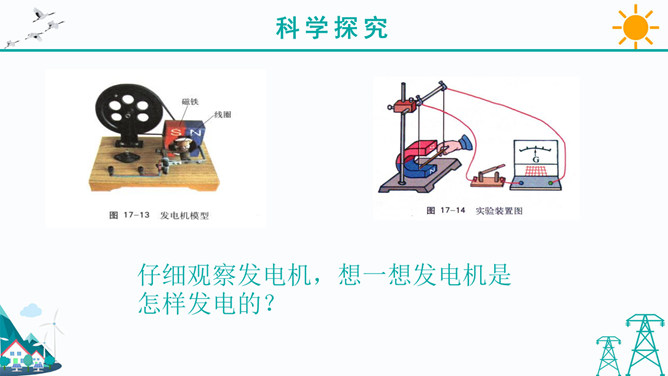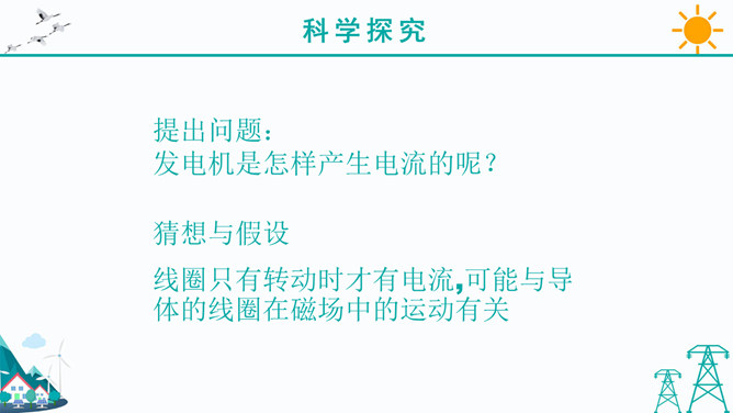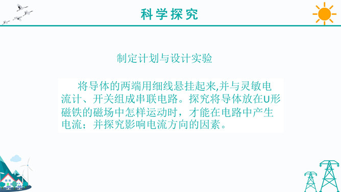 奥斯特实验证明了电流能够产生磁即电流的磁效应,成为第一个发现电与磁之间有联系的人而载入史册!电能产生磁,磁是不是能产生电?闭合电路的一部分导体在磁场中做切割磁感线运动时产生电流的现象称为电磁感应现象,电磁感应中产生的电流称为感应电流。1820年奥斯特发现电流的磁场之后,法拉第于1821年提出“由磁产生电”的大胆设想,并开始了艰苦的探索。经过无数次实验的失败,坚持10年矢志不渝地探索,终于在1831年发现了电磁感应现象。仔细观察发电机,想一想发电机是怎样发电的?提出问题:发电机是怎样产生电流的呢?猜想与假设线圈只有转动时才有电流,可能与导体的线圈在磁场中的运动有关。将导体的两端用细线悬挂起来,并与灵敏电流计、开关组成串联电路。探究将导体放在U形磁铁的磁场中怎样运动时,才能在电路中产生电流;并探究影响电流方向的因素。