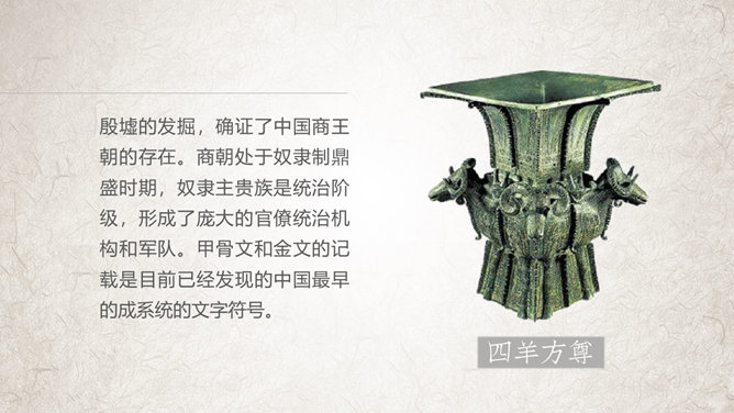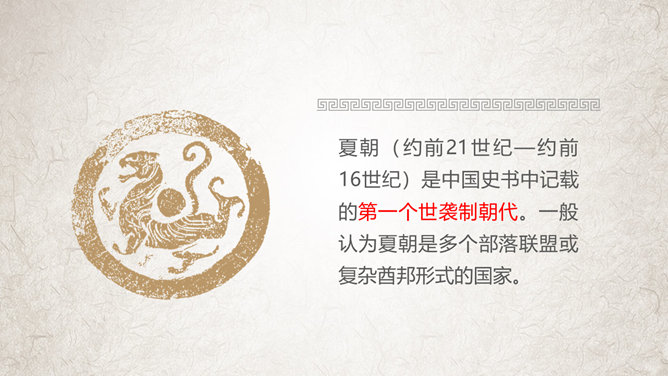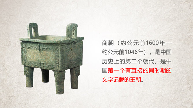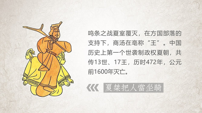 夏朝(约前21世纪—约前16世纪)是中国史书中记载的第一个世袭制朝代。一般认为夏朝是多个部落联盟或复杂酋邦形式的国家。根据史书记载,禹传位于子启,改变了原始部落的禅让制,开创中国近四千年世袭的先河。因此中国历史上的“家天下”,从夏朝的建立开始。相传,夏朝初年,大禹划分天下为九州,铸造九鼎,象征九州,将全国九州的名山大川、奇异之物镌刻于九鼎之身,以一鼎象征一州,并将九鼎集中于夏王朝都城。鸣条之战夏室覆灭,在方国部落的支持下,商汤在亳称“王”。中国历史上第一个世袭制政权夏朝,共传13世、17王,历时472年,公元前1600年灭亡。桀文武双全,但荒淫无度,暴虐无道。商汤在名相伊尹谋划下,起兵伐桀,汤先攻灭桀的党羽豕韦、顾国,击败昆吾国,然后直逼夏朝重镇鸣条。桀被汤俘获,放逐于南巢,夏朝覆亡。数年后死于南巢。商朝(约公元前1600年—约公元前1046年),是中国历史上的第二个朝代,是中国第一个有直接的同时期的文字记载的王朝。夏朝方国商国君主商汤率方国于鸣条之战灭夏后,以“商”为国号 ,在亳(今商丘)建立商朝。之后,商朝国都频繁迁移,至其后裔盘庚迁殷(今安阳)后国都才稳定下来,在殷建都达273年,因此商朝又被后世称为“殷”或“殷商”。