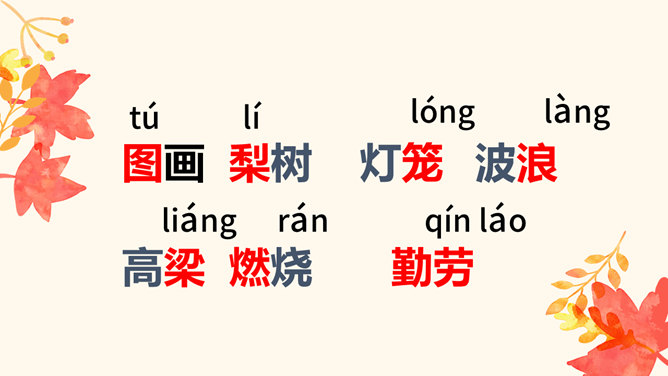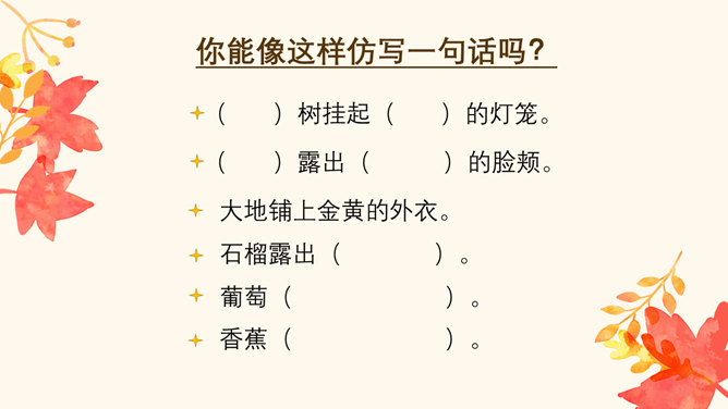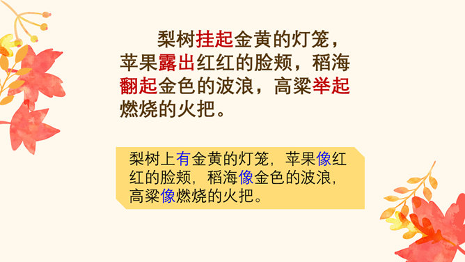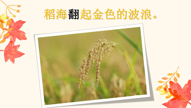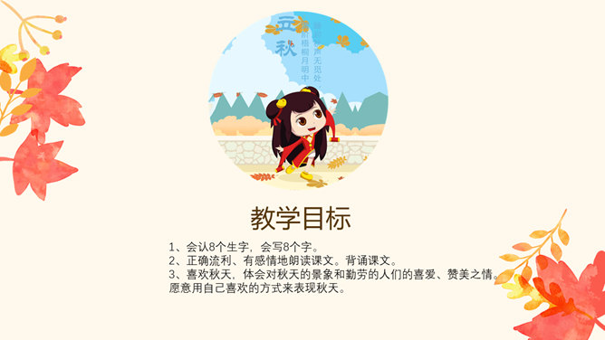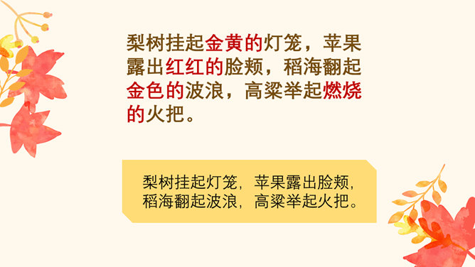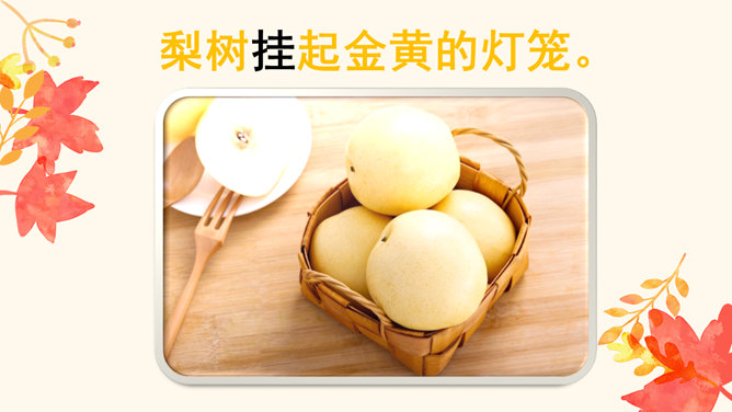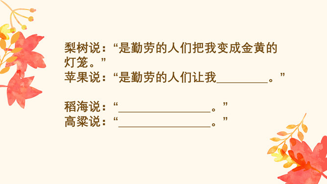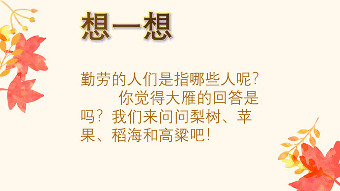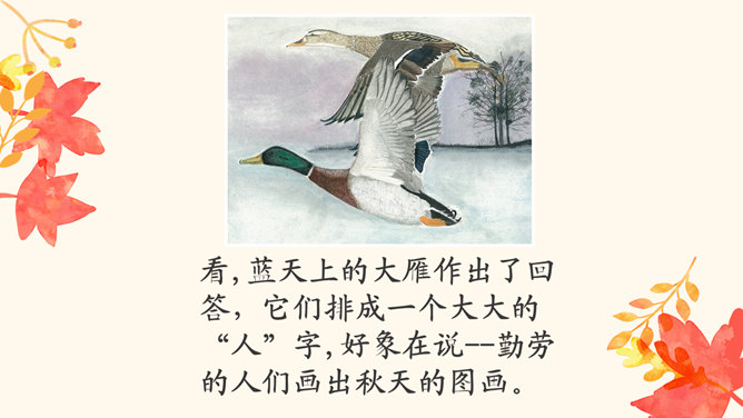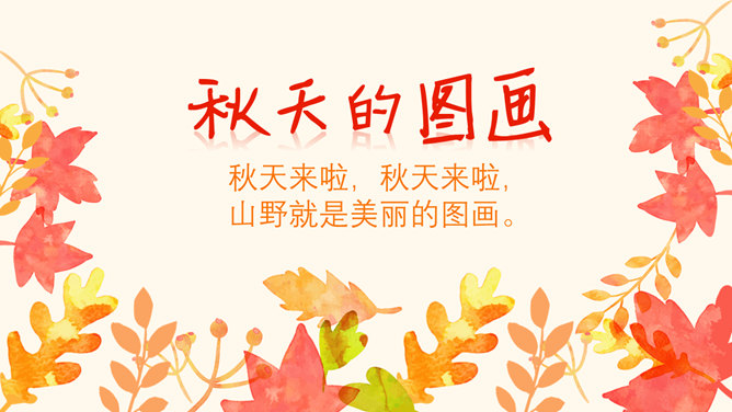 教学目标:1、会认8个生字,会写8个字。2、正确流利、有感情地朗读课文。背诵课文。3、喜欢秋天,体会对秋天的景象和勤劳的人们的喜爱、赞美之情。愿意用自己喜欢的方式来表现秋天。想一想:勤劳的人们是指哪些人呢?你觉得大雁的回答是吗?我们来问问梨树、苹果、稻海和高粱吧!朗读感悟:1、教师范读,学生注意体会教师在朗读中表达的喜爱与赞美的情感。2、学生自由读,一边读一边想象秋天的图画。3、小组内读,说说自己的感受。4、小组内选出自己喜欢的句子来读,并说说为甚么喜欢。5、比赛读,看谁读得美。6、寻找自己喜欢的学习小伙伴,读喜欢的句子。7、看着画面用自己的话说说秋天,再试着背诵。推荐栏目:秋天的图画ppt。