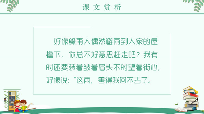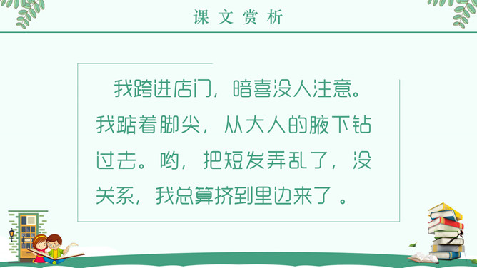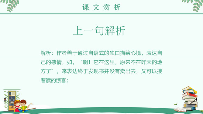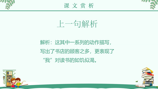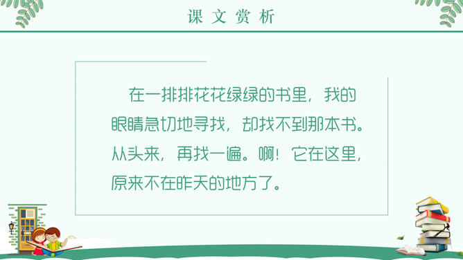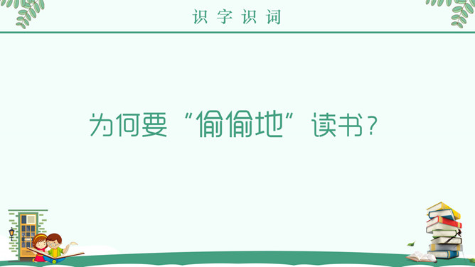 “窃读”是什么意思?为何要“偷偷地”读书? 接下来让我们带着问题阅读全文。“急忙打开书,一页,两页,我像一匹饿狼,贪婪地读着。”这句话把什么比作什么?表现了什么?答案:把“我”比作“饿狼”,表现出作者如饥似渴地读书。课后作业:读了课文,你知道童年的林海英是怎样读书的吗?文章中有很多精彩语句,请圈画出来,并说说看你喜欢它们的理由。所属专题:窃读记ppt。