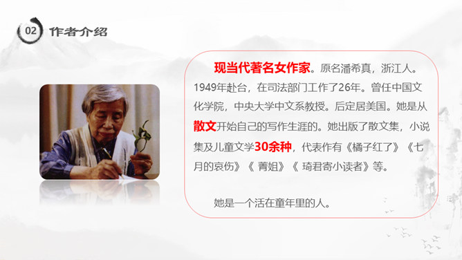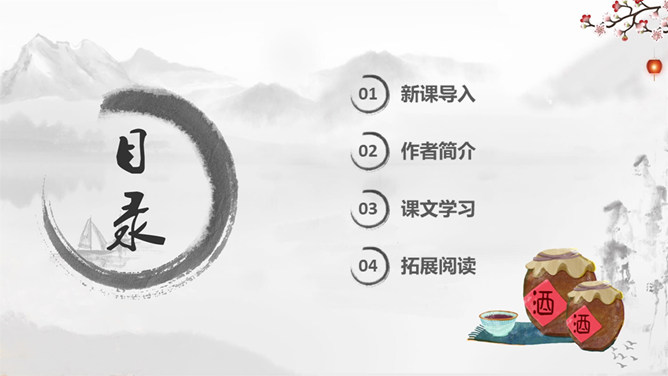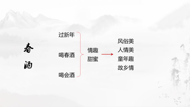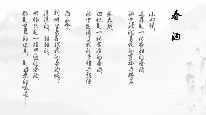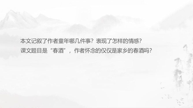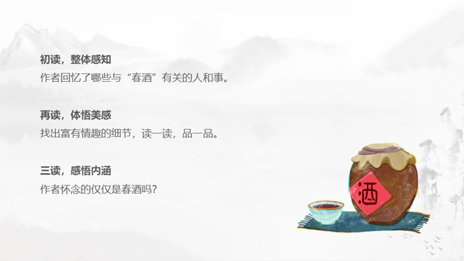 琦君,现当代著名女作家。原名潘希真,浙江人。1949年赴台,在司法部门工作了26年。曾任中国文化学院,中央大学中文系教授。后定居美国。她是从散文开始自己的写作生涯的。她出版了散文集,小说集及儿童文学30余种,代表作有《橘子红了》《七月的哀伤》《 菁姐》《 琦君寄小读者》等。她是一个活在童年里的人。教学目标:1.深情地朗读课文,体会作者思乡的情感。2.品味文中的细节和关键词语,加深对文章的理解。3.感受文中的风俗美、人情美,丰富精神世界,获得思想启迪。初读,整体感知作者回忆了哪些与“春酒”有关的人和事。再读,体悟美感找出富有情趣的细节,读一读,品一品。三读,感悟内涵作者怀念的仅仅是春酒吗?本文记叙了作者童年哪几件事?表现了怎样的情感?课文题目是“春酒”,作者怀念的仅仅是家乡的春酒吗?精读文章,才能品味出其中的情感和趣味,才能更加深刻地理解作者对童年、对故乡的无限眷恋,才能提升自己的美好的生活情趣。